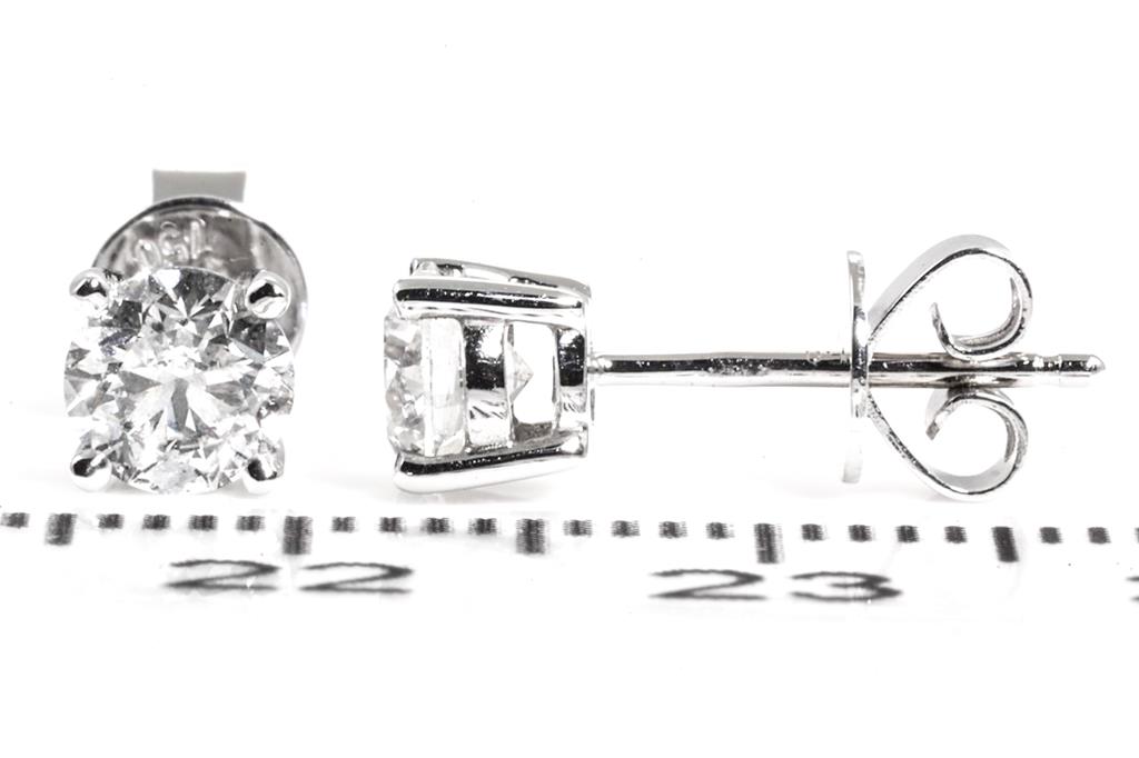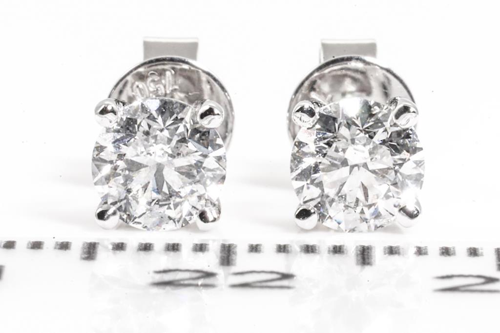 Diamond stud earrings with 2 round brilliant cut Diamonds totalling 1.02cts (Estimated grading: E-F P1). 18ct white gold. Weight: 1.5g. With certificate #415392. (New)