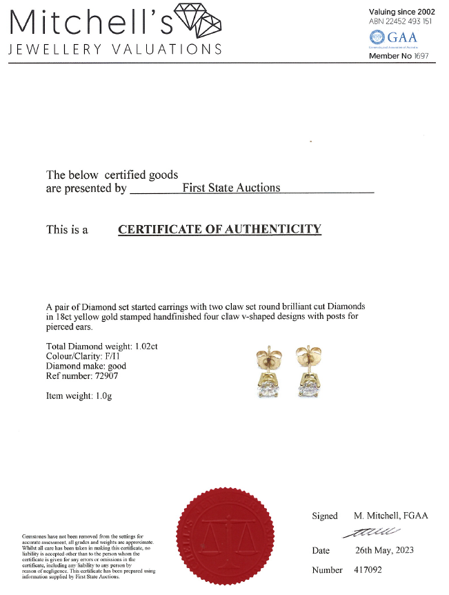 Diamond stud earrings with 2 round brilliant cut Diamonds totalling 1.02cts (Estimated grading: F P1). 18ct yellow gold. Weight: 1.0g. With certificate #417092. (New)