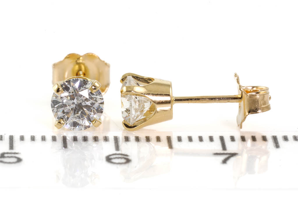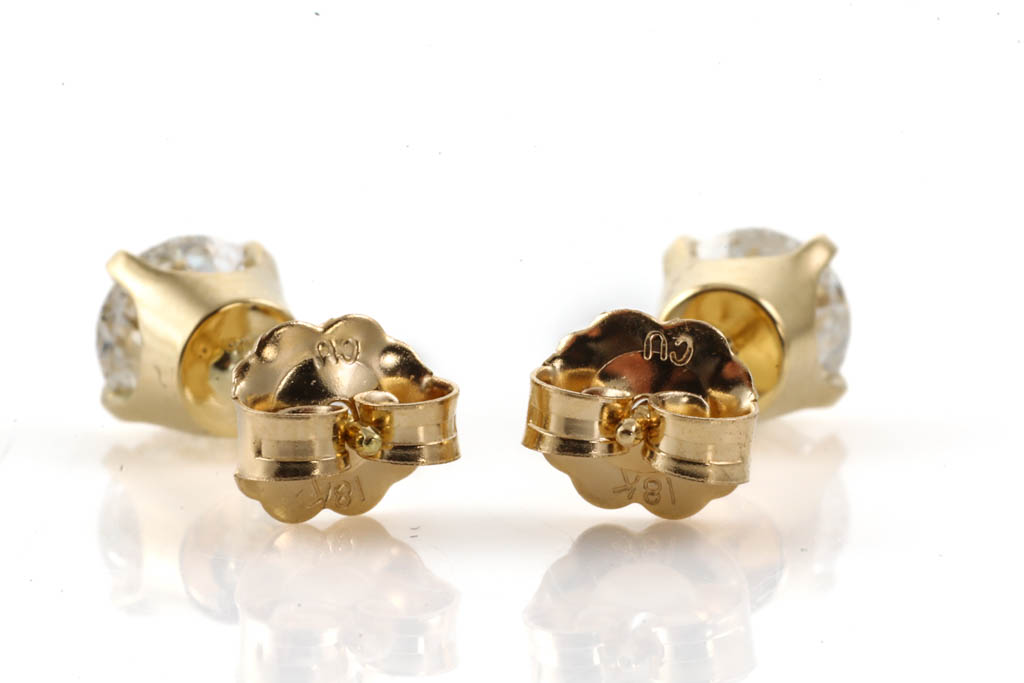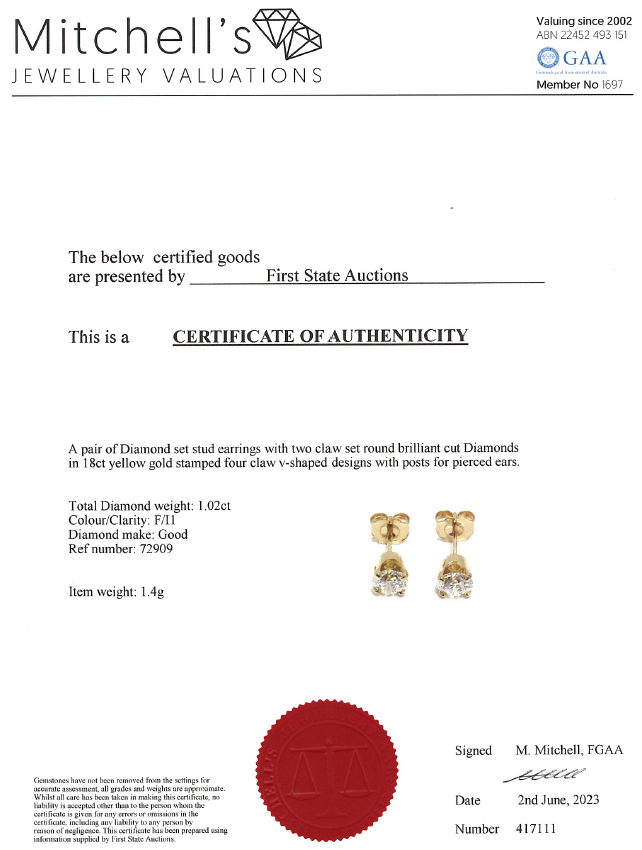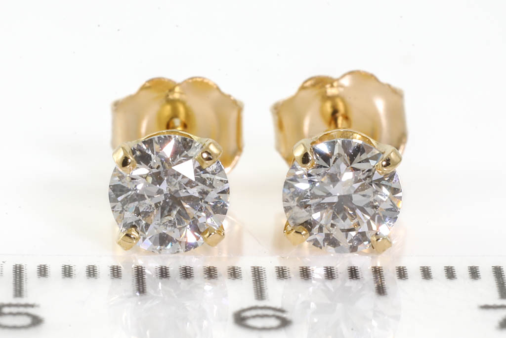 Diamond stud earrings with 2 round brilliant cut Diamonds totalling 1.02cts (Estimated grading: F P1). 18ct yellow gold. Weight: 1.4g. With certificate #417111. (New)