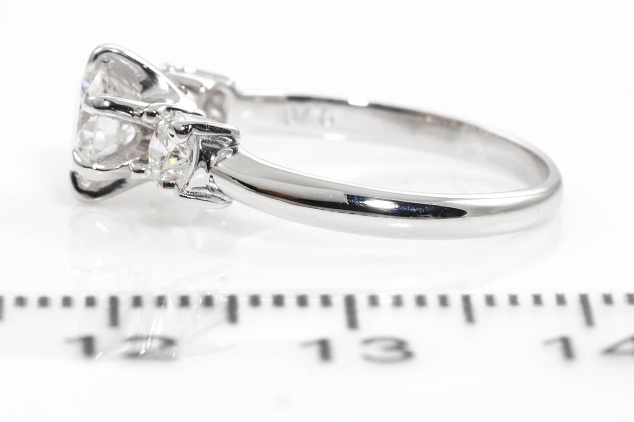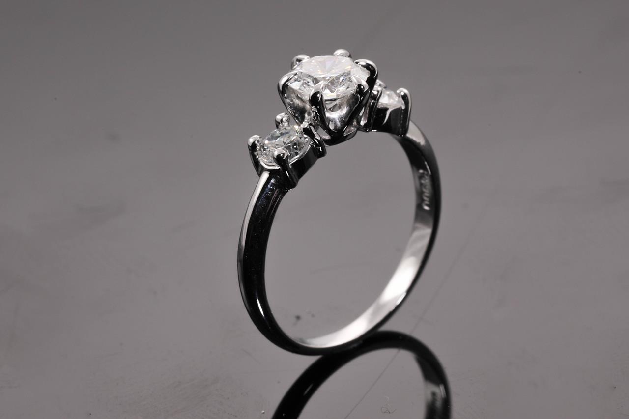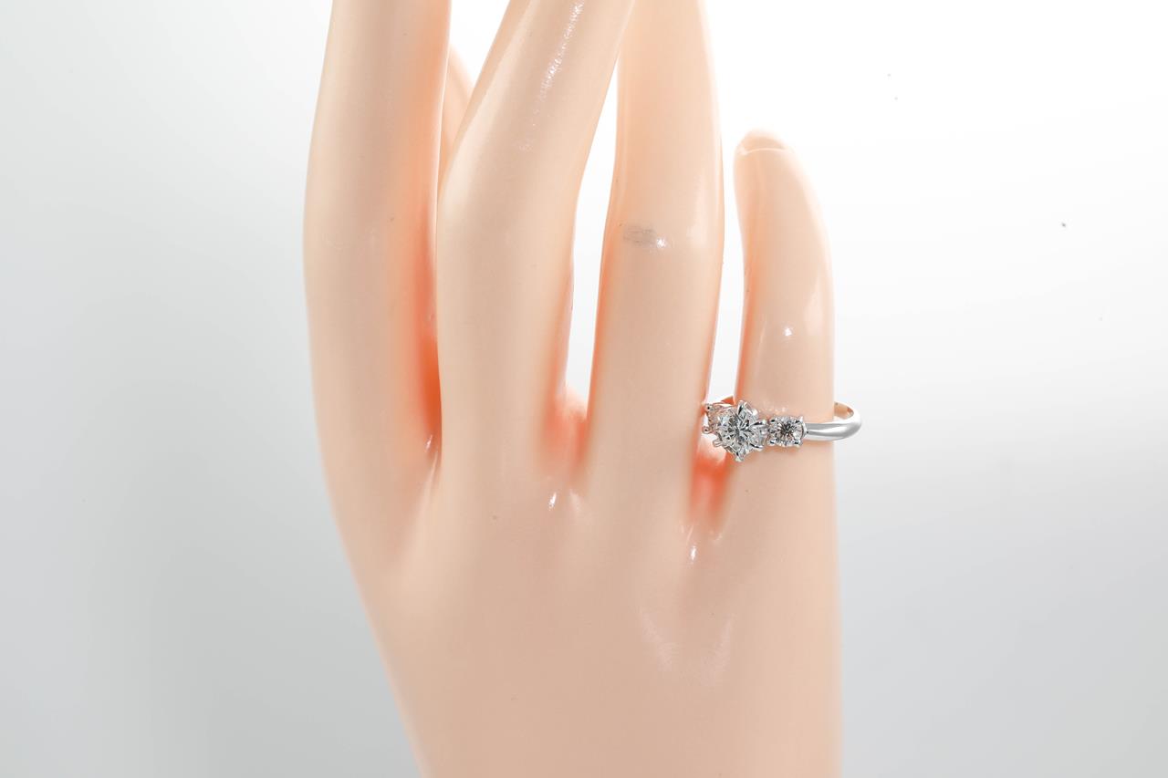Diamond Trilogy ring with centre round brilliant cut diamond of 0.62ct (Estimated grading: G P1) and 2 shoulder diamonds totalling 0.40cts (Estimated grading: G-H SI-P1). Platinum. Ring size: J. Weight: 3.3g (Pre-owned)