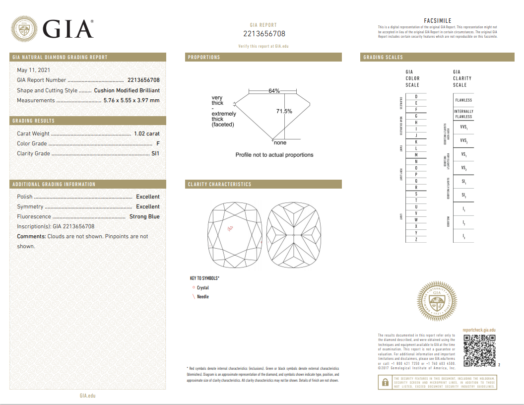 A loose Cushion Cut Diamond of 1.02ct (with GIA report graded as F SI1 #2213656708). (New)