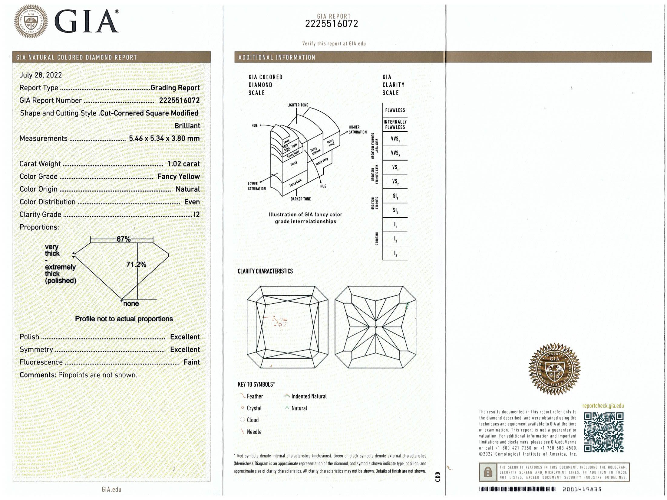 A loose radiant cut Diamond of 1.02ct (With GIA report graded as Natural Fancy Yellow Even P2 #2225516072). (New)