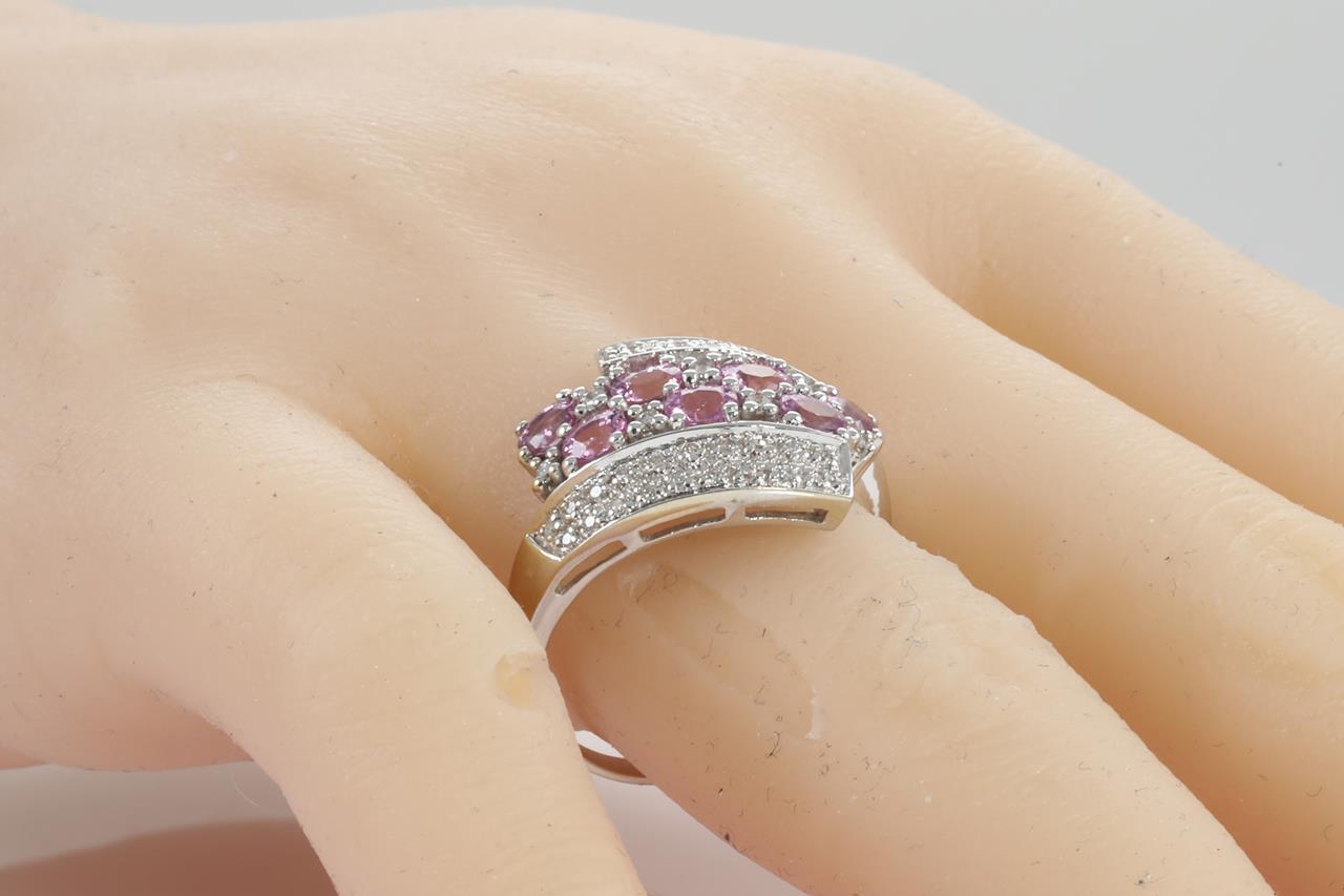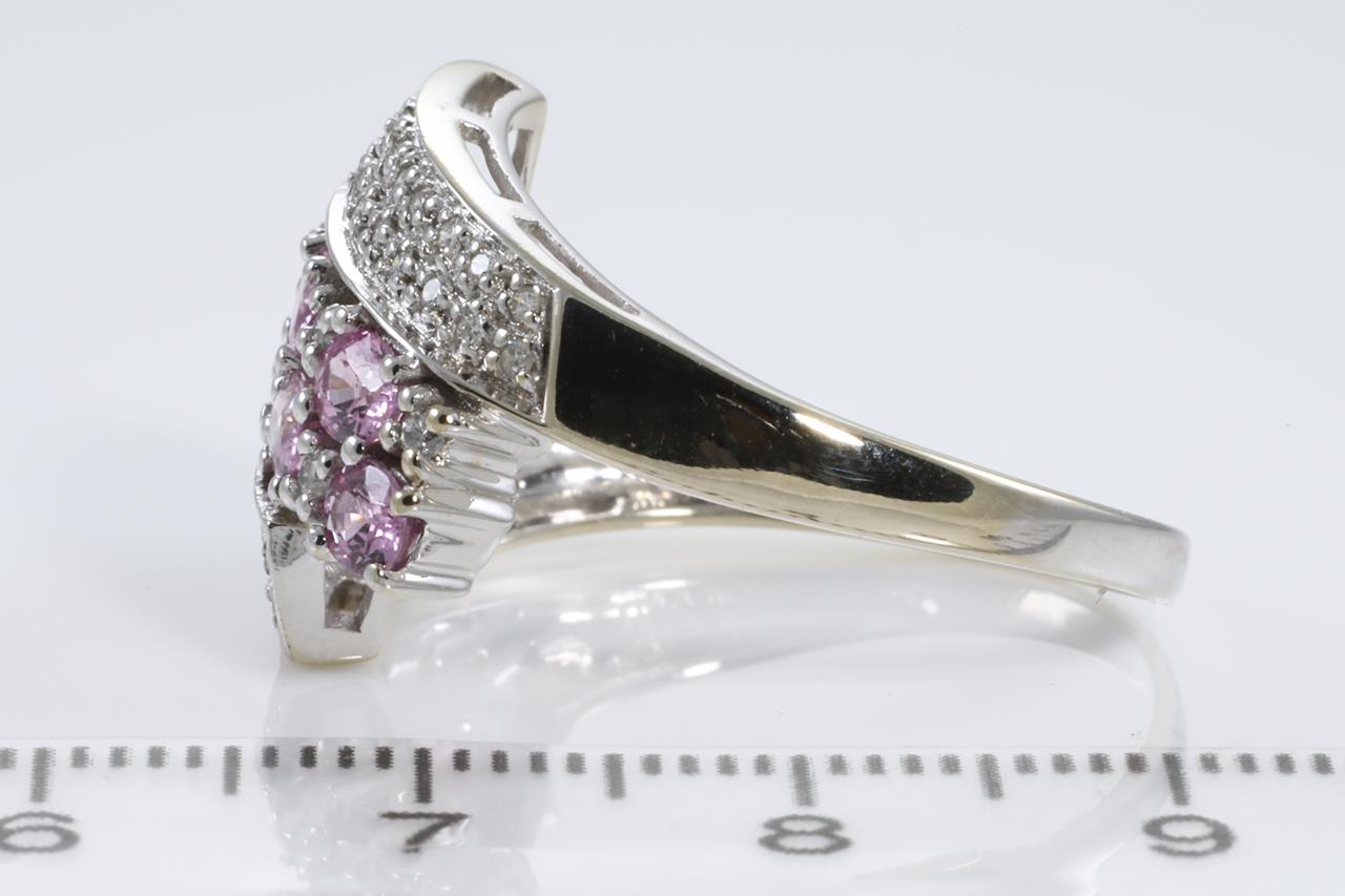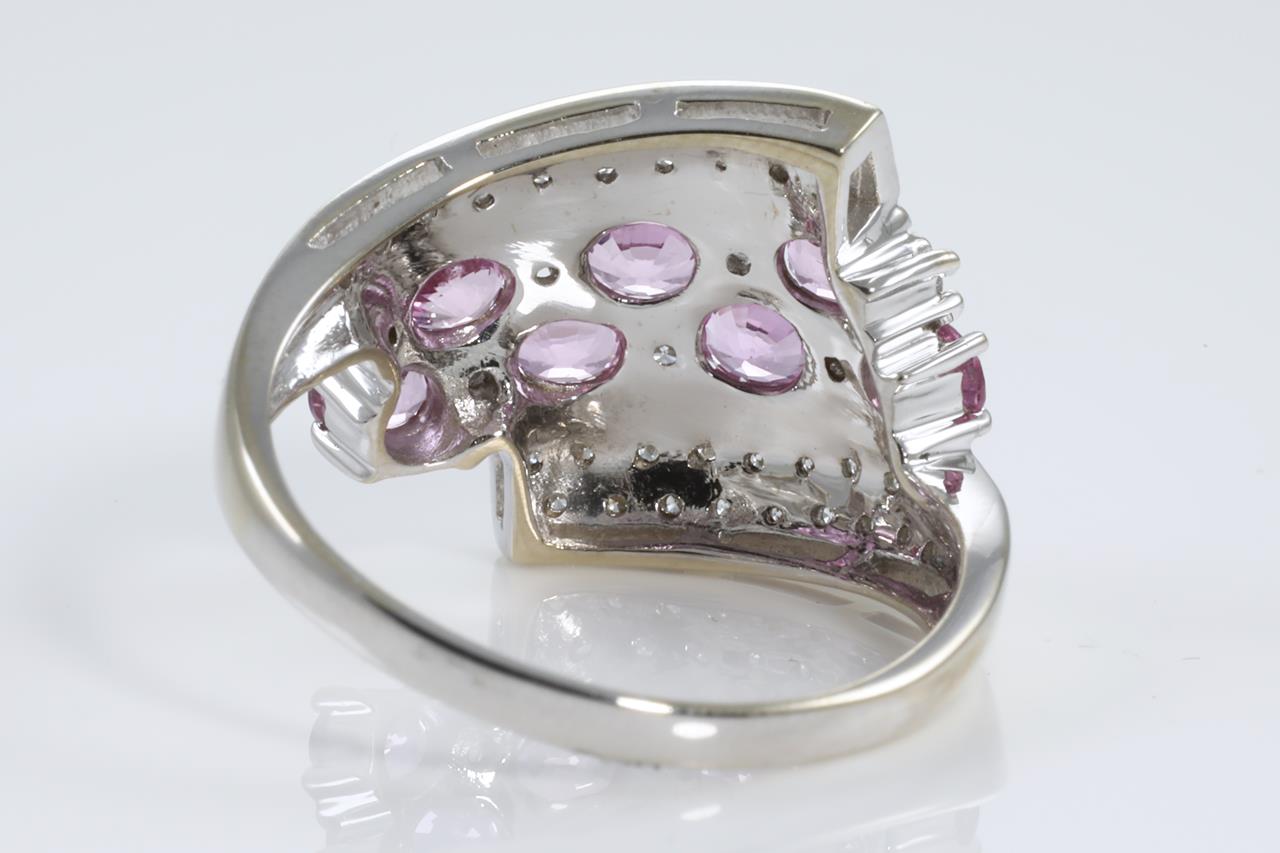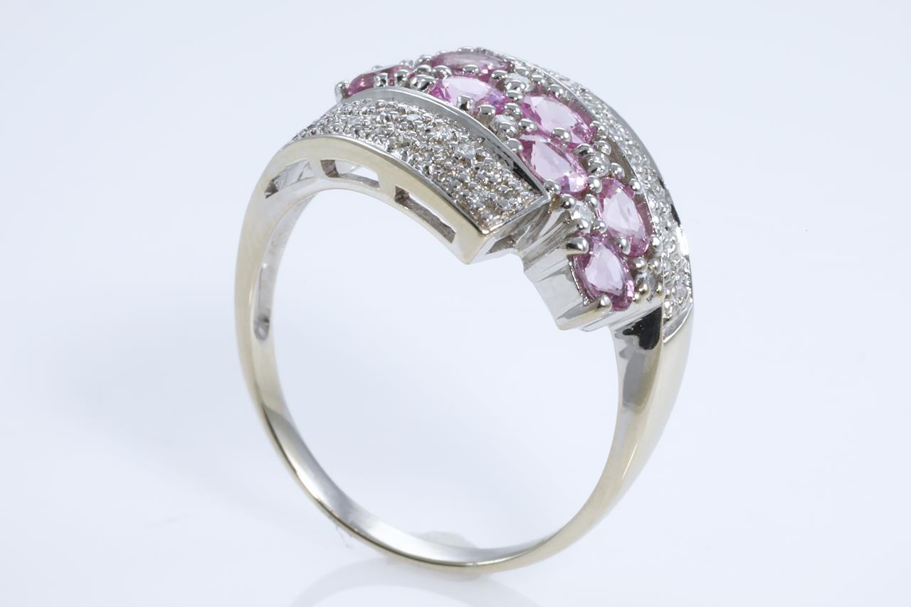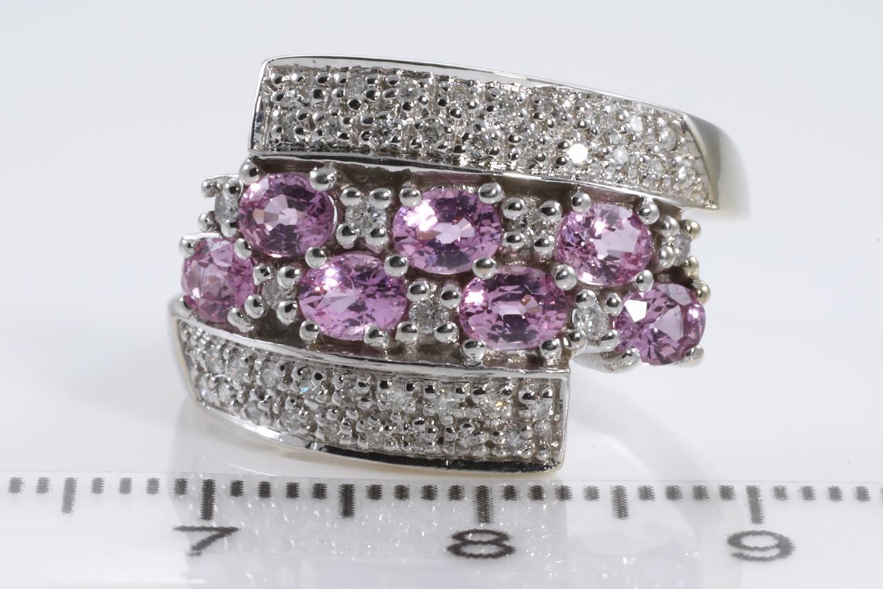 Sapphire and Diamond ring with 7 oval shape pink Sapphires totalling 1.02cts and Diamonds totalling 0.28cts. 14ct white white gold. Ring size T1/2. Weight: 5.8g (As New)