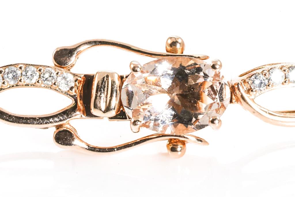 Morganite and Diamond bracelet with oval Morganite totalling 10.30cts and round Diamonds totalling 0.38cts (Estimated grading: H P1). 14ct rose gold. Length: 18.5cm. Weight: 9.3g. (As new)