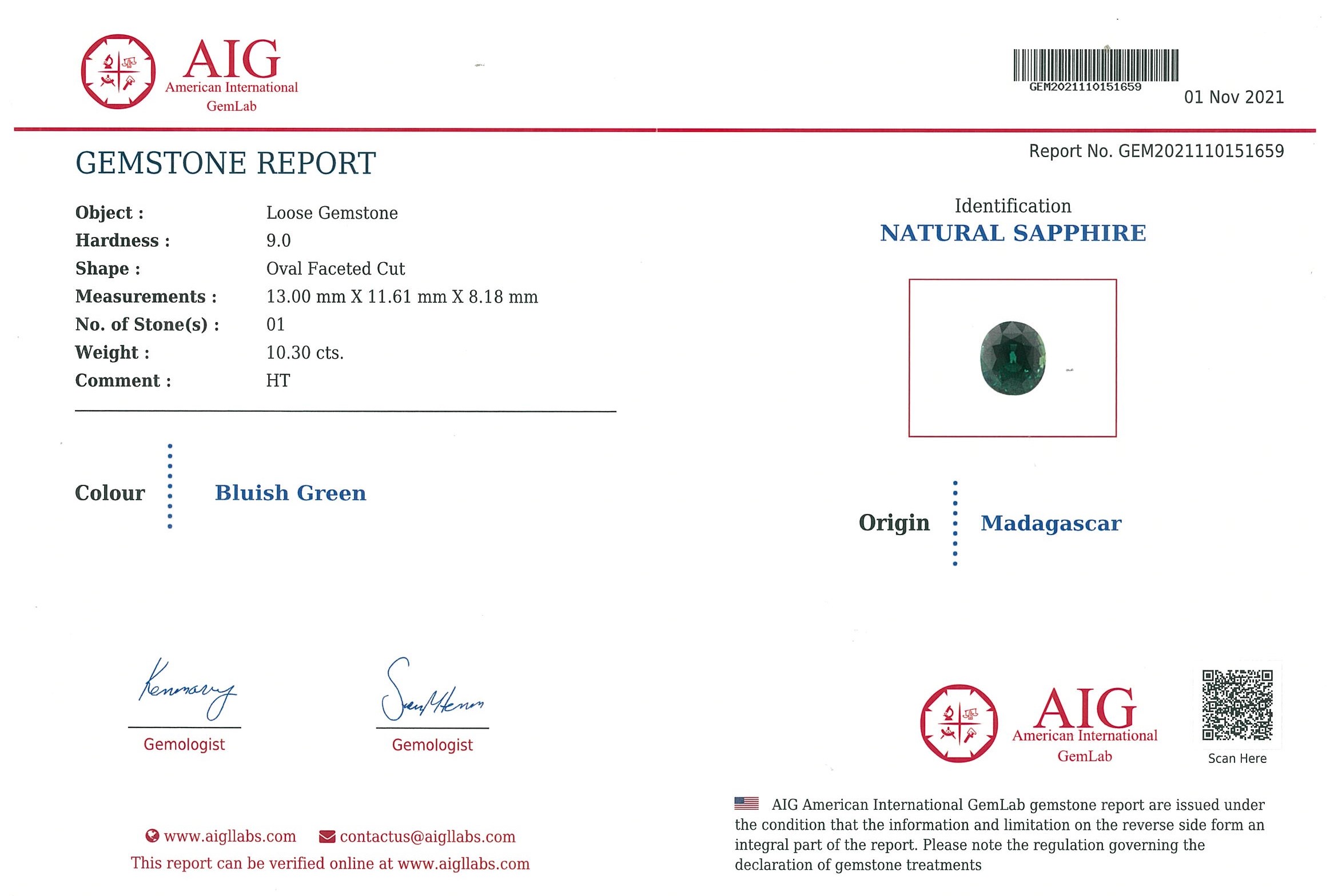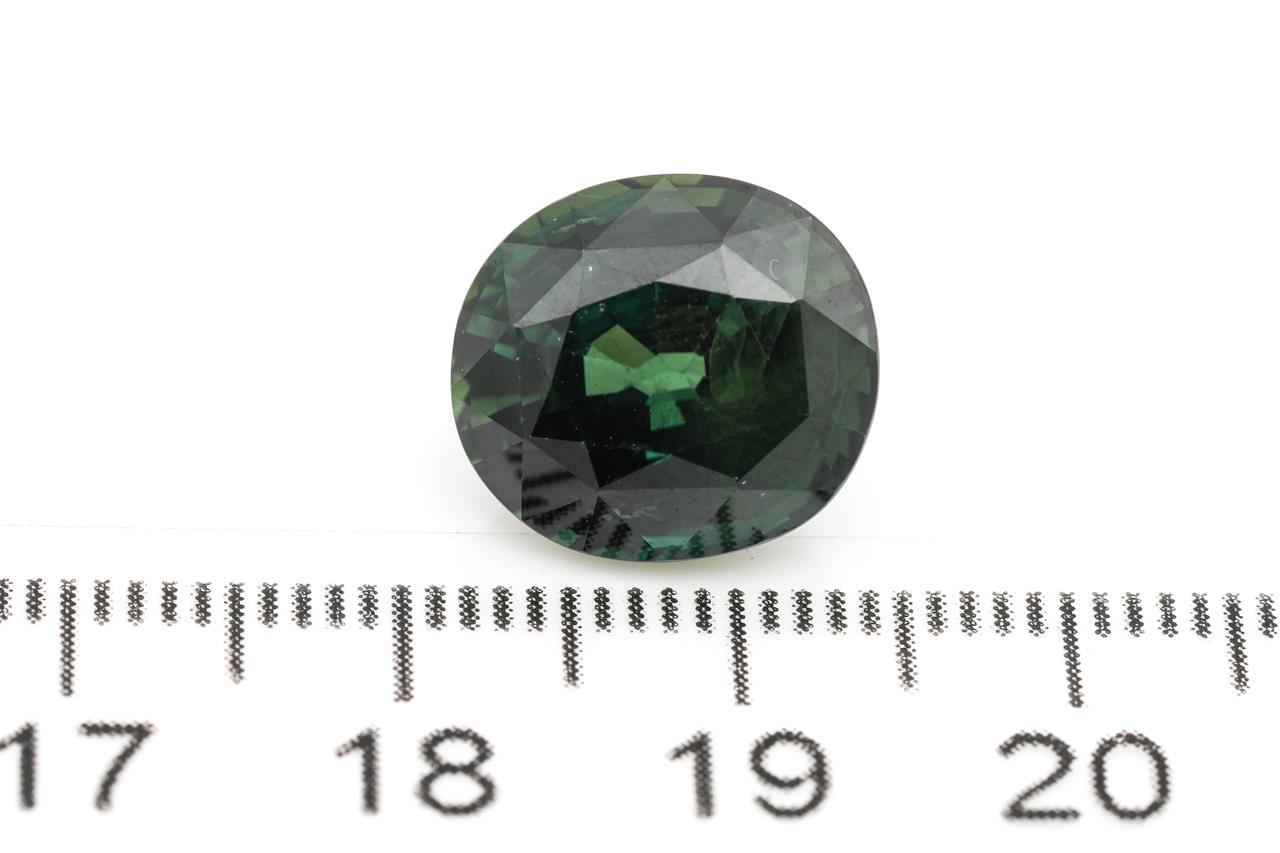 A loose oval cut bluish green Sapphire of 10.32ct. Dimensions: 13.00 x 11.61 x 8.18mm. With AIG report GEM2021110151659. (As New)