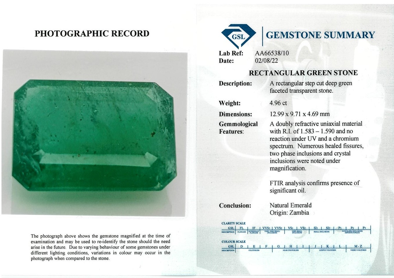 A loose pair of emerald cut Zambian Emeralds totalling 10.35cts (both with GSL summary reports #AA66538/10, AA66538/10). (As new)