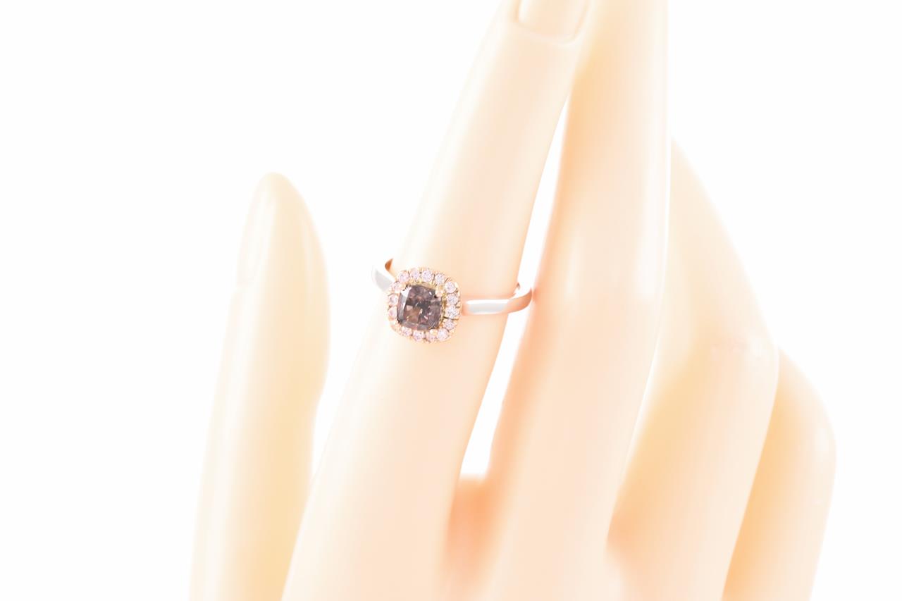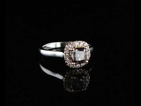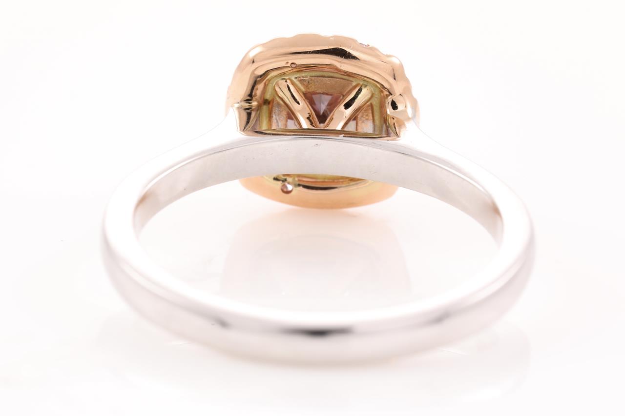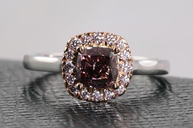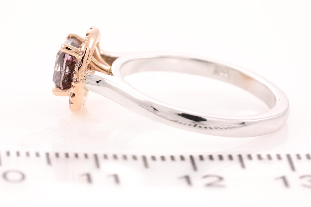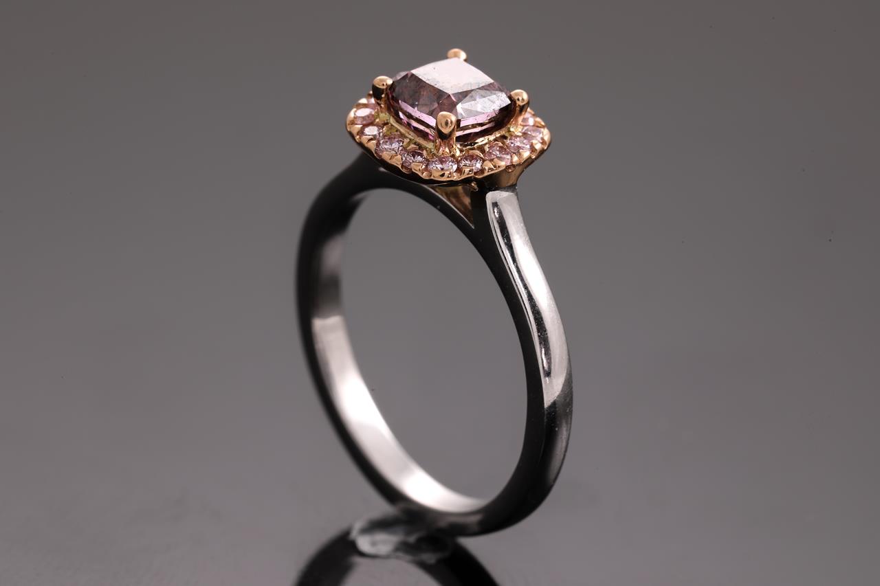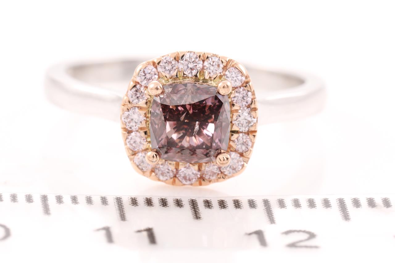 Diamond halo ring with centre cushion cut Diamond of 1.03ct (with GIA report graded as Natural Fancy Dark Pink-Brown Even P1 #2203694919) and 16 surrounding fancy light pink Diamonds totalling 0.20cts (Argyle lot number: 397904 & 409778). 18ct white & rose gold. Ring size L1/2. Weight 4.3g. (New)