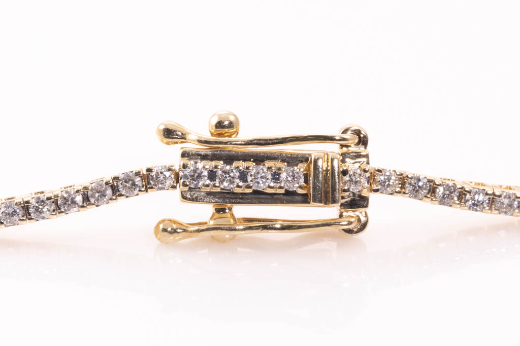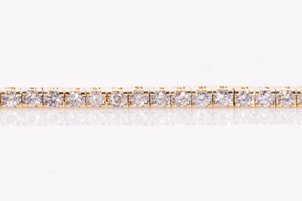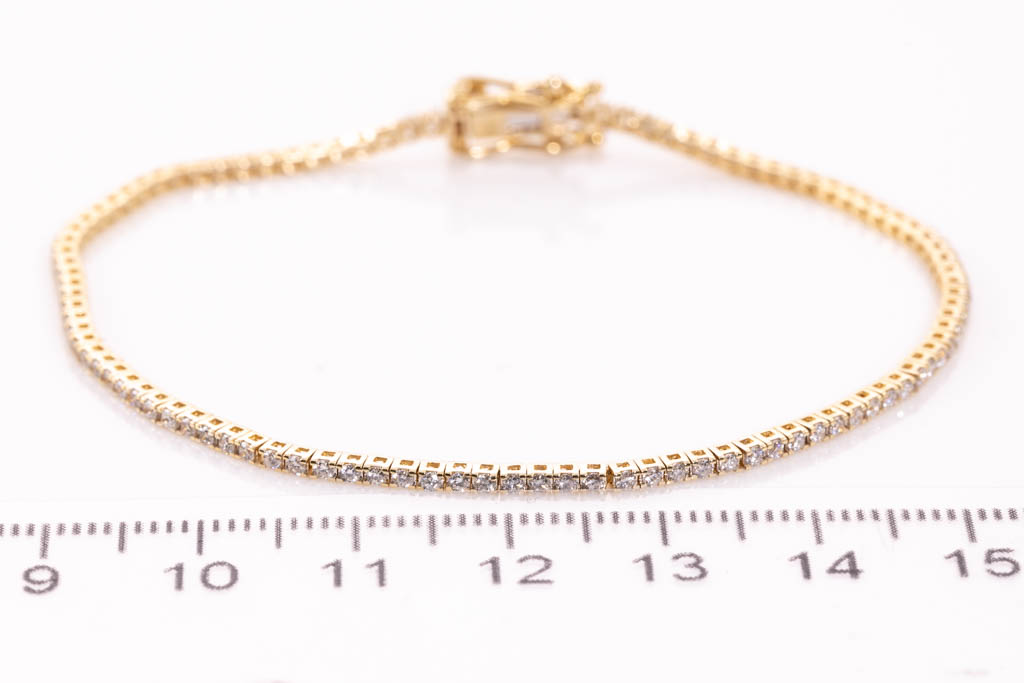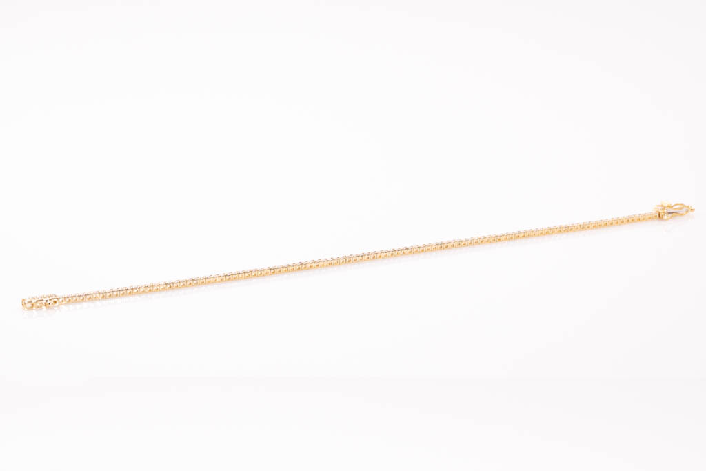 Diamond tennis bracelet with 102 round Diamonds totalling 1.03cts (Estimated grading: H-I SI). 14ct yellow gold. Length: 18cm. Weight: 4.8g. (New)