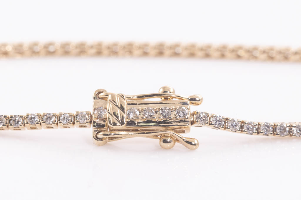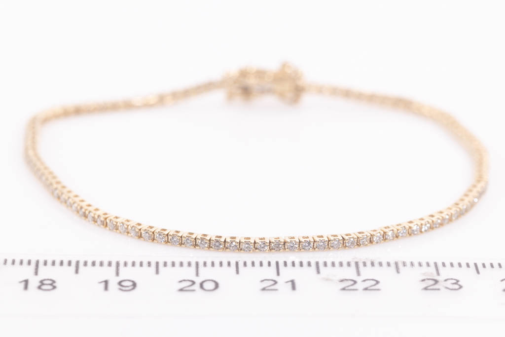 Diamond tennis bracelet with 102 round Diamonds totalling 1.03cts (Estimated grading: H SI). 14ct yellow gold. Length: 15.5cm. Weight: 5.2g. (New)