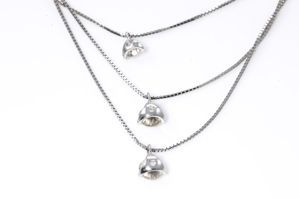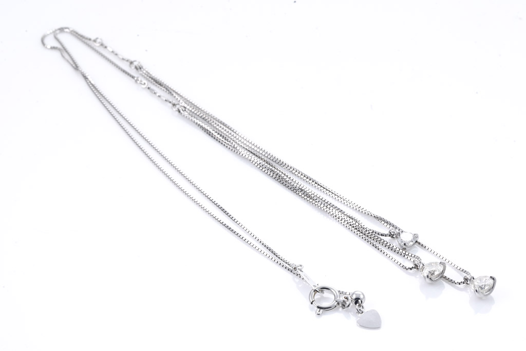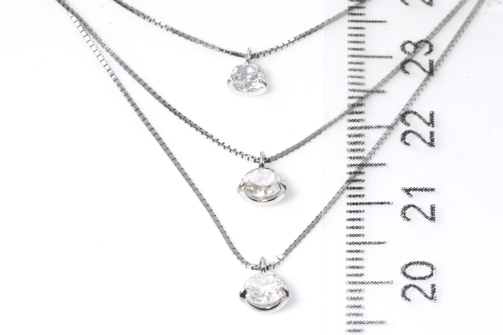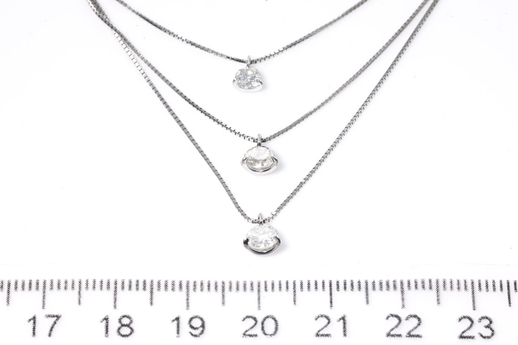 Diamond necklace with 3 round Diamonds totalling 1.03cts (Estimated grading: I-J P1-P2). 18ct white gold with 18ct white gold adjustable chain. Length: 44cm. Weight: 3.7g. (Pre-owned)