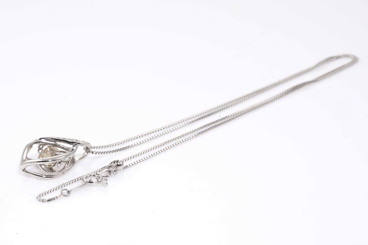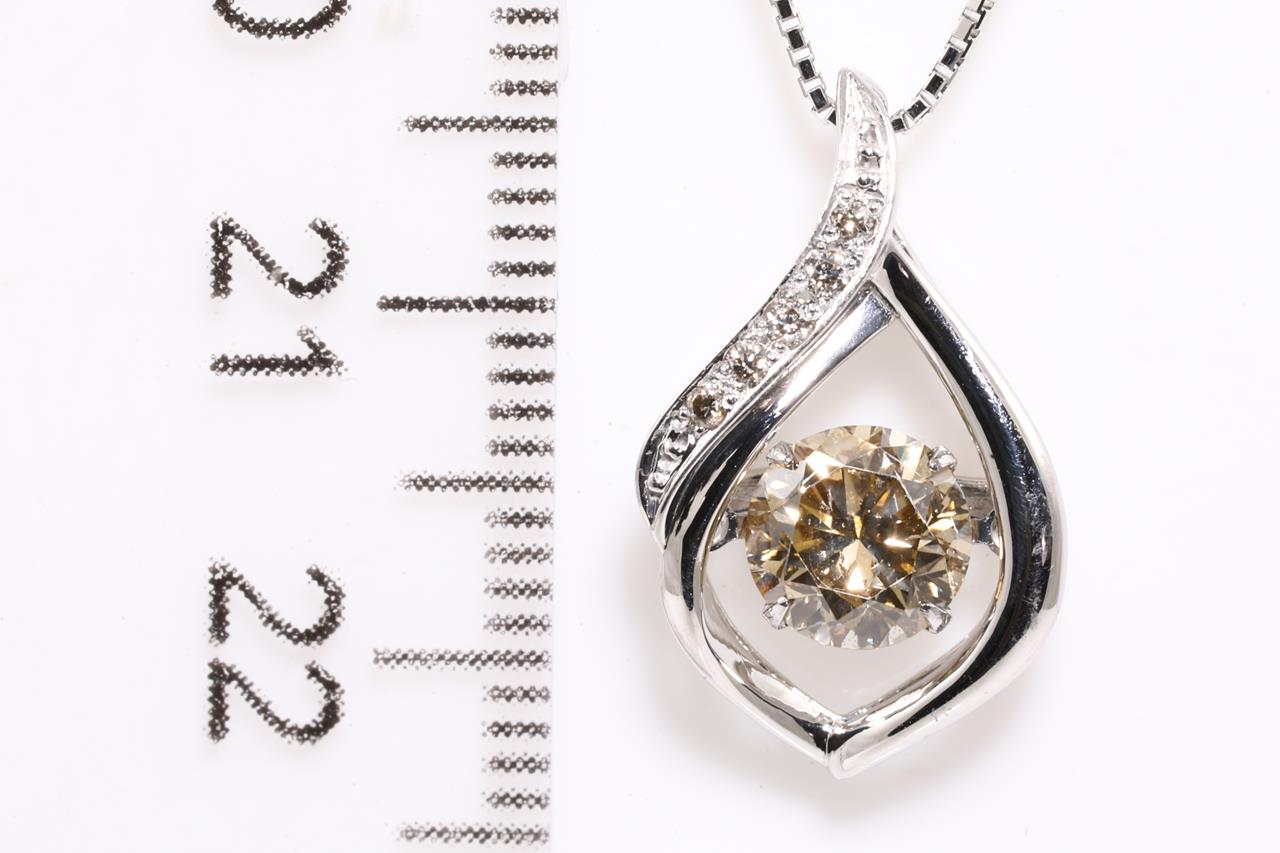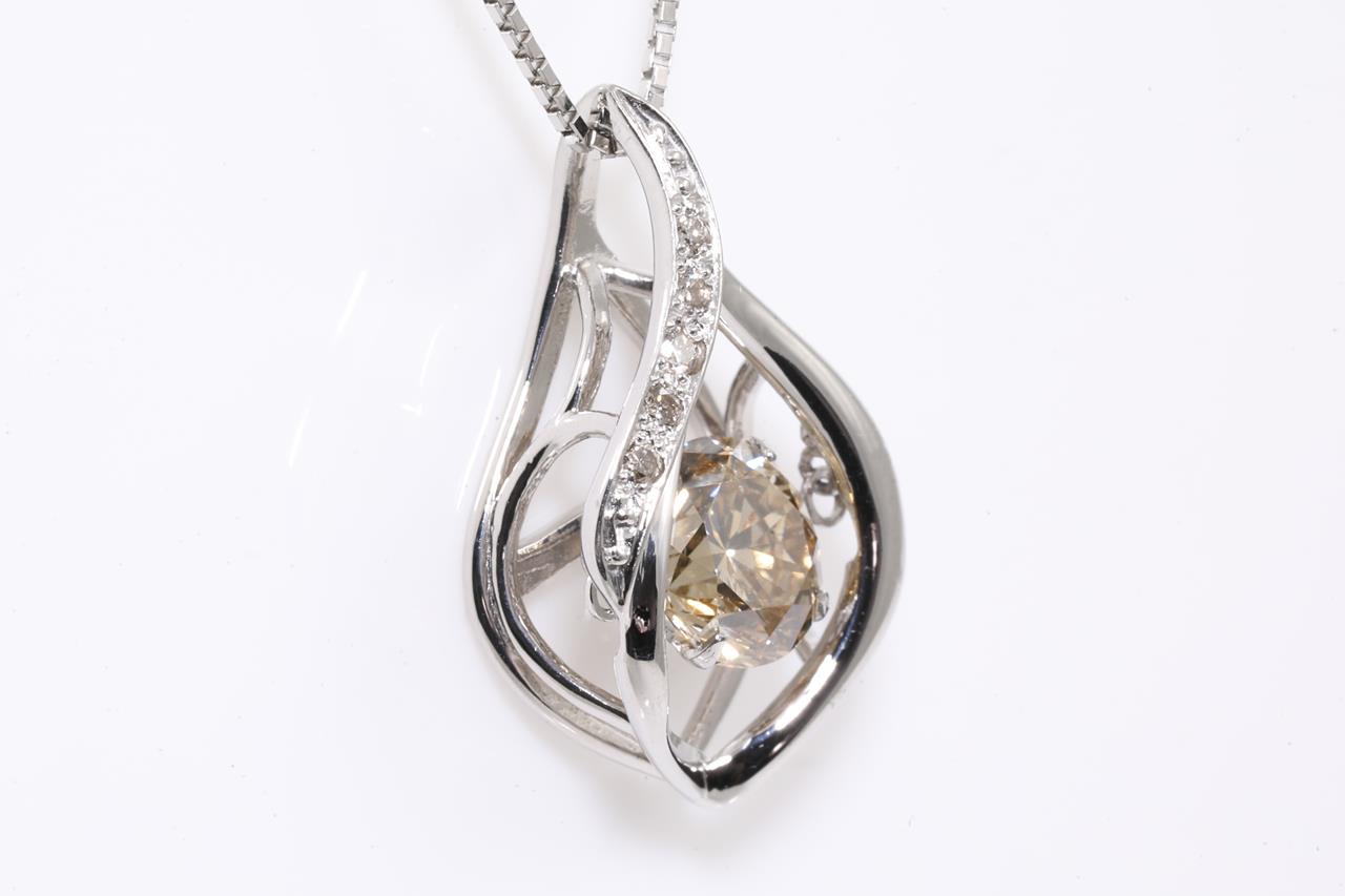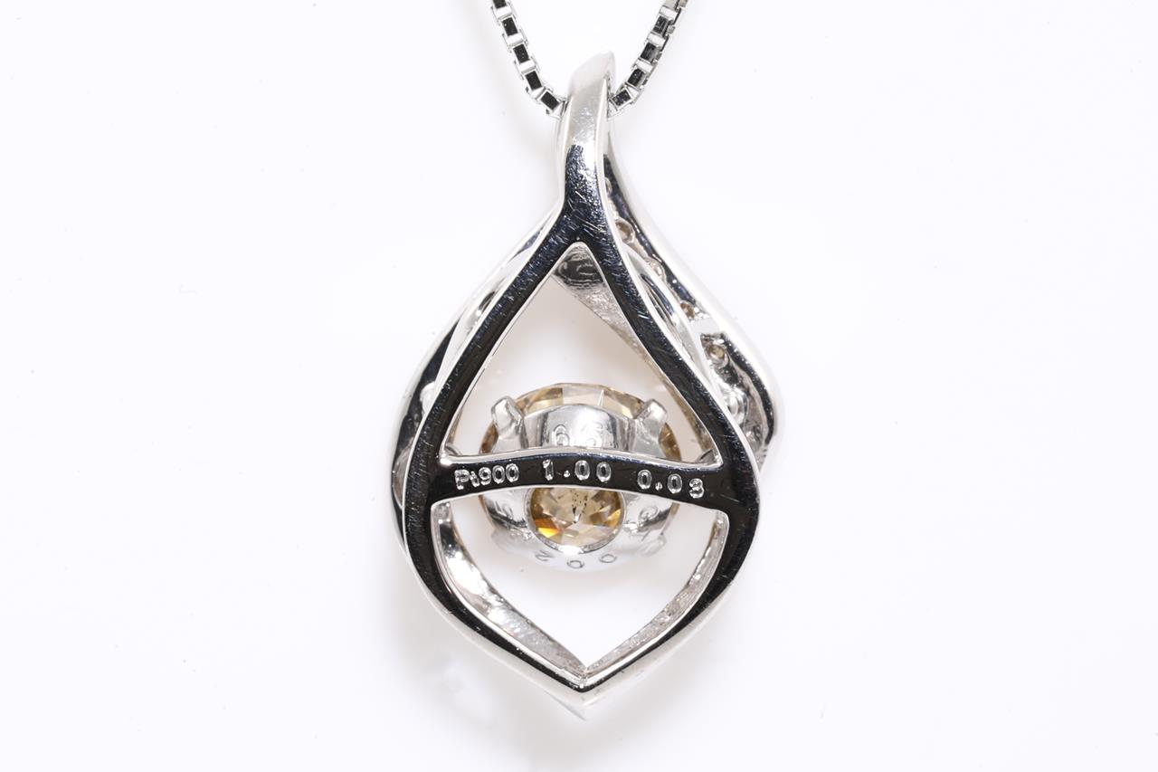 Diamond pendant with centre round floating Diamond of 1.00ct (Estimated grading: Champagn SI) and remaining round Diamonds totalling 0.03cts. Platinum with 45cm chain. Weight: 4.8g. (Pre-owned)