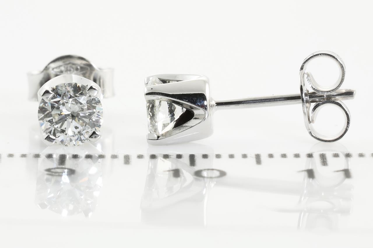 Diamond stud earrings with 2 round brilliant cut Diamonds totalling 1.03cts (Estimated grading: G P1-2). 18ct White gold. Weight: 1.9g. (New).