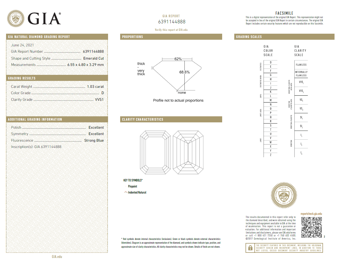 A loose Emerald cut Diamond of 1.03ct (With GIA report graded as D VVS1 #6391144888). (New)