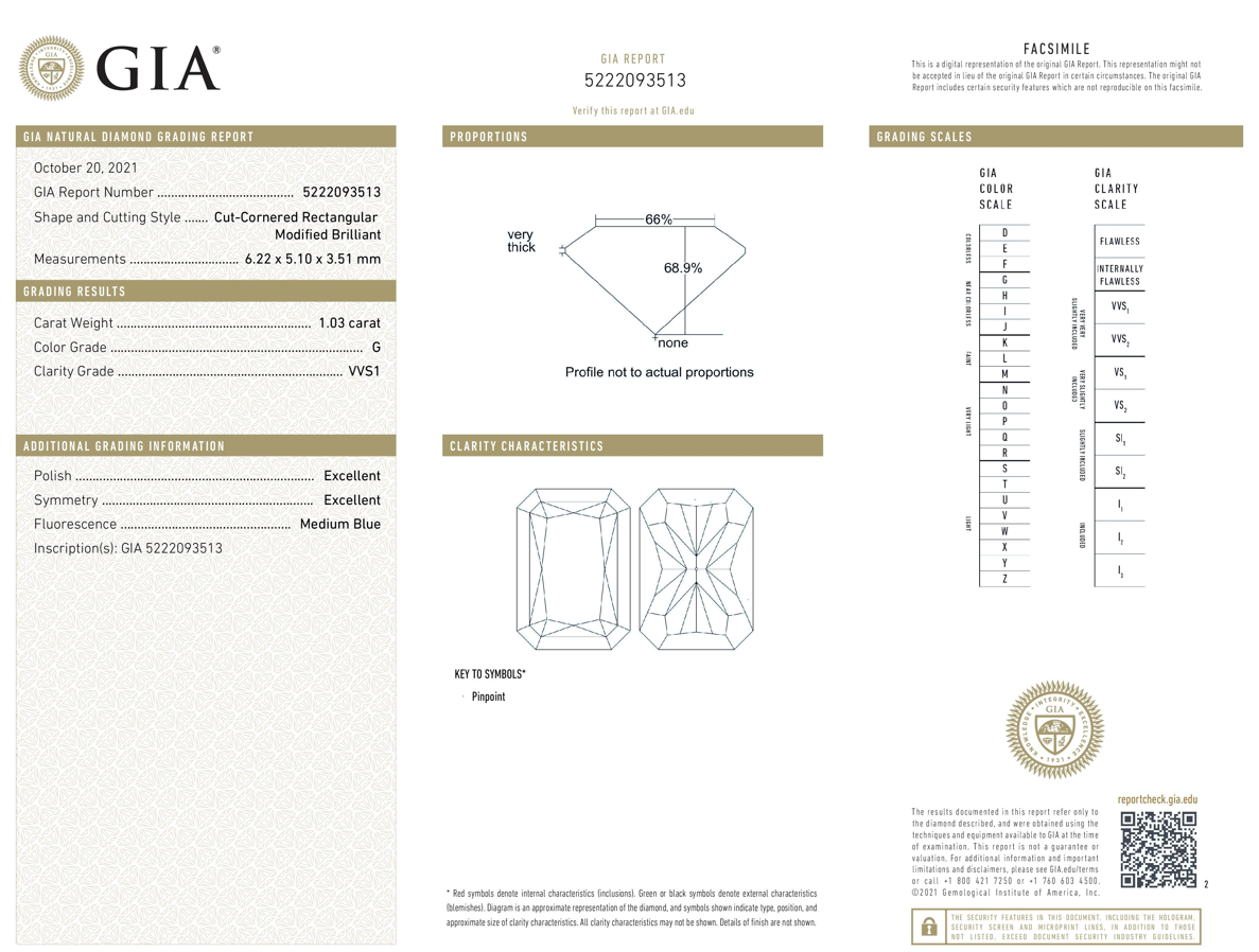A loose radiant cut Diamond of 1.03ct (with GIA report graded as G VVS1#5222093513). (New)