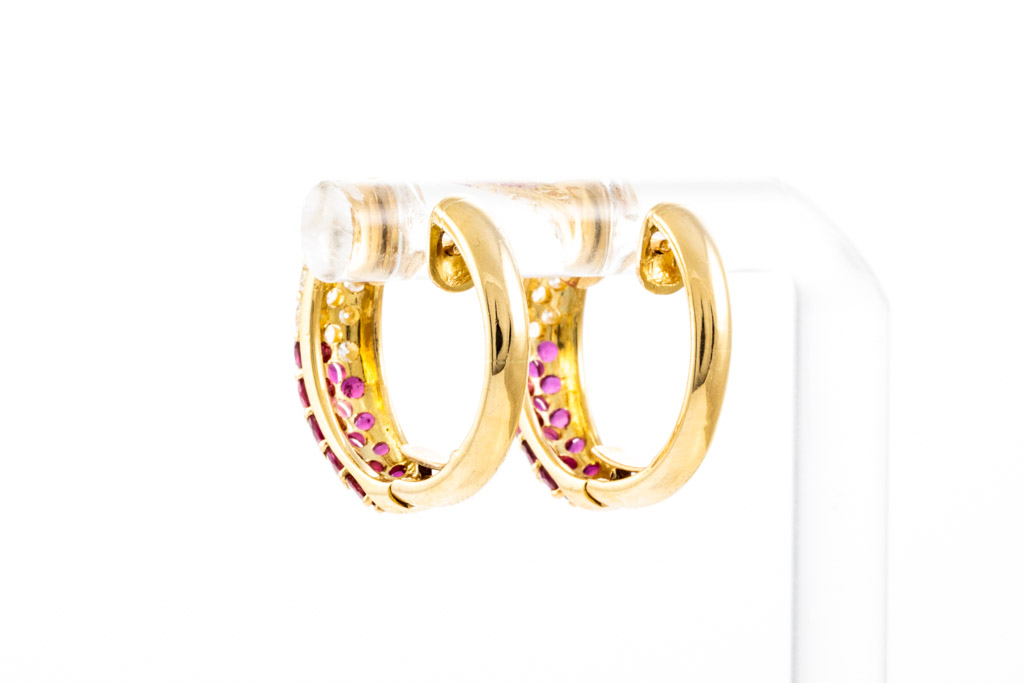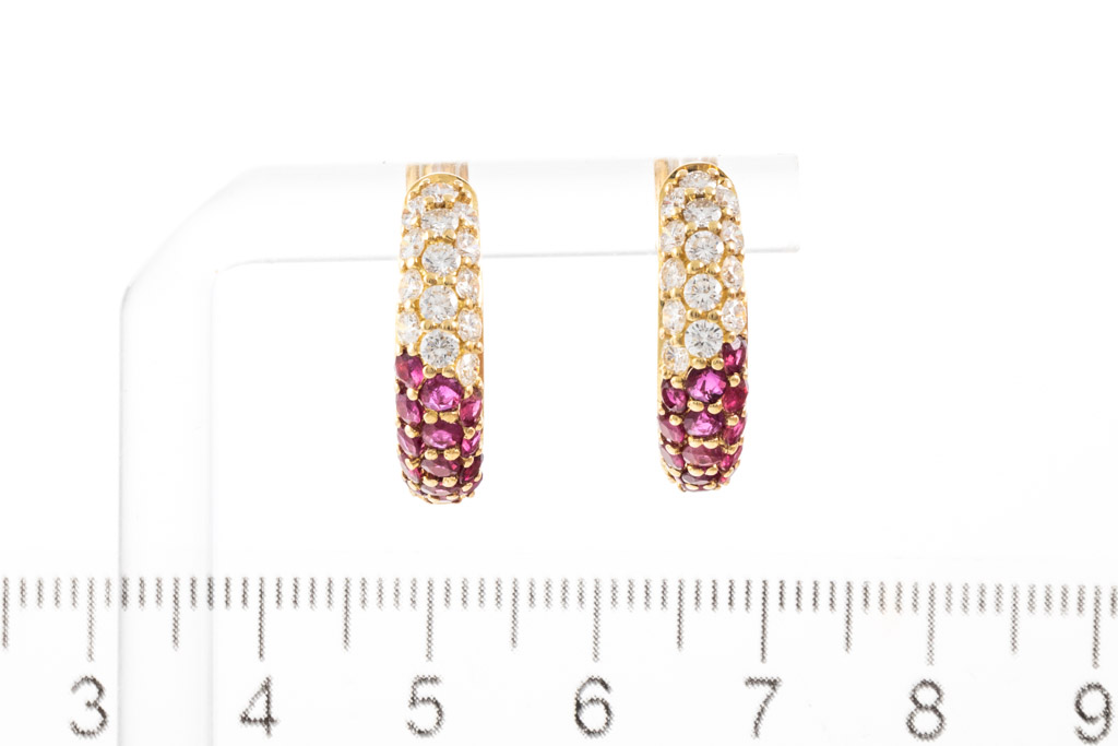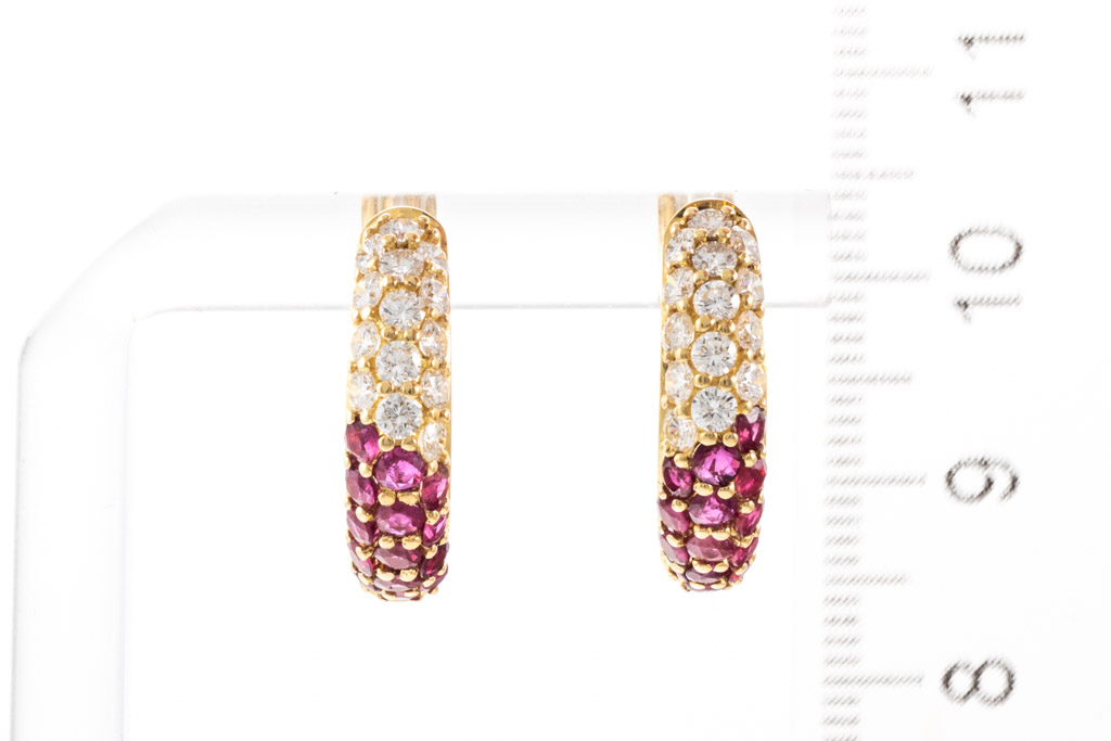 Ruby and Diamond earrings with round rubies totalling 1.03cts and round Diamonds totalling 1.01cts (Estimated grading: G-H SI). 18ct yellow gold. Weight:7.7g. (Pre-owned)