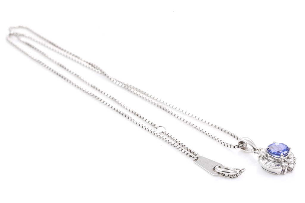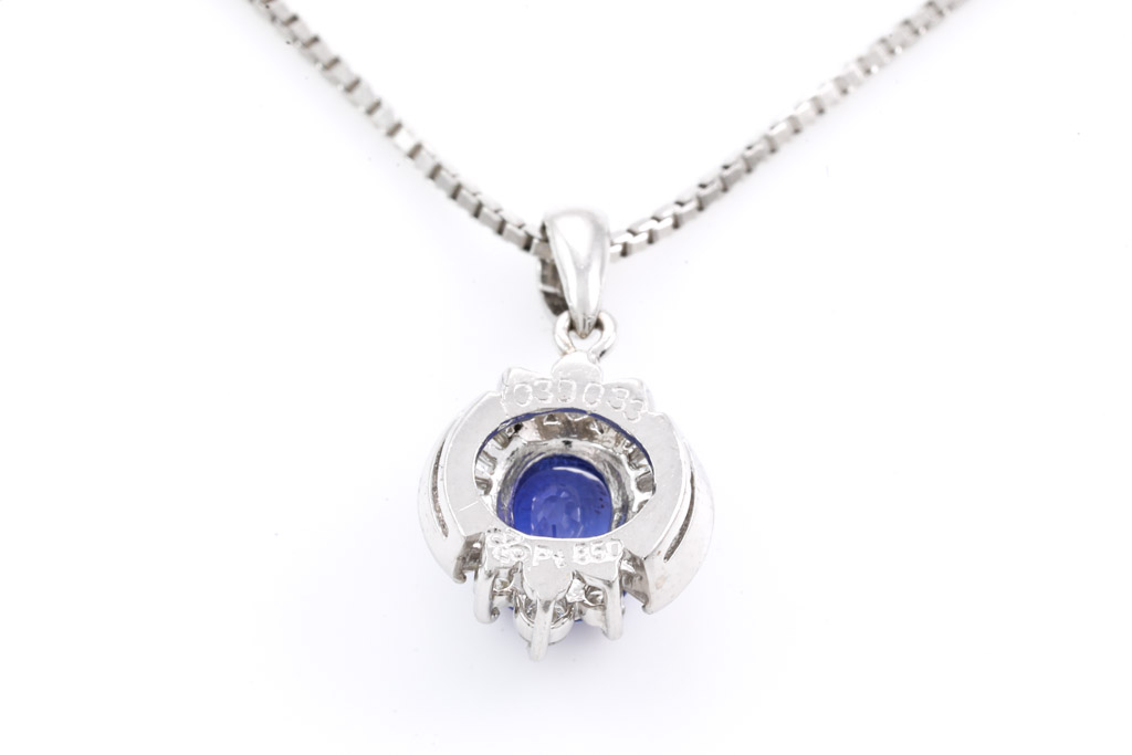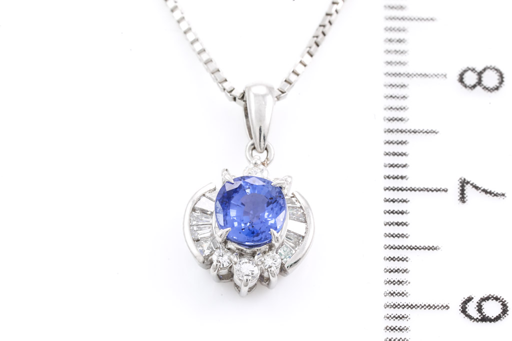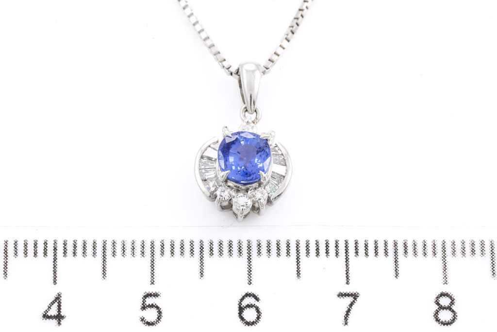 Sapphire and Diamond pendant with oval shape blue Sapphire of 1.03ct and round & baguette cut Diamonds totalling 0.33cts (Estimated grading: G-H SI). Platinum with 39cm platinum adjustable chain. Weight: 6.2g. (Pre-owned)