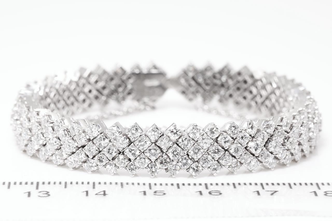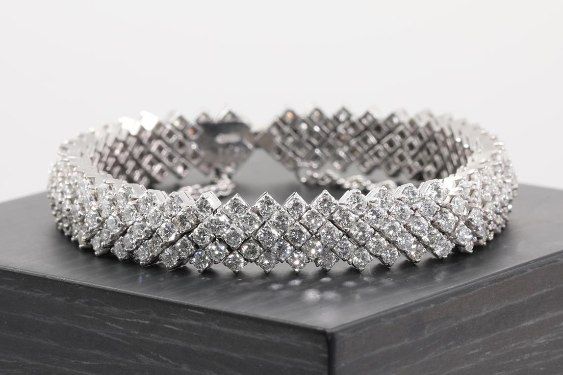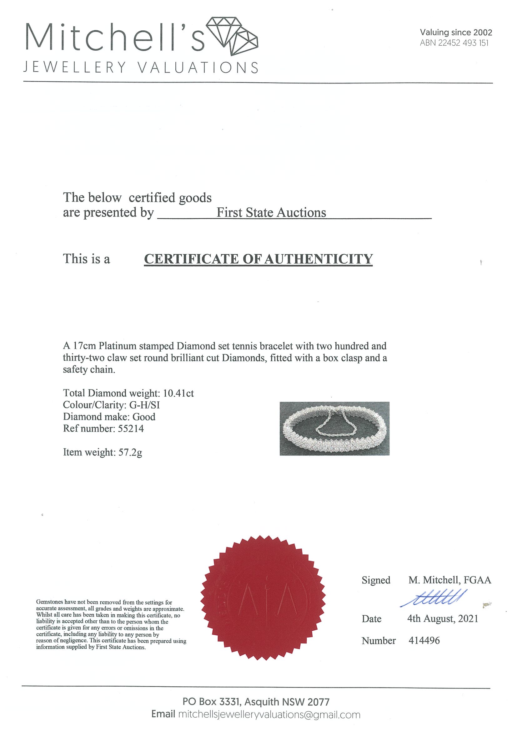 Diamond bracelet with round Diamonds totalling 10.41cts (Estimated grading: G-H SI). Platinum with safety chain. Length: 17cm. Weight: 57.2g. With certificate #414496. (Pre-owned)