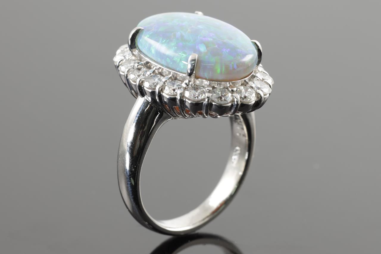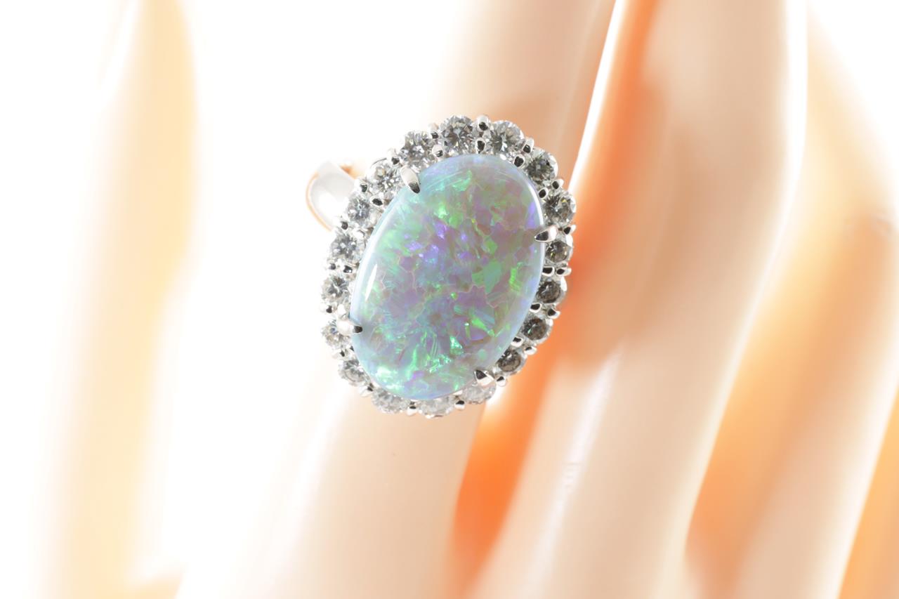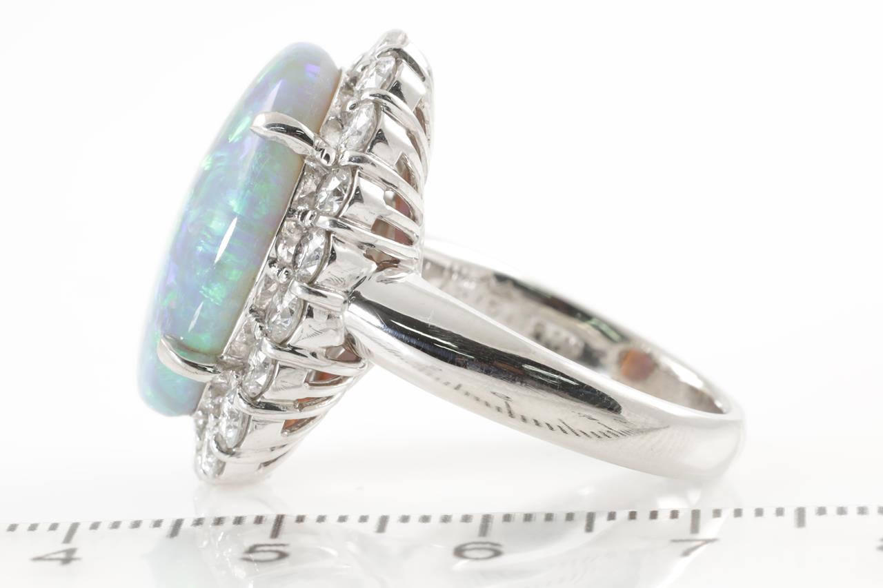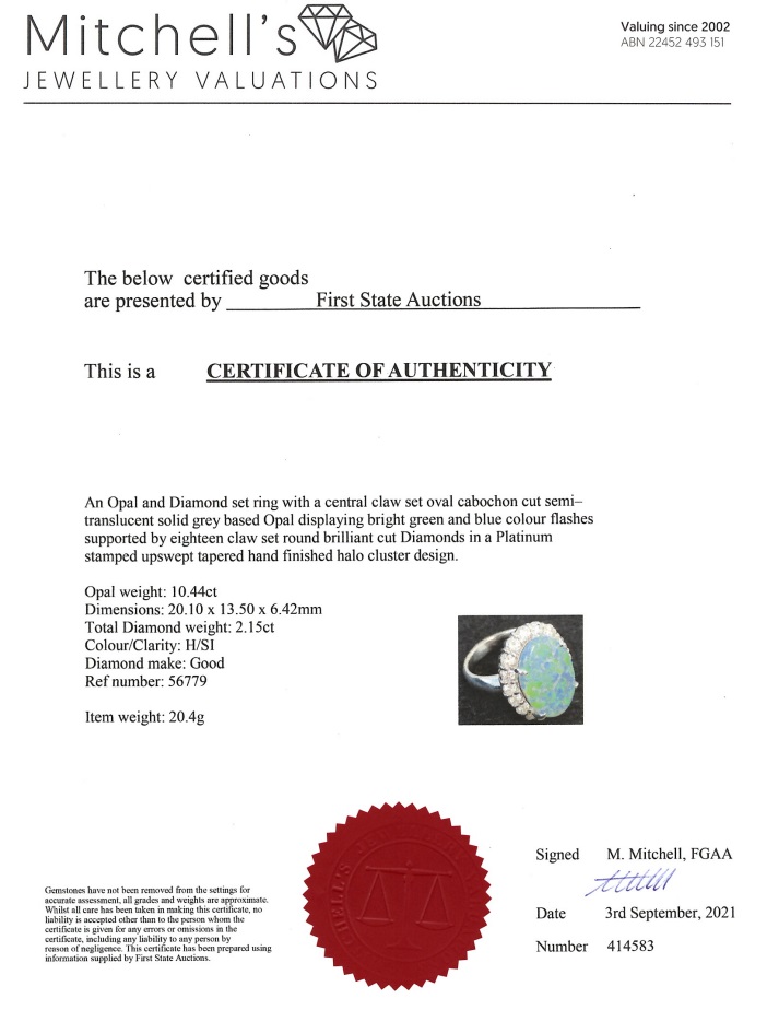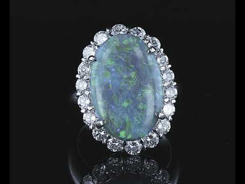 Opal and Diamond ring with an oval cabochon cut Black Opal of 10.44ct and Diamonds totalling 2.15cts (Estimated grading: H SI). Platinum. Ring size P1/2. Weight: 20.4g. With certificate #414583. (Pre-owned)