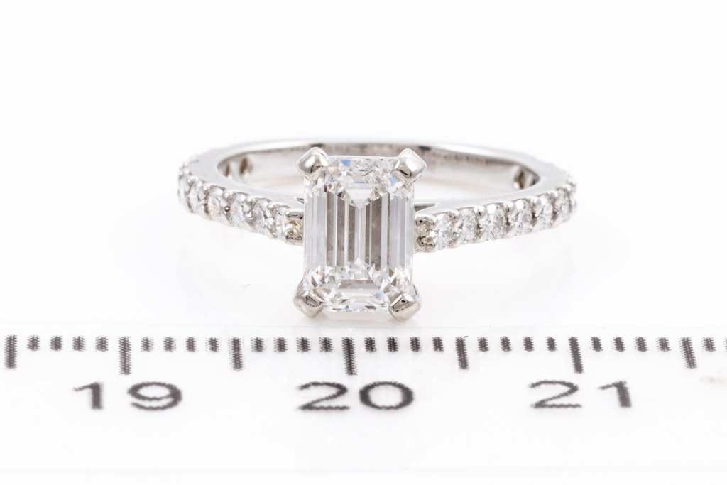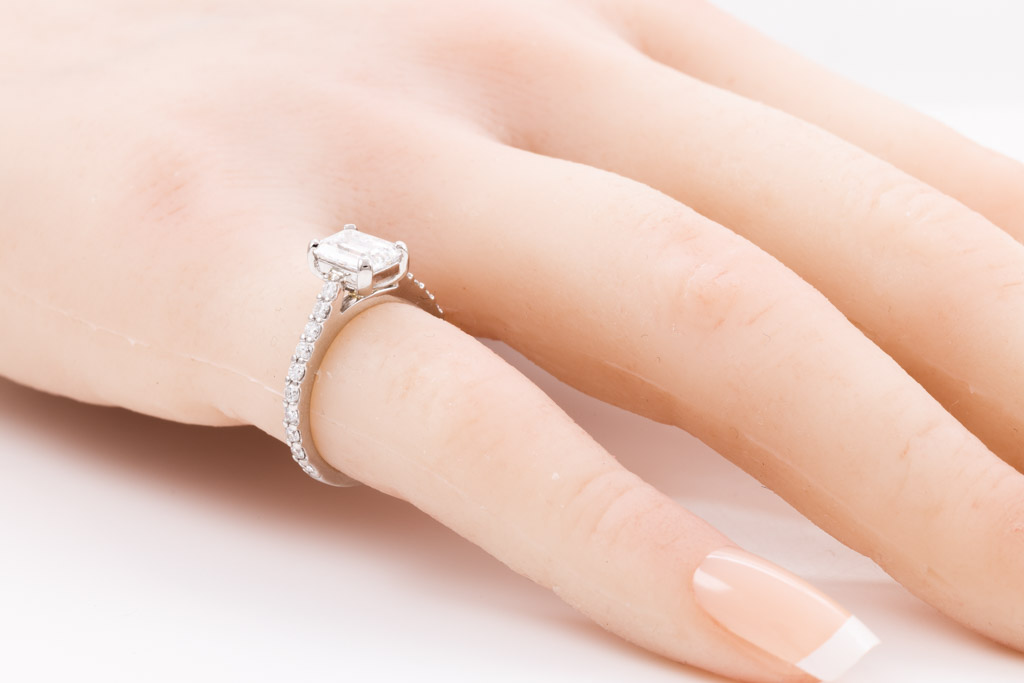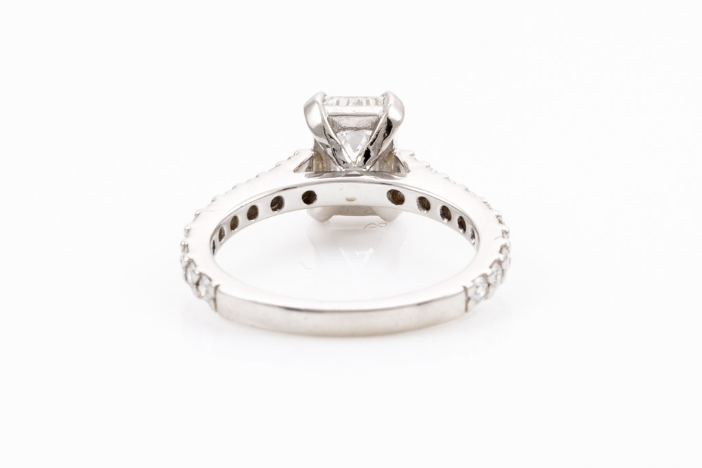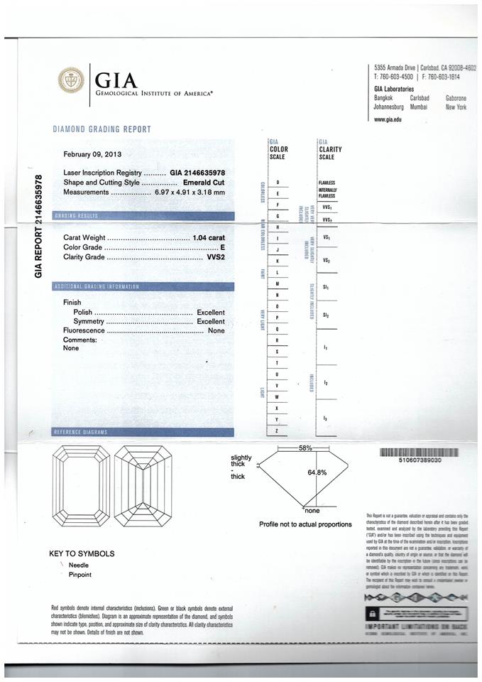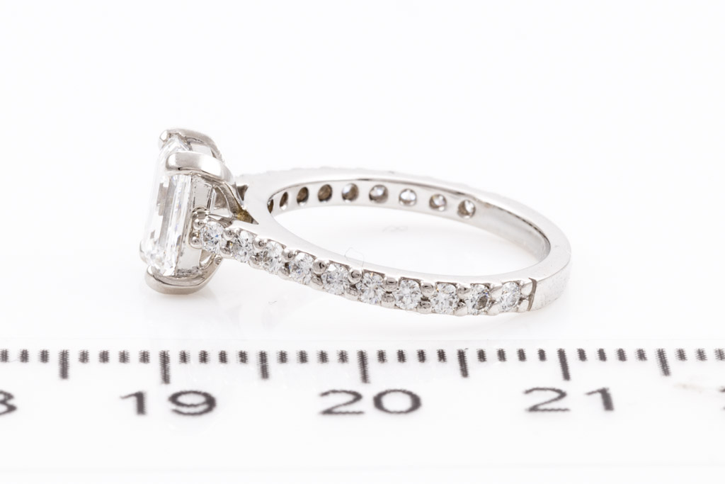 Diamond engagement ring with emerald cut Diamond of 1.04ct (with GIA report graded as E VVS2 #2146635978) and remaining round Diamonds totalling 0.30cts (Estimated grading: G-H VS2-SI1). Platinum. Ring size G; ring resizing is not recommended. With Appraisal report dated 25/10/2013. (Pre-owned)