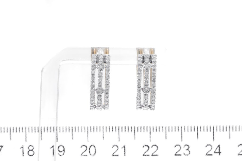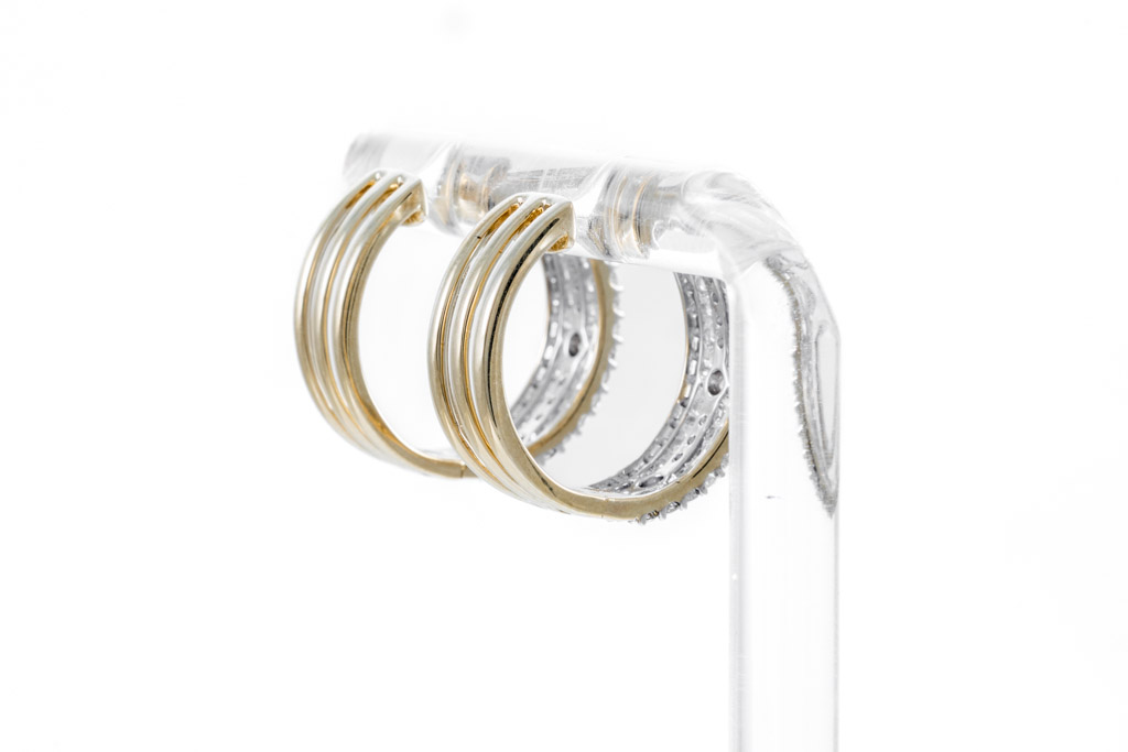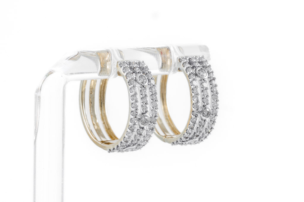 Diamond hoop earrings with 88 round diamonds totalling 1.04cts. (Estimated grading: H SI). 14ct yellow gold. Weight: 5.3g. (New)