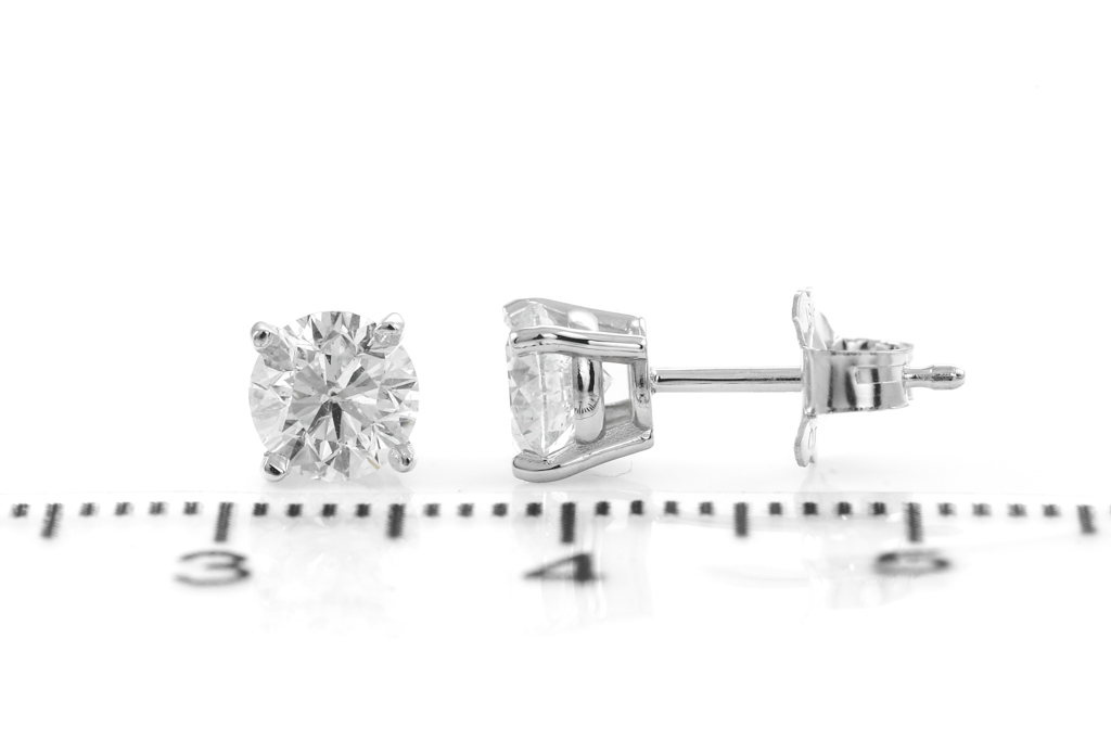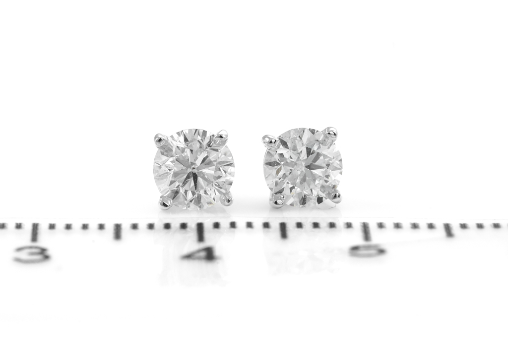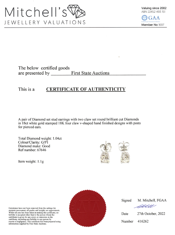 Diamond stud earrings with 2 round brilliant cut Diamonds totalling 1.04cts (Estimated grading: G P1). 18ct white gold. Weight: 1.1g. With certificate #416262. (New).