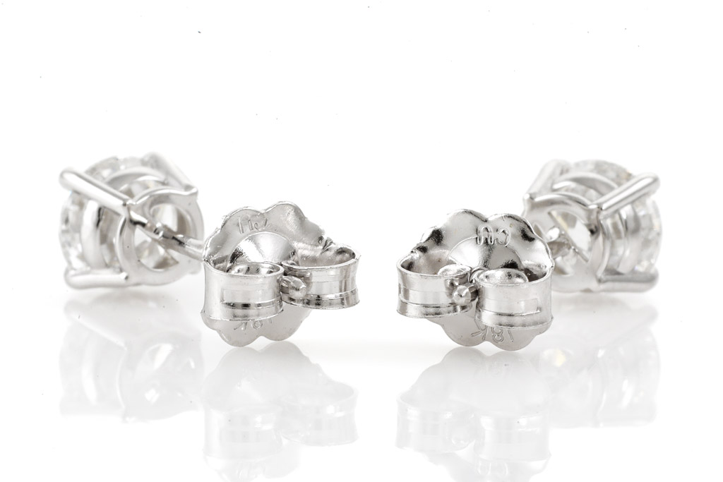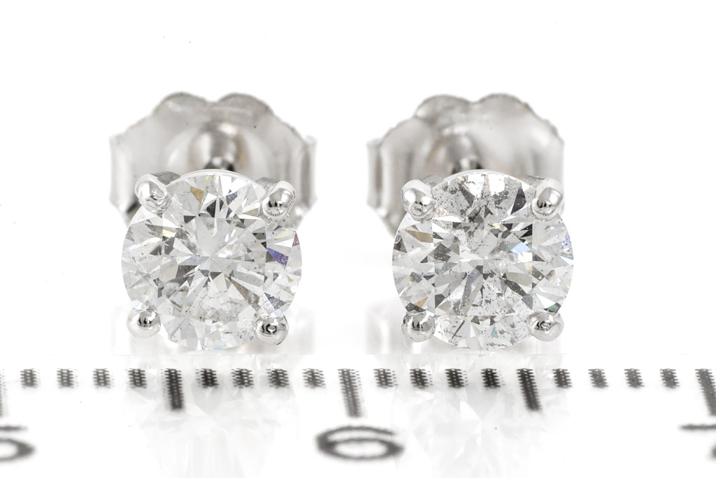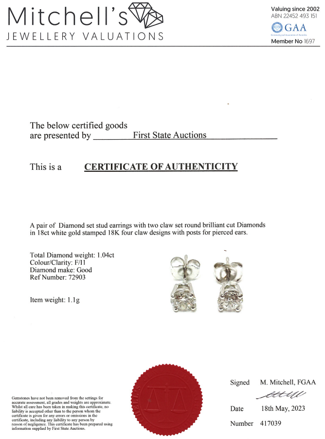 Diamond stud earrings with 2 round brilliant cut Diamonds totalling 1.04cts (Estimated grading: F P1). 18ct white gold. Weight: 1.1g. With certificate #417039. (New)