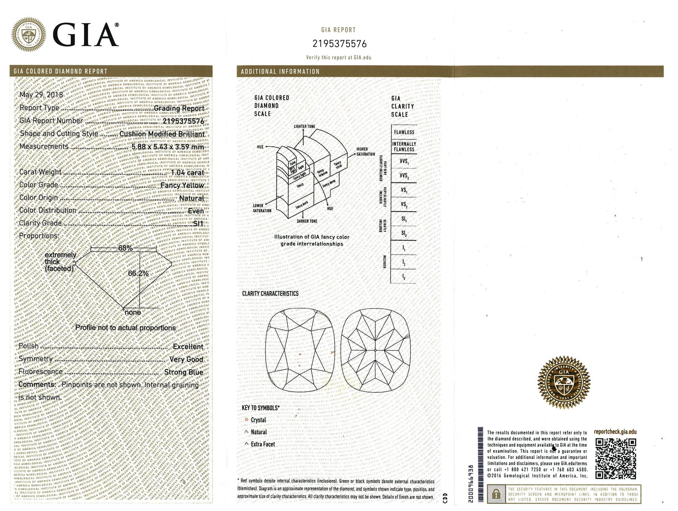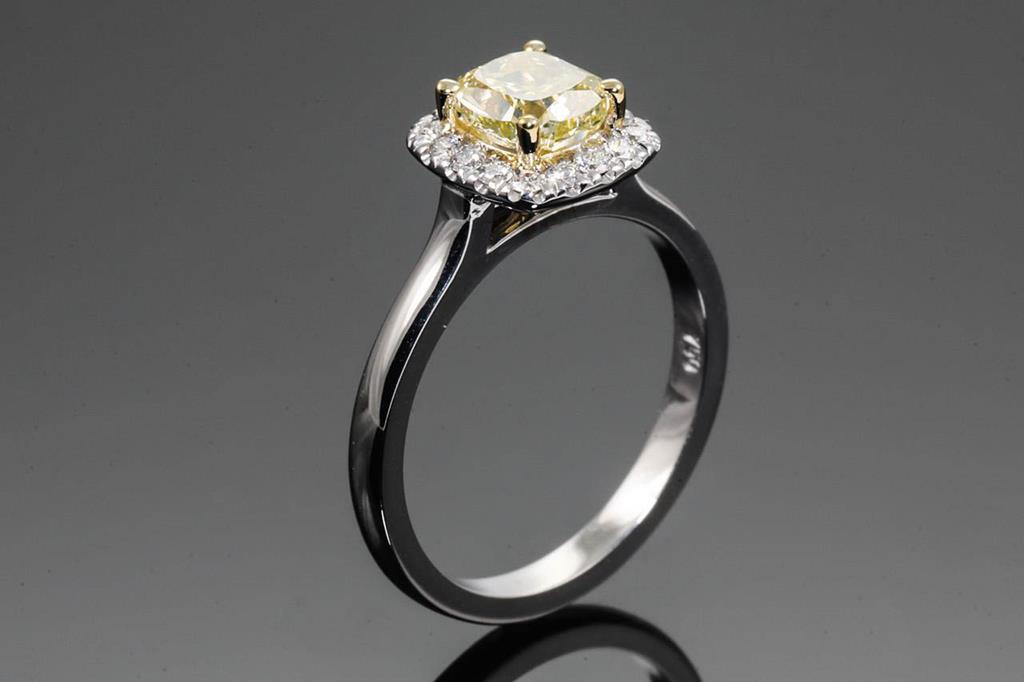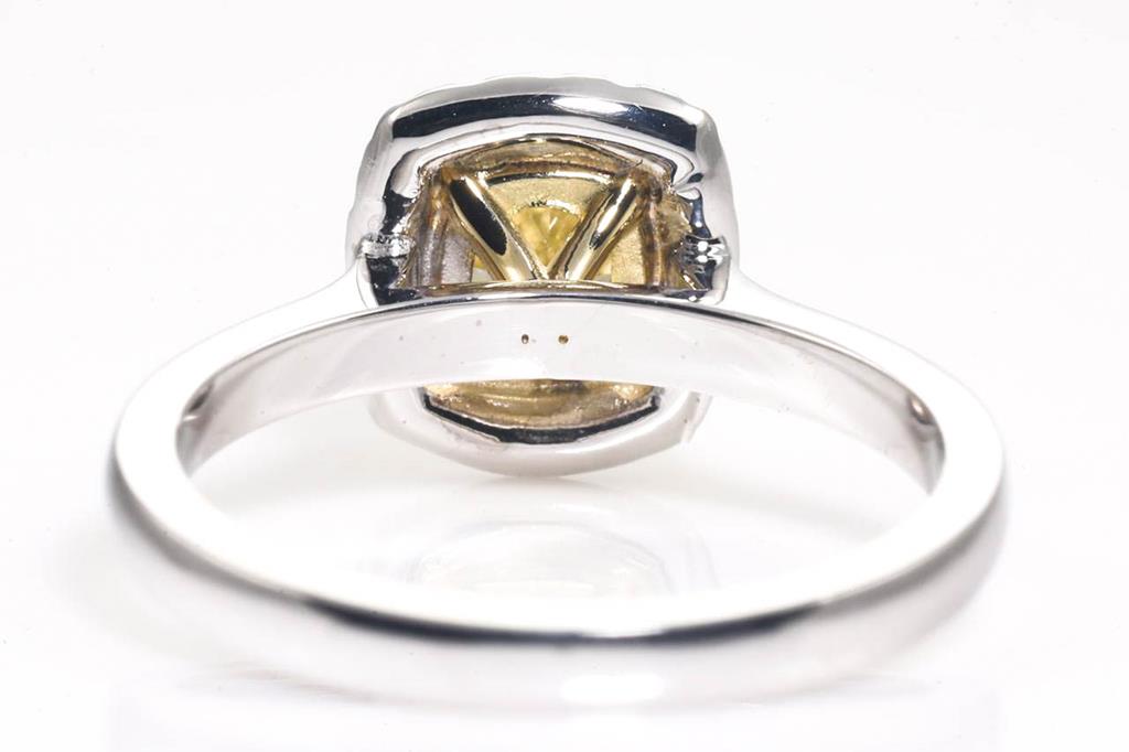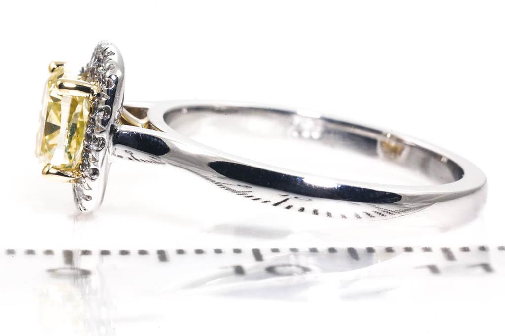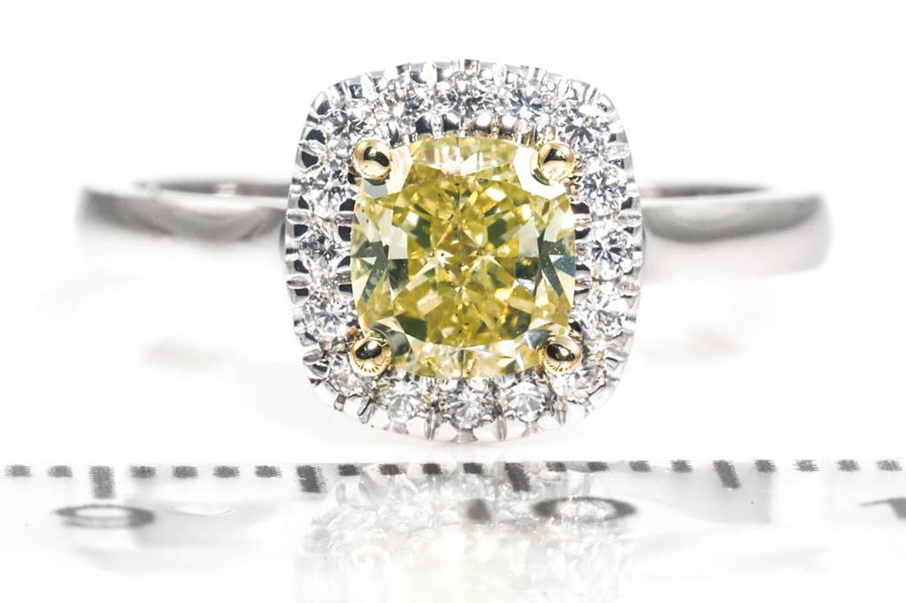 Diamond Halo ring with centre cushion cut Diamond of 1.04ct (with GIA report graded as Natural Fancy Yellow Even SI1 #2195375576) and round Diamonds totalling 0.17cts. Ring size K1/2. 18ct white gold. Weight: 4.0g. (New)