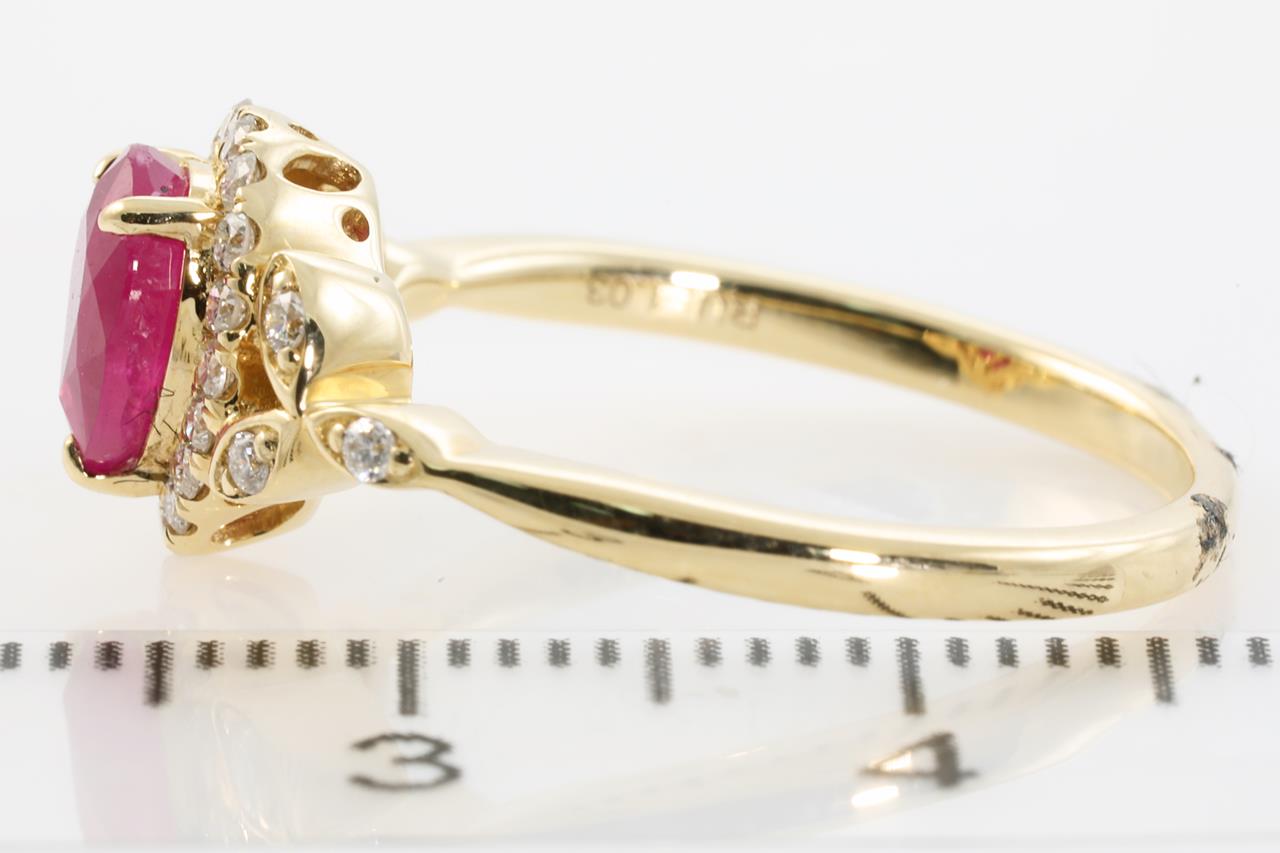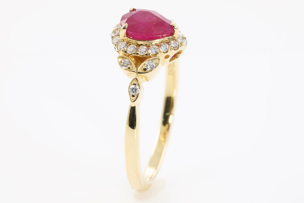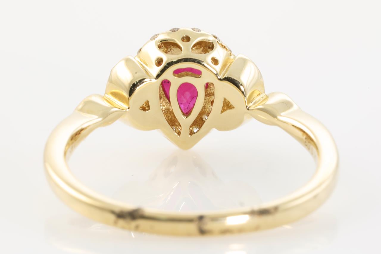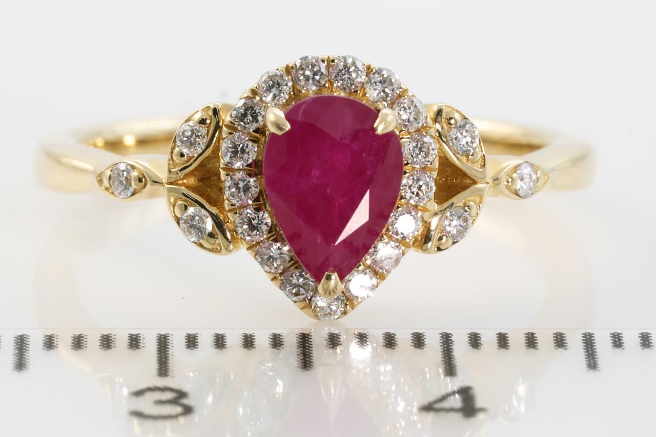 Ruby and Diamond ring with pear cut Ruby of 1.04ct and round Diamonds totalling 0.23cts (Estimated grading: H-I SI). 14ct yellow gold. Ring size N1/2. Weight: 3.4g (As New).