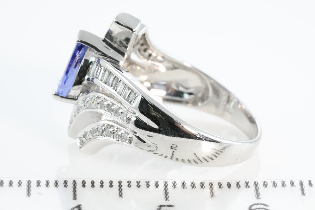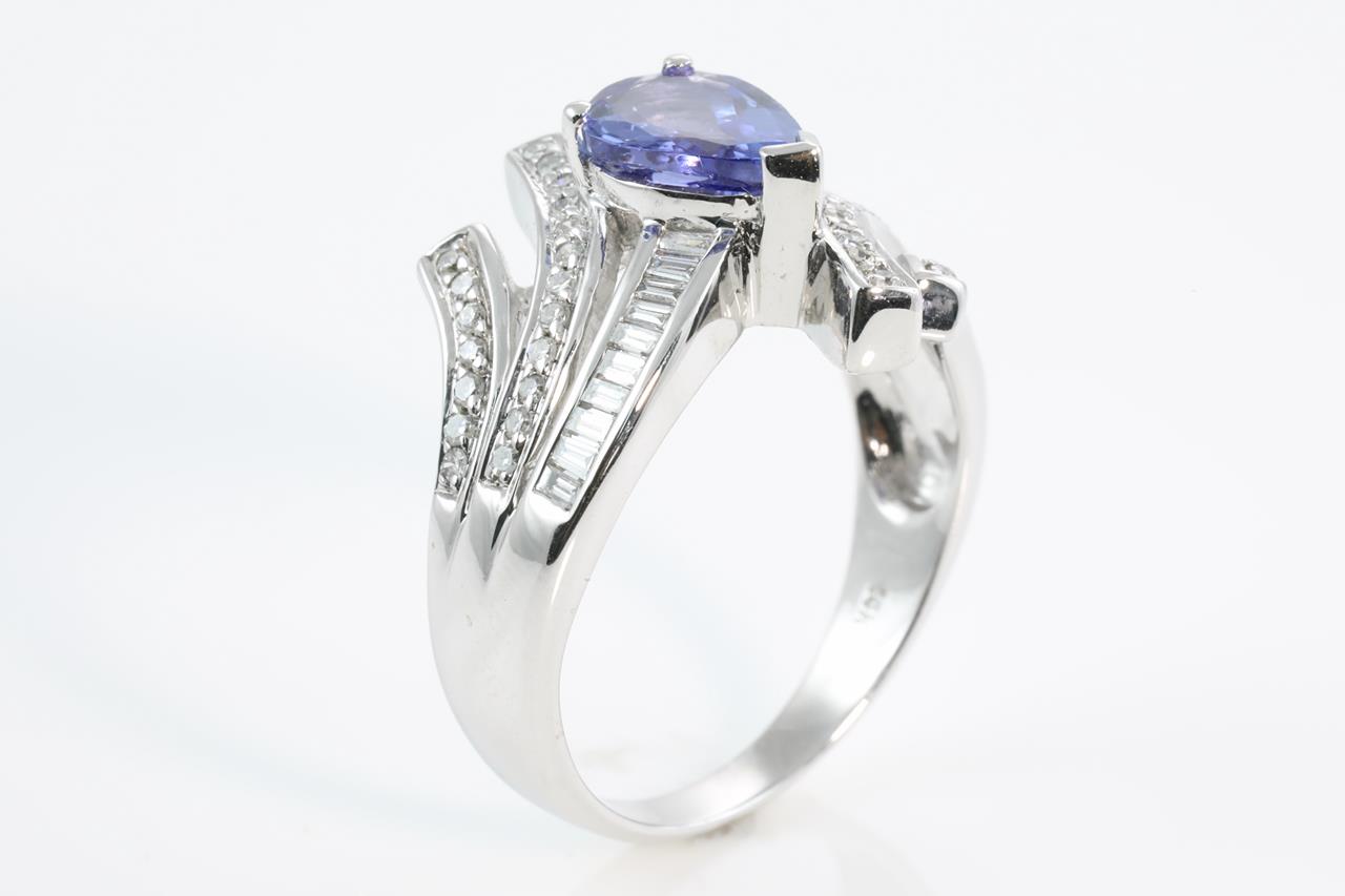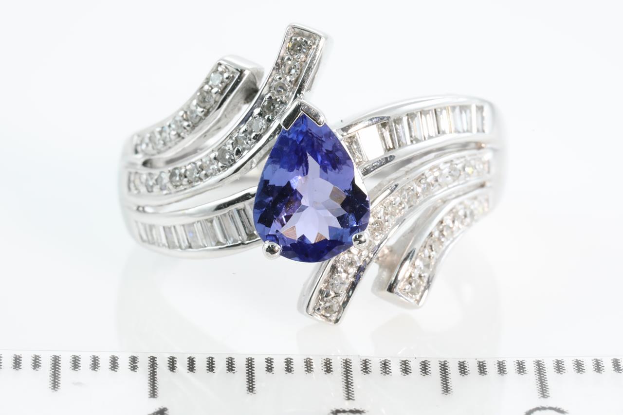 Tanzanite and Diamond ring with pear shape Tanzanite of 1.04ct with round and baguette cut Diamonds totalling 0.40cts (Estimated grading: H SI-P2). 14ct white gold. Ring size M1/2 - Ring resizing is not recommended. Weight: 5.1g (As New)