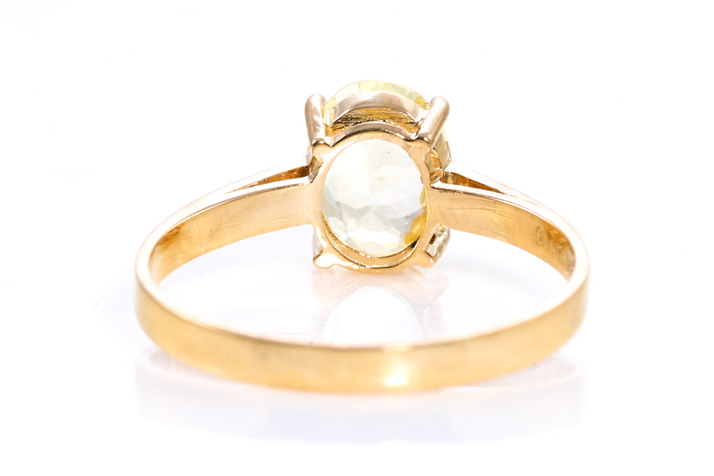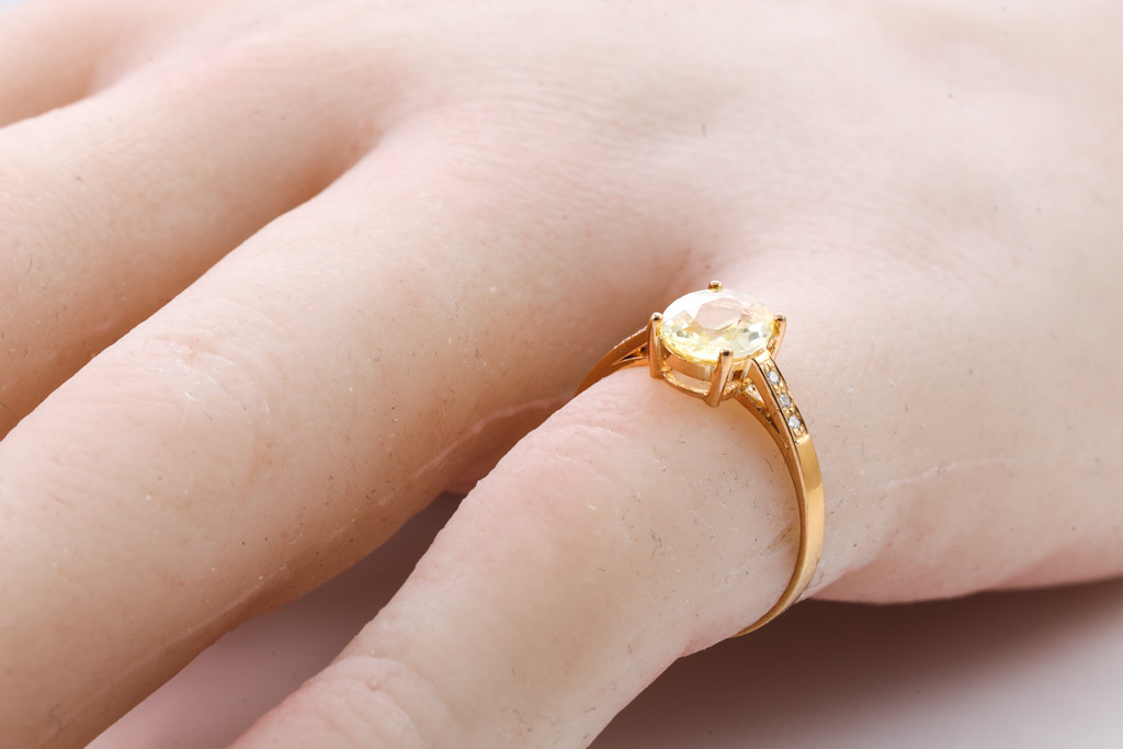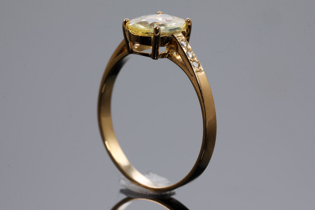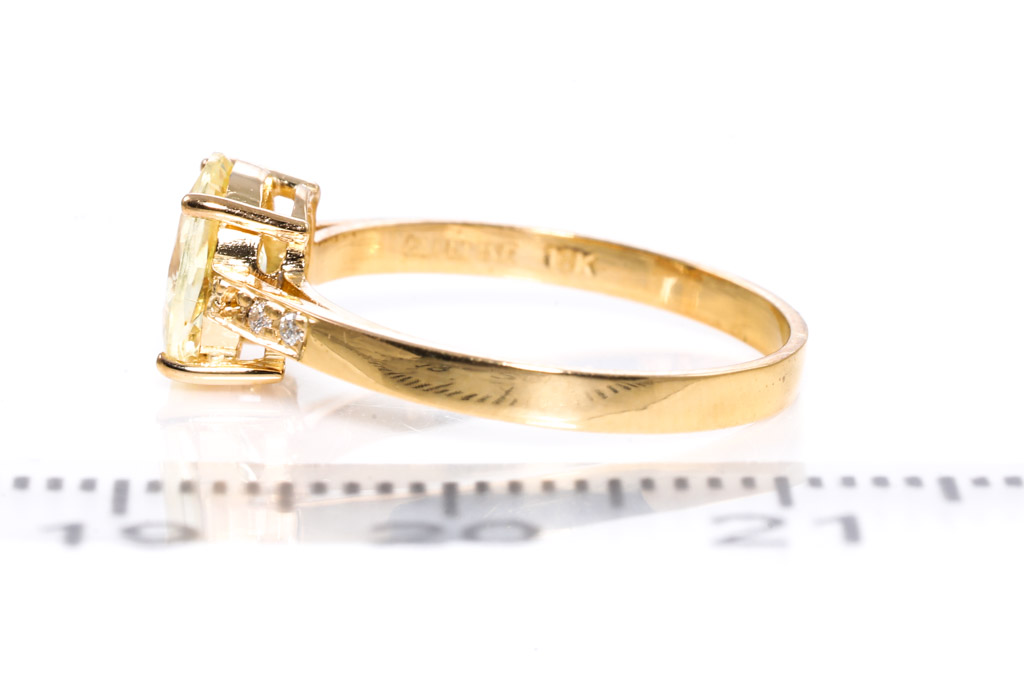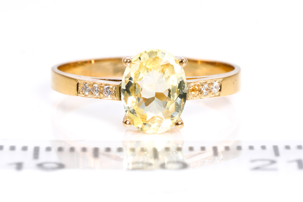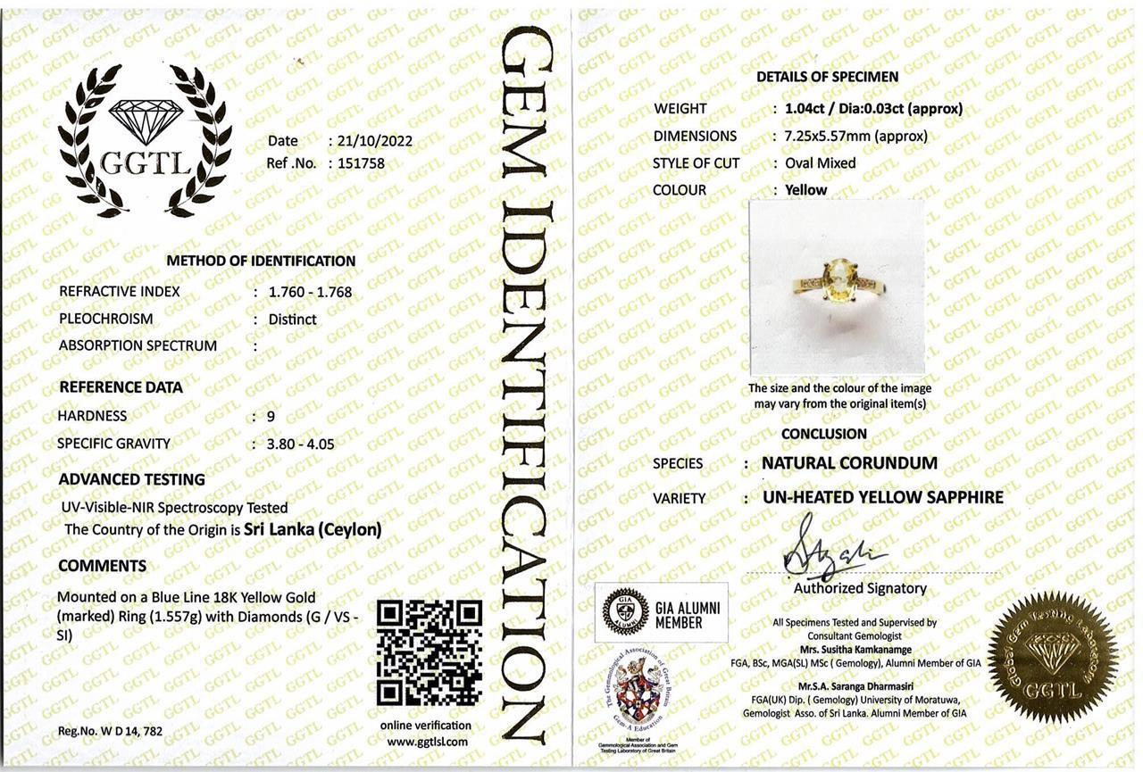 Sapphire ring with oval cut unheated Ceylon yellow Sapphire of 1.04ct and round Diamonds totalling approximately 0.03cts. 18ct yellow gold. Ring size I 1/2. Weight 1.5g. With gem report #151758. (As New)