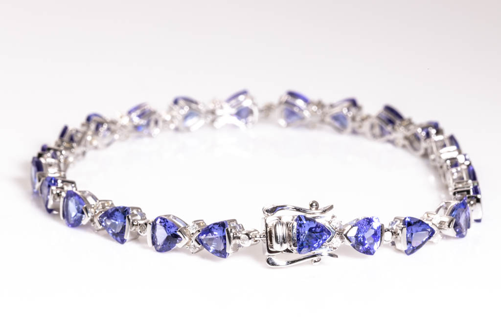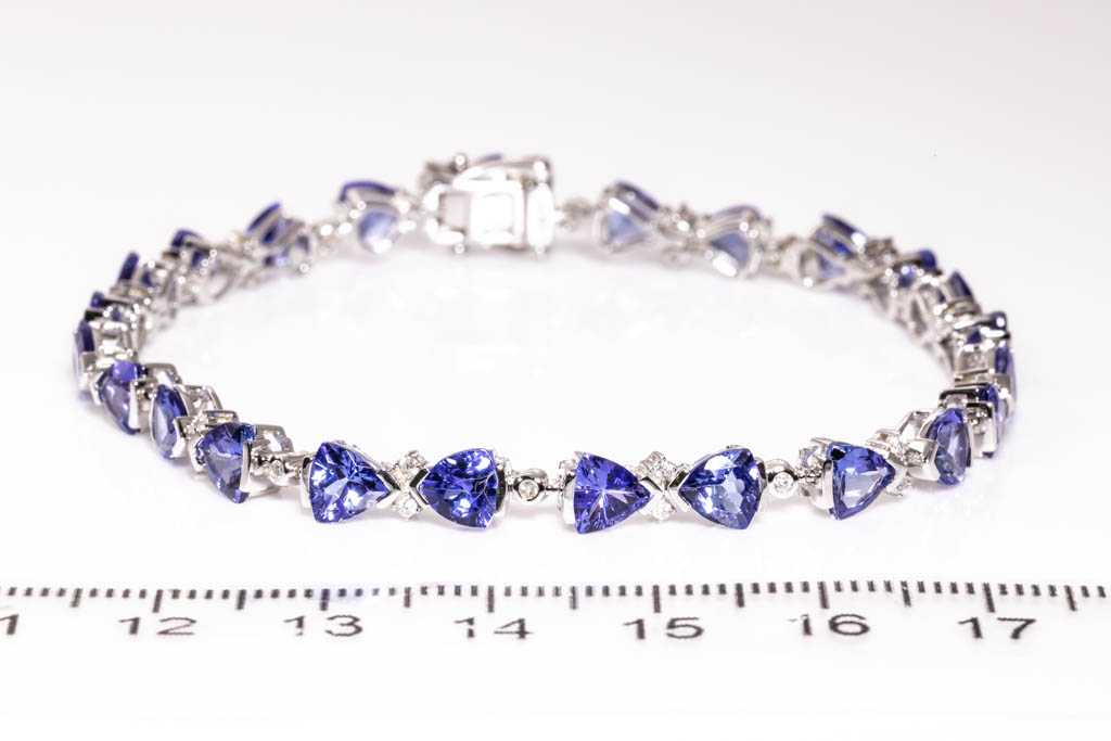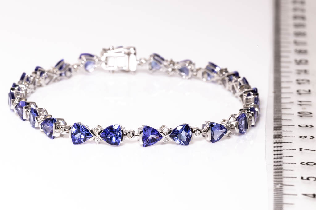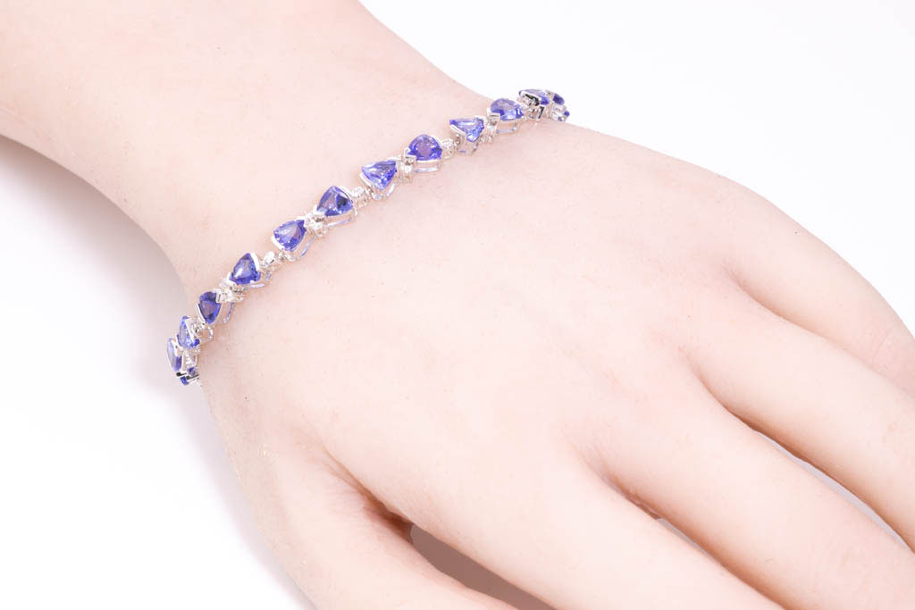 Tanzanite and Diamond bracelet with trilliant Tanzanite totalling 10.52cts and Diamonds totalling 0.30cts (Estimated grading: H-I P2-3). 14ct white gold. Length: 18.5cm. Weight: 12.1g. (As new)