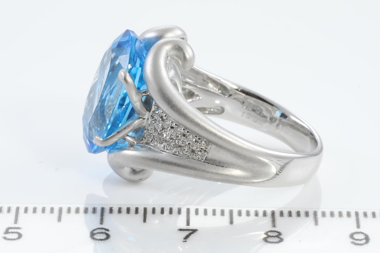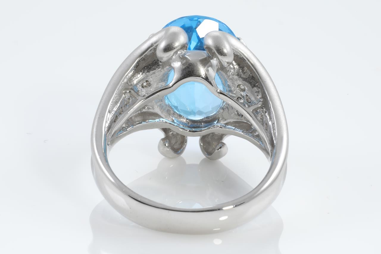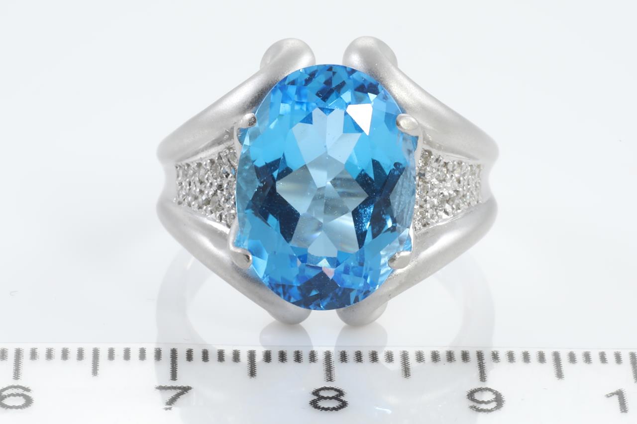 Topaz and Diamond ring with oval shape blue Topaz of 10.59ct and Diamonds totalling 0.21cts. 18ct white gold. Ring size Q1/2 - Ring resizing is not recommended. Weight: 12.4g (Pre-owned)