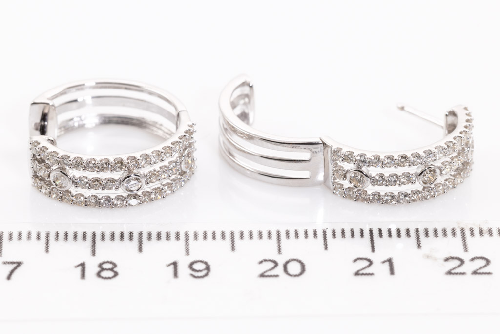 Diamond hoop earrings with 88 round diamonds totalling 1.05cts. (Estimated grading: H SI). 14ct white gold. Weight: 5.5g. (New)