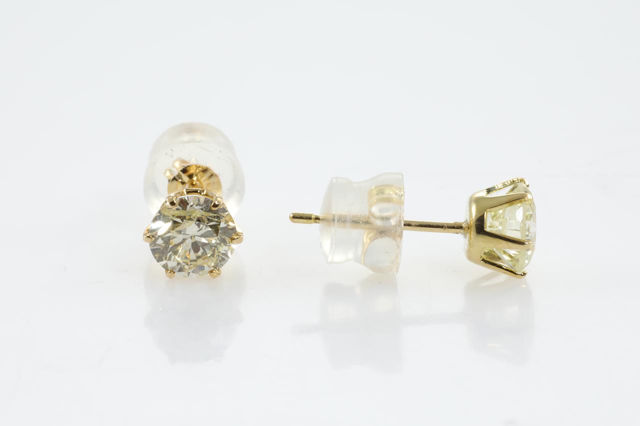 Diamond stud earrings with 2 Round Brilliant cut Diamonds totalling 1.05cts (Estimated grading: Light Yellow P1). 18ct yellow gold with 18ct gold and silicone backs. (New)