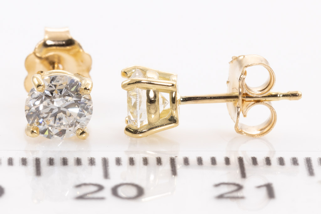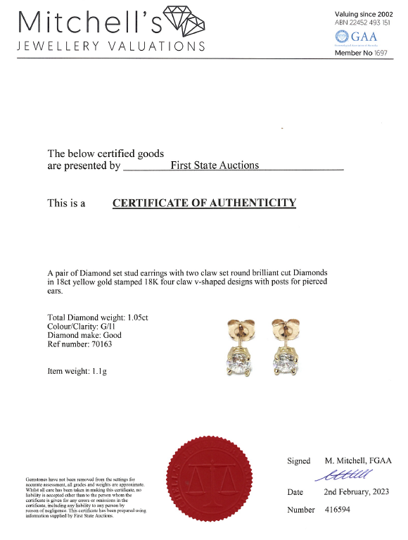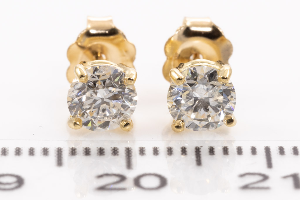 Diamond stud earrings with 2 round brilliant cut Diamonds totalling 1.05cts (Estimated grading: G P1). 18ct yellow gold. Weight: 1.1g. With certificate #416594. (New)