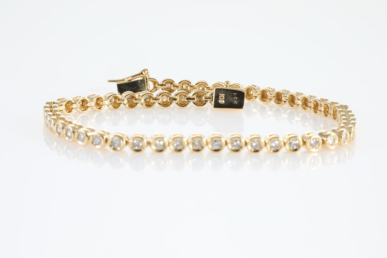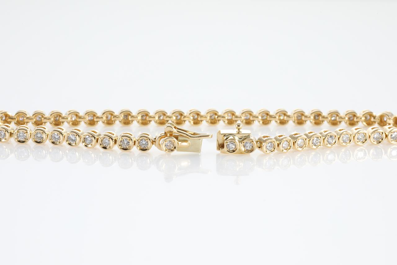 Diamond tennis bracelet with round Diamonds totalling 1.05cts (Estimated grading: H-I SI). 18ct yellow gold. Length: 18cm. Weight: 10.9g (Pre-owned)