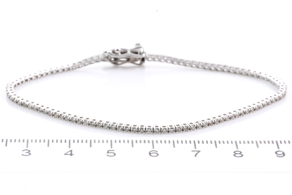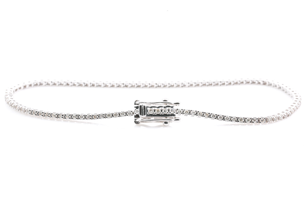 Diamond tennis bracelet with 102 round Diamonds totalling 1.05cts (Estimated grading: I-J SI). 14ct white gold. Length: 18.5cm. Weight: 5.0g. (New)