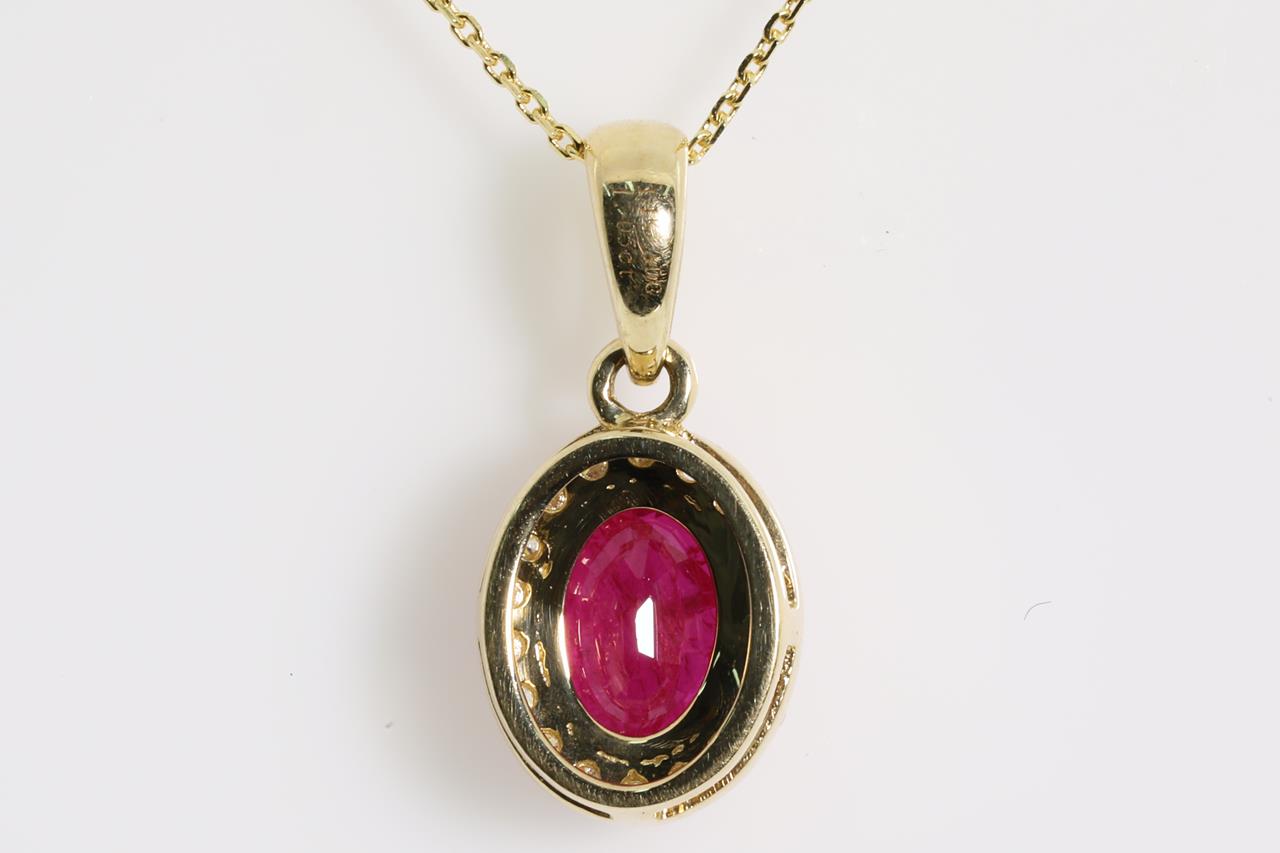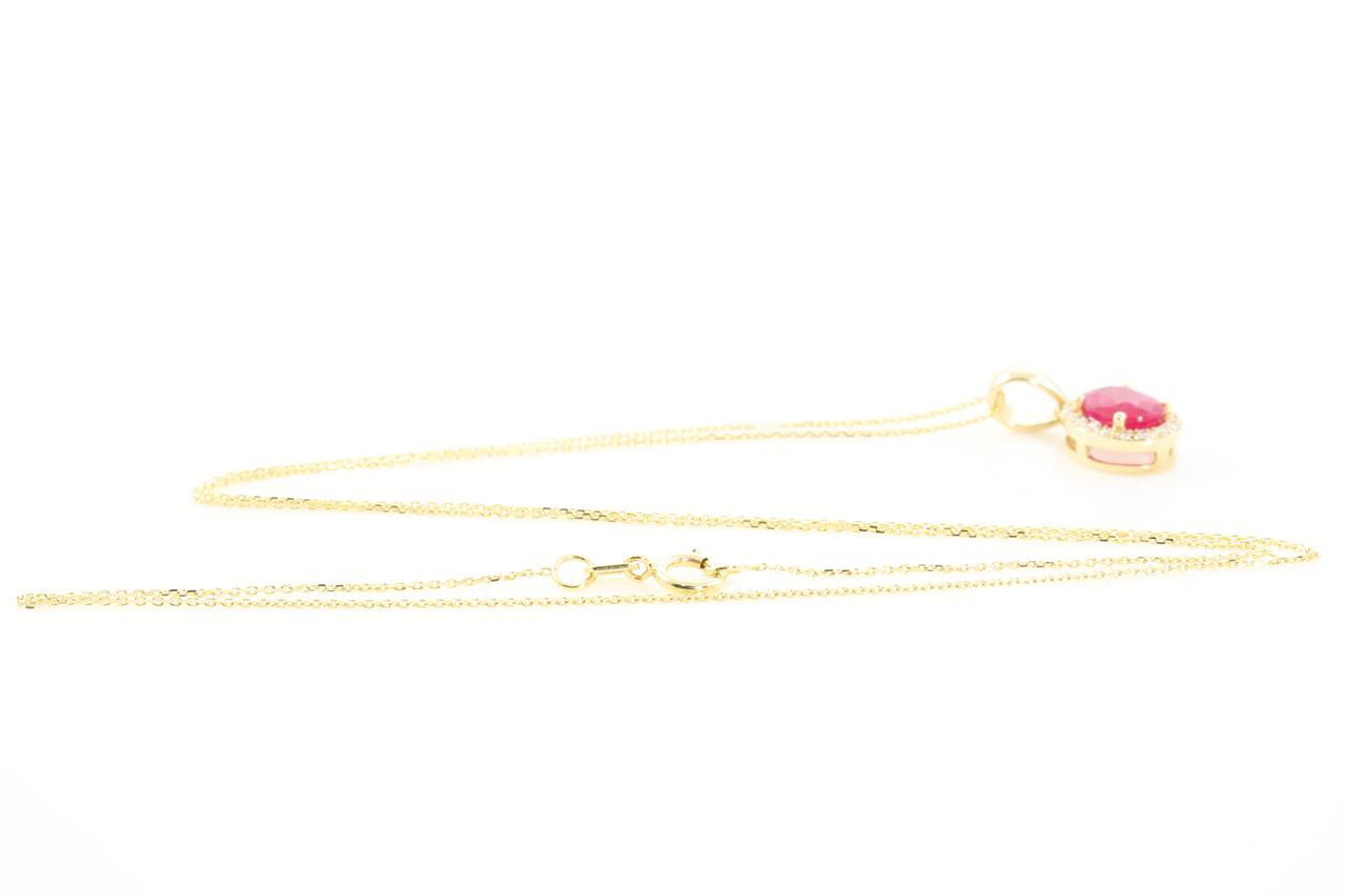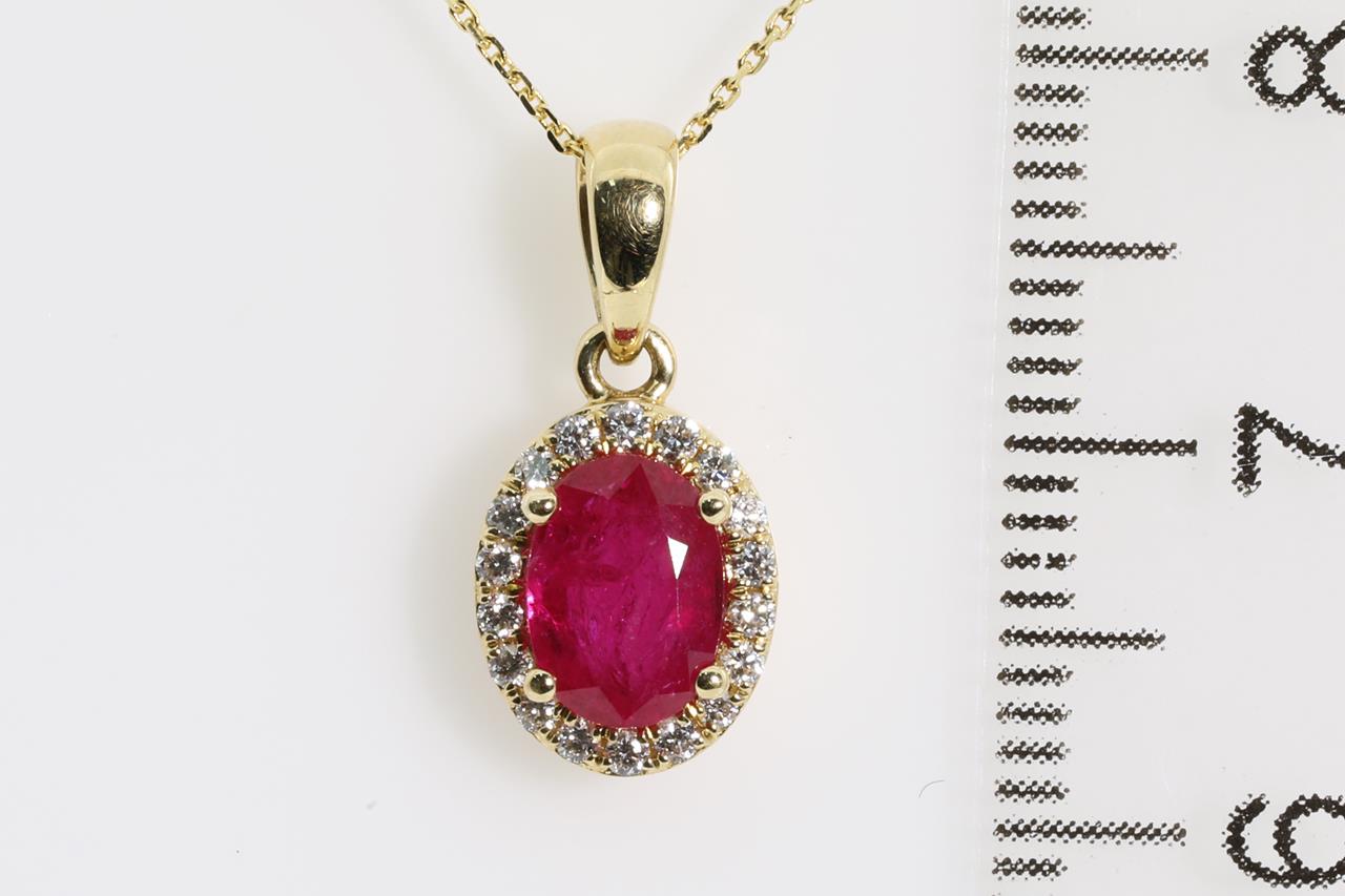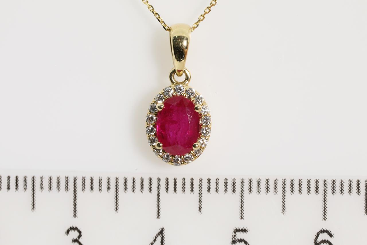 Ruby and Diamond pendant with oval Ruby of 1.05ct and Diamonds totalling 0.12cts. 14ct yellow gold with 14ct gold 45cm chain. Weight: 2.1g (As new)