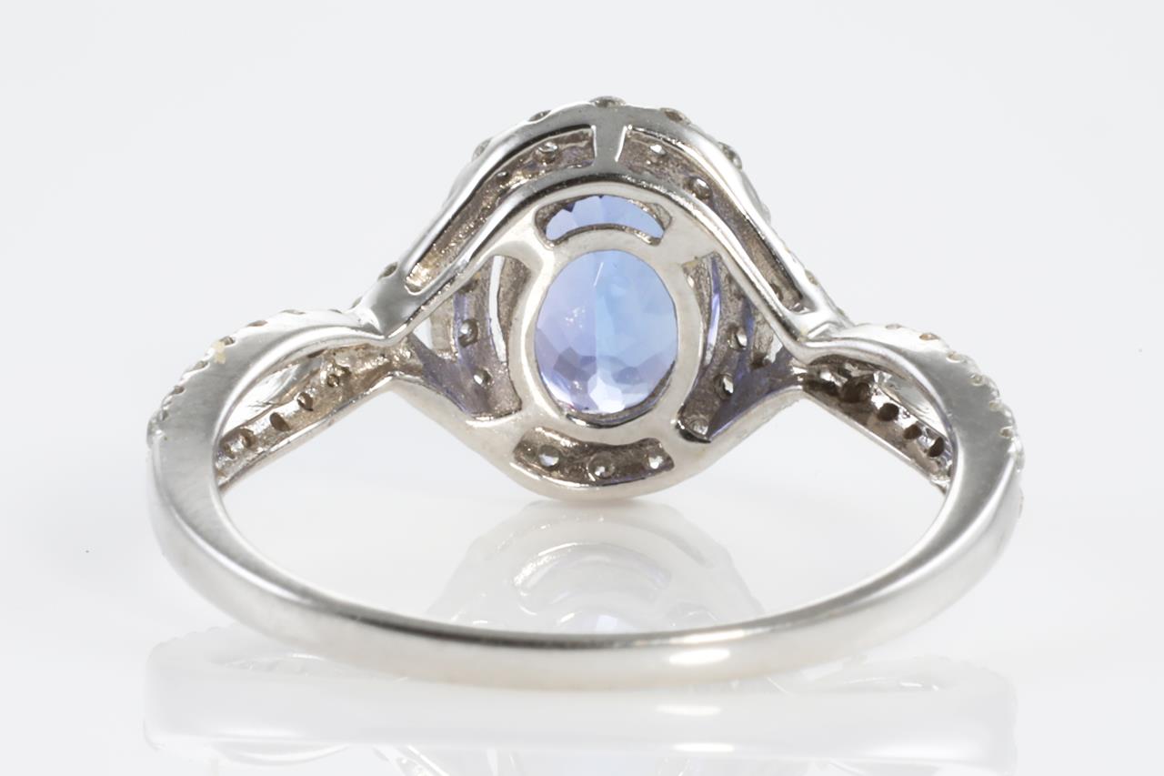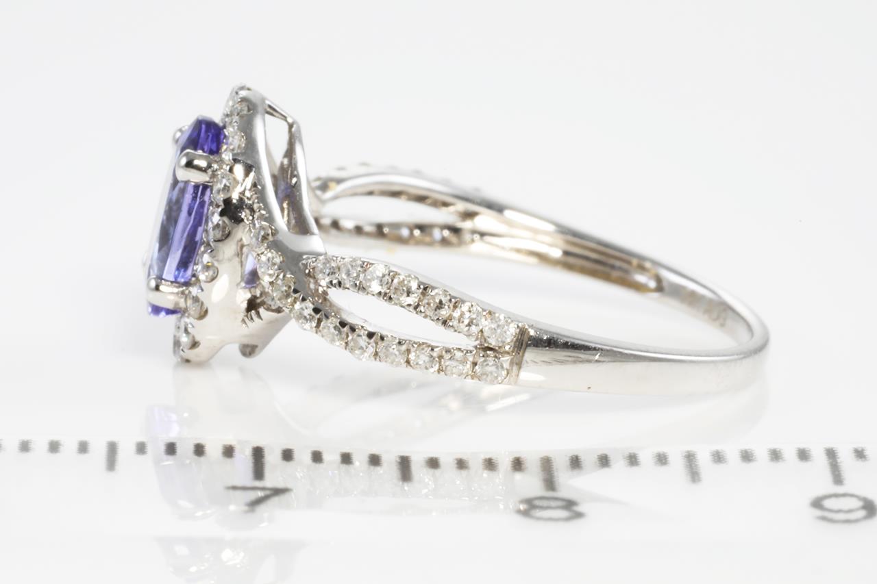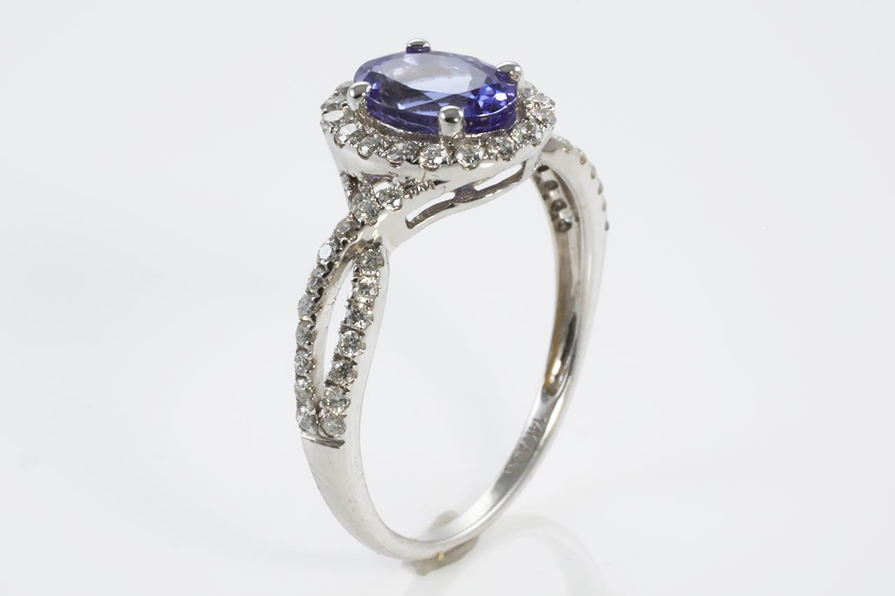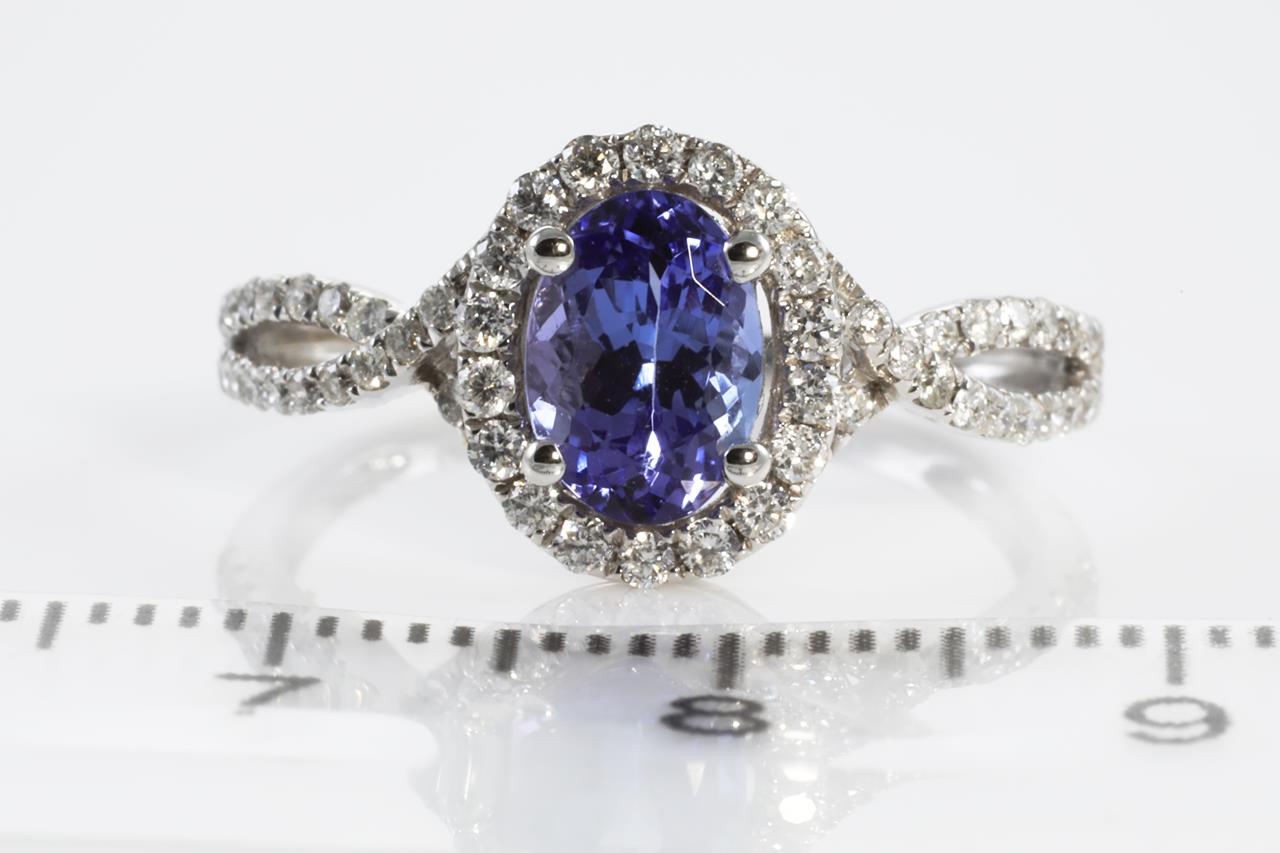 Tanzanite and Diamond ring with an oval Tanzanite of 1.05ct and round Diamonds totalling 0.40cts (Estimated grading: G-H SI-P1). 14ct white gold. Ring size N - Ring resizing is not recommended. Weight: 2.2g (As New).