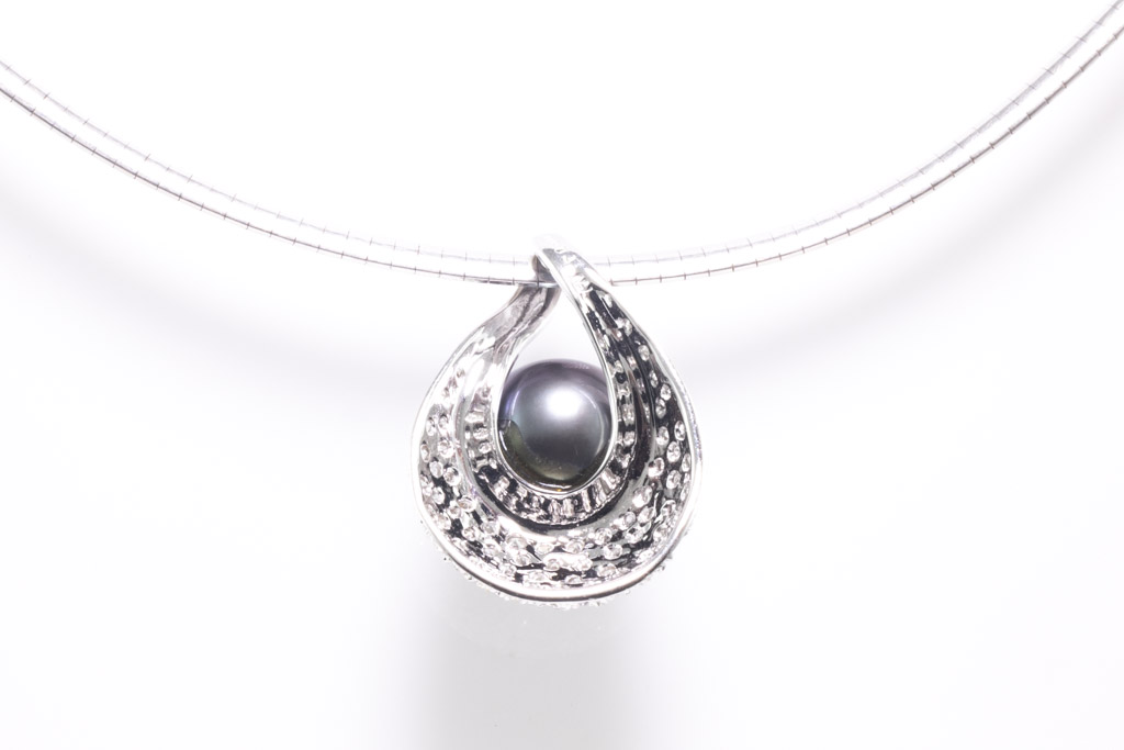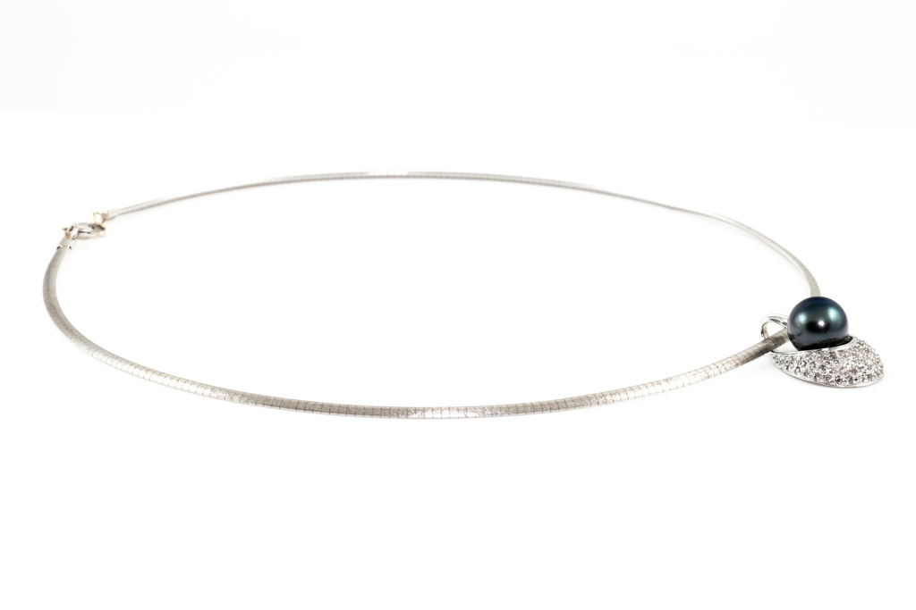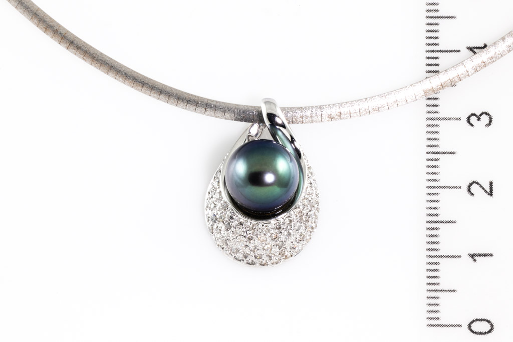 Pearl and Diamond Pendant with Tahitian Pearl of 10.5mm and round Diamonds totalling 0.50cst (Estimated grading: H-I SI-P1). 18ct white gold with 18ct white gold omega chain. Length: 40.5cm. Weight: 17.3g. (Pre-owned)