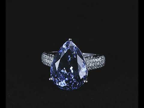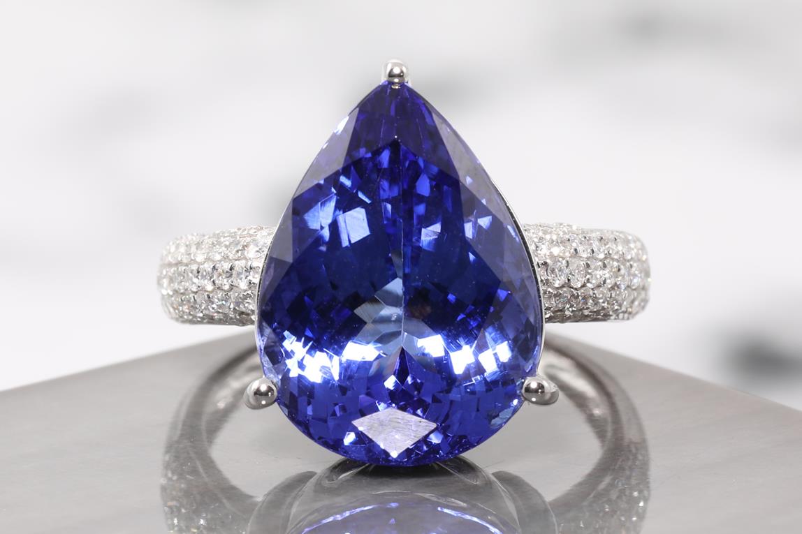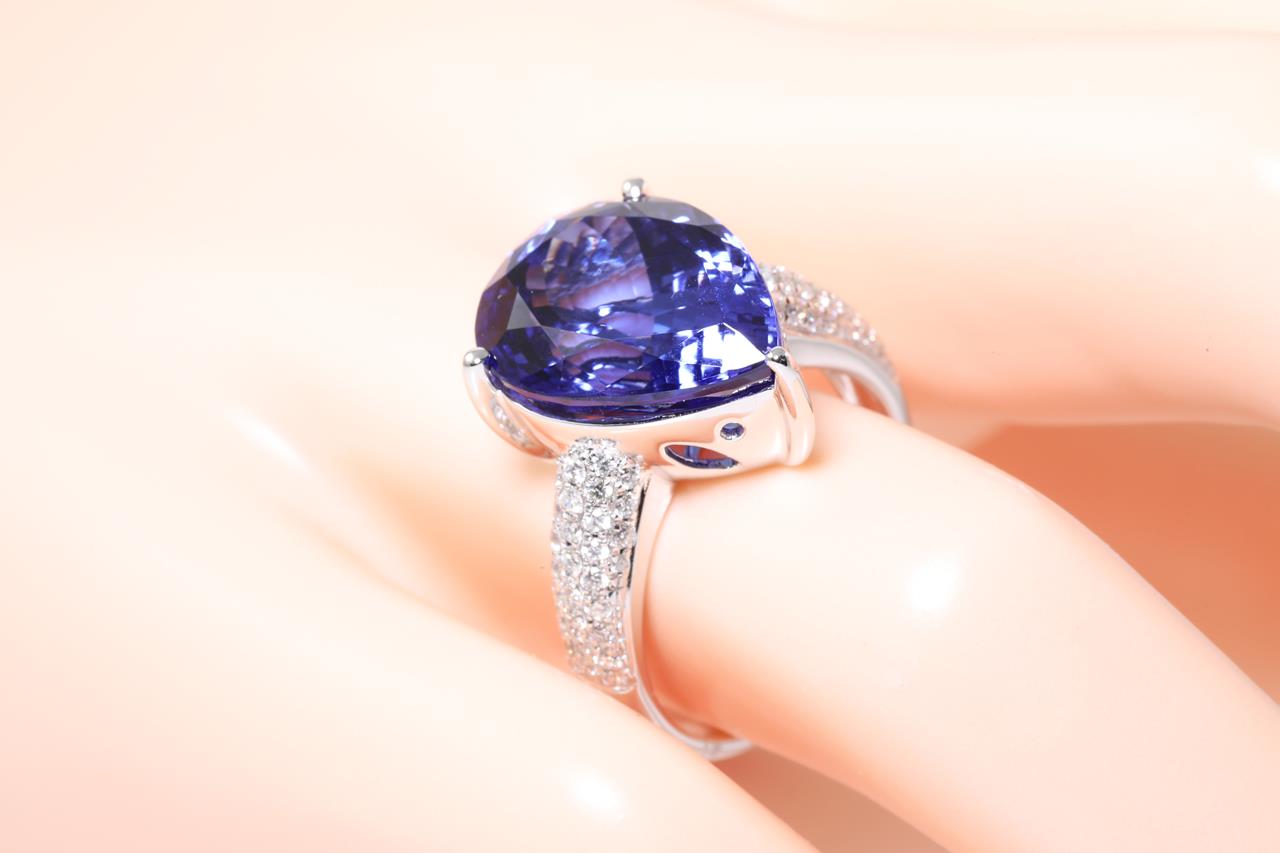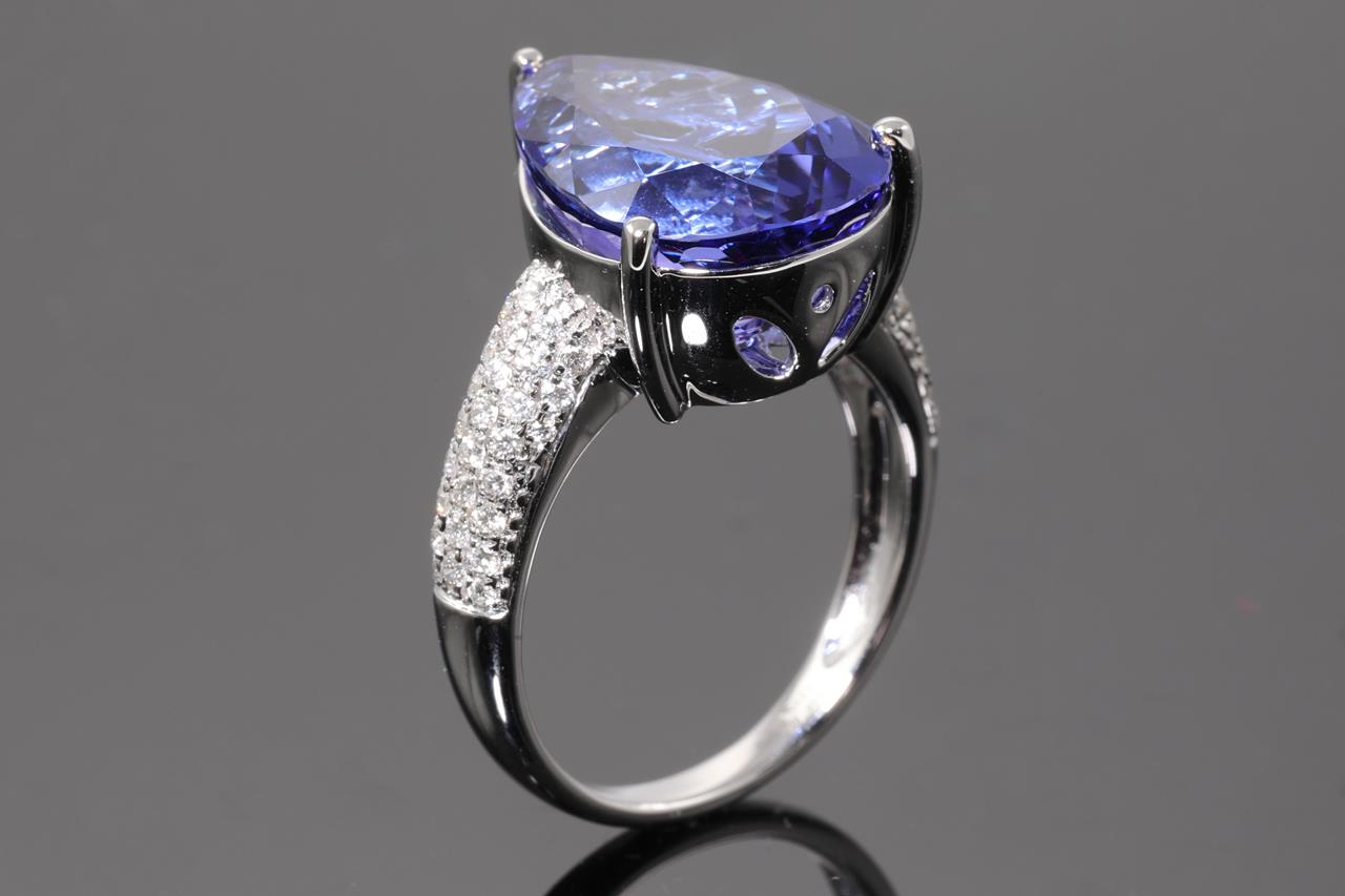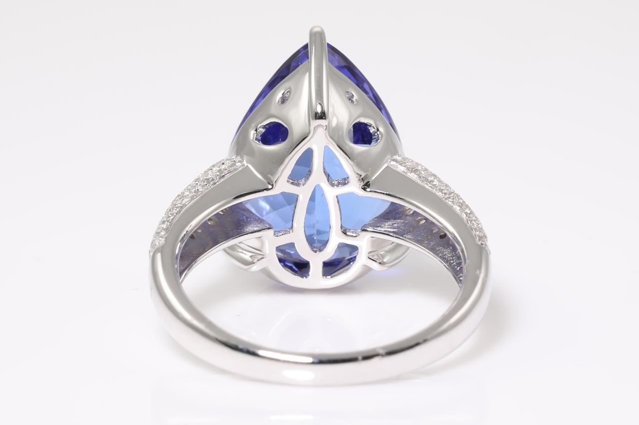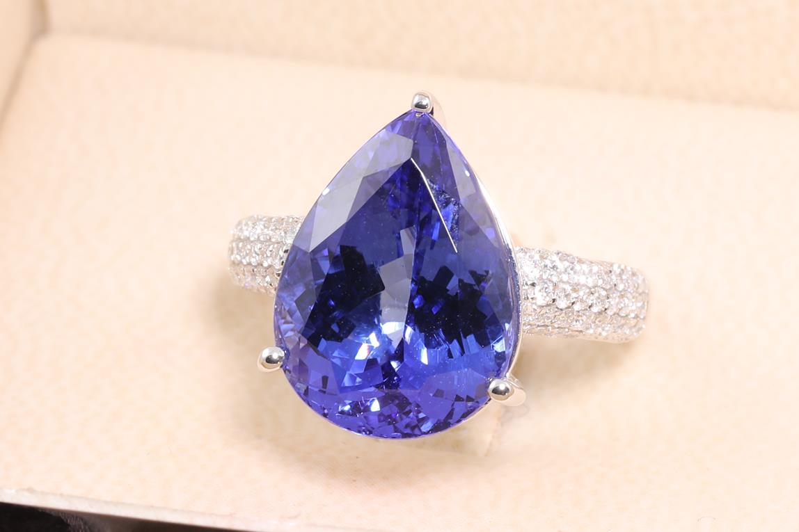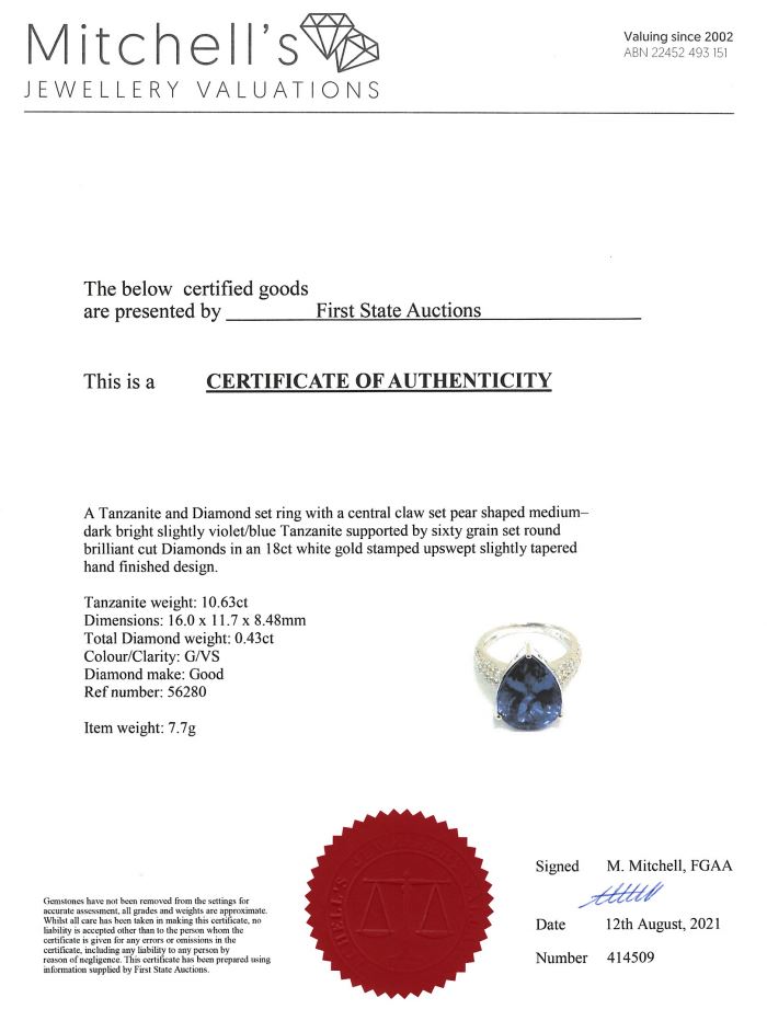 Tanzanite and Diamond ring with a pear cut Tanzanite of 10.63ct and round Diamonds totalling 0.43cts (Estimated grading: G VS). 18ct white gold. Ring size N - ring resizing is not recommended. Weight: 7.7g. With certificate #414509. (As New)