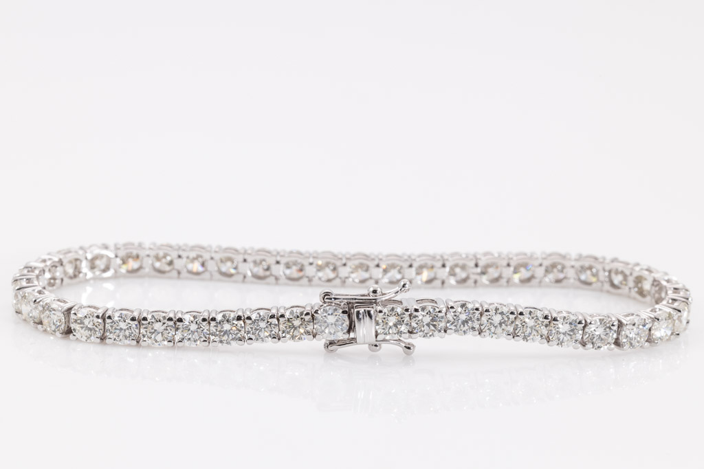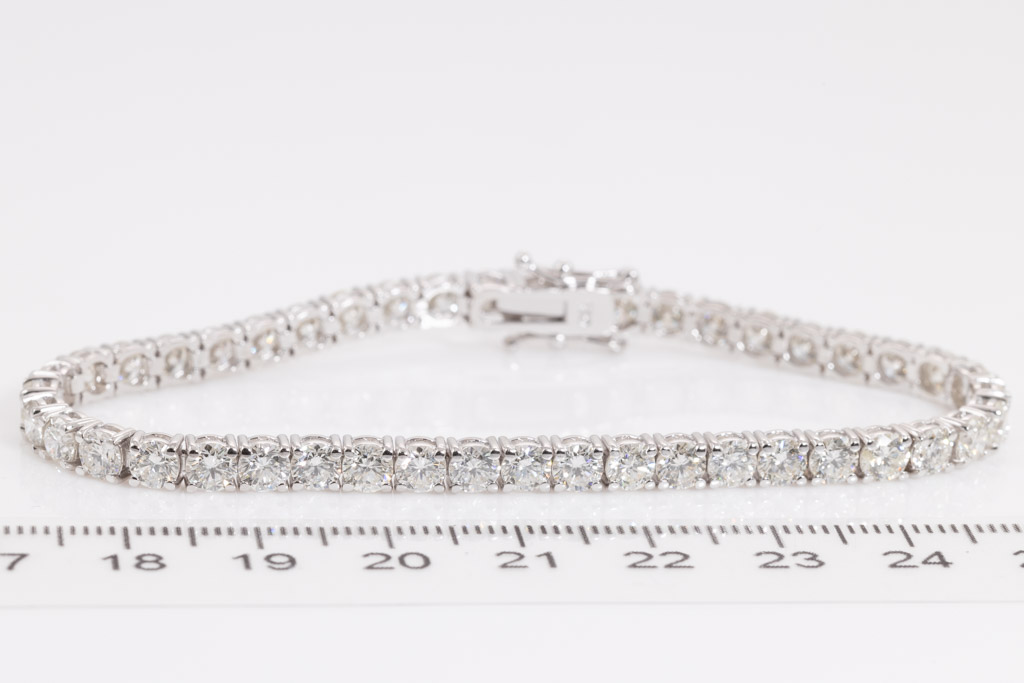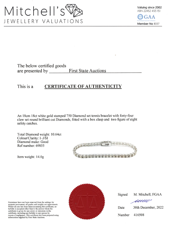 Diamond tennis bracelet with 44 round Diamonds totalling 10.64cts (Estimated grading: I-J SI). 18ct white gold. Length: 18cm. Weight: 14.0g. With certificate #416508. (New)