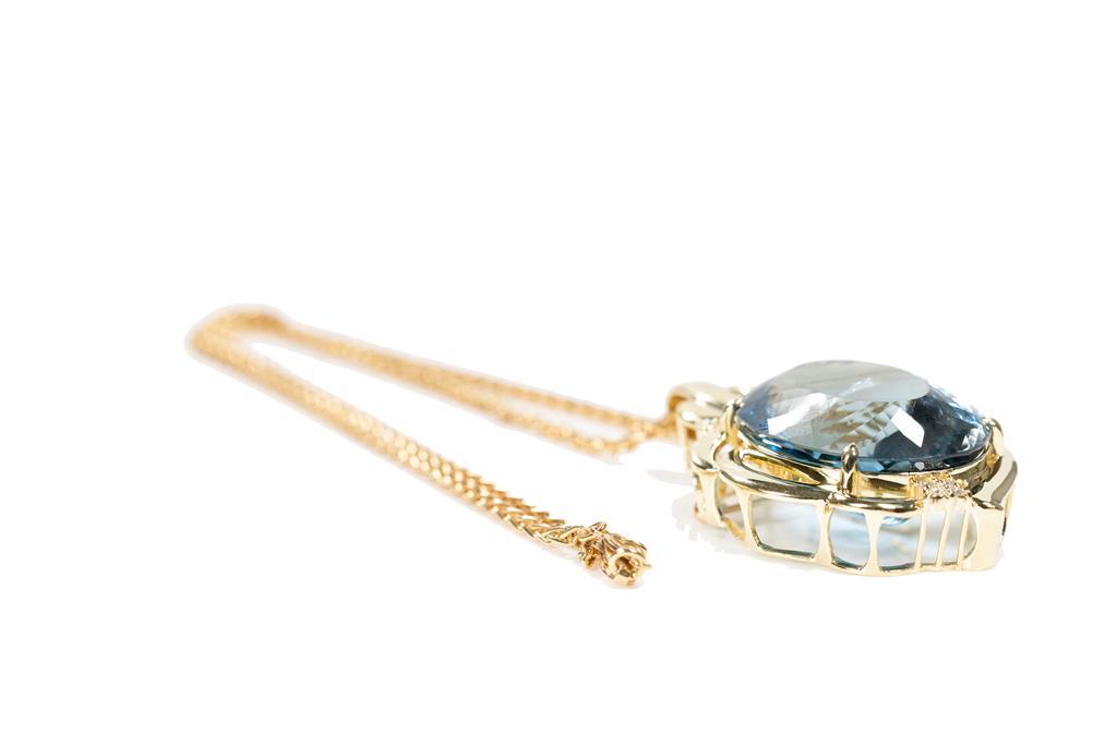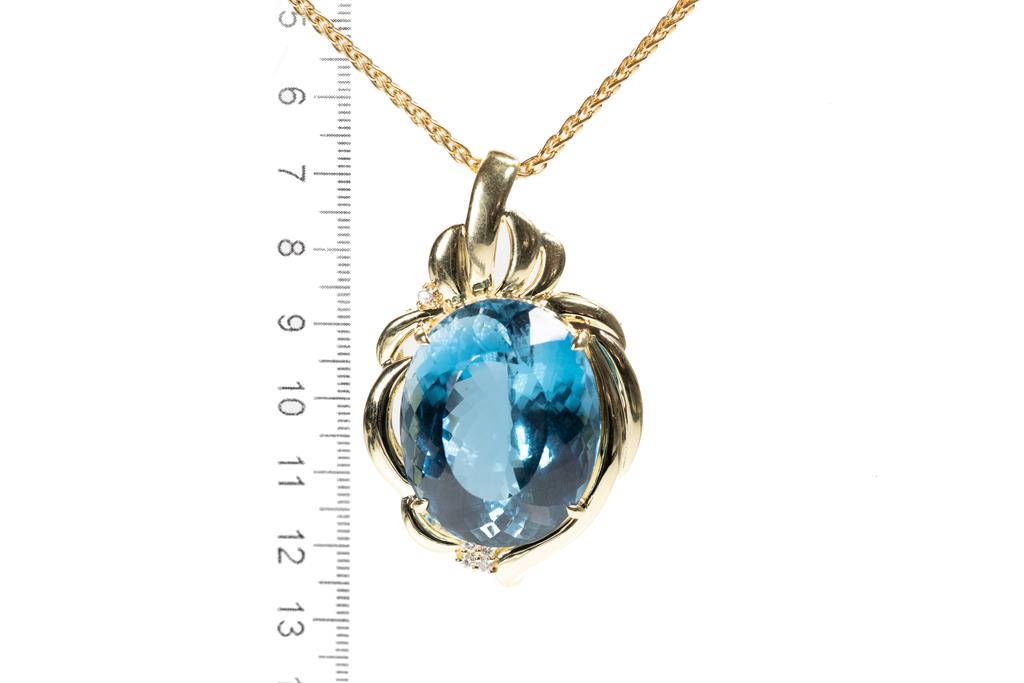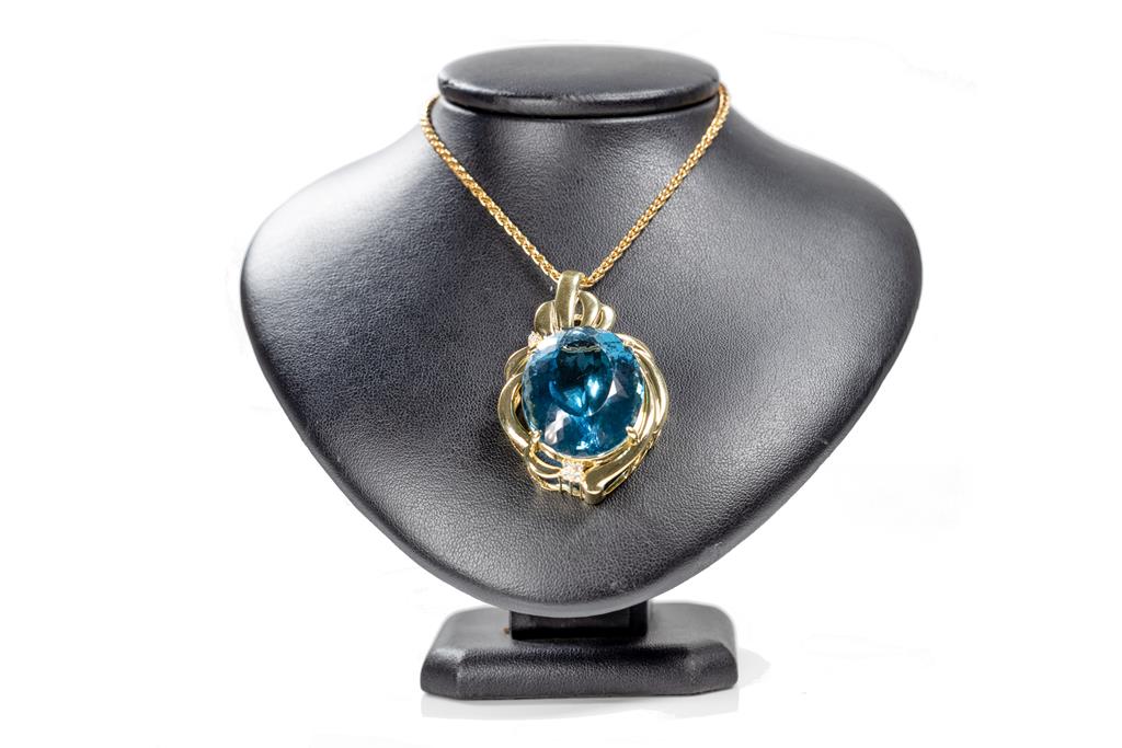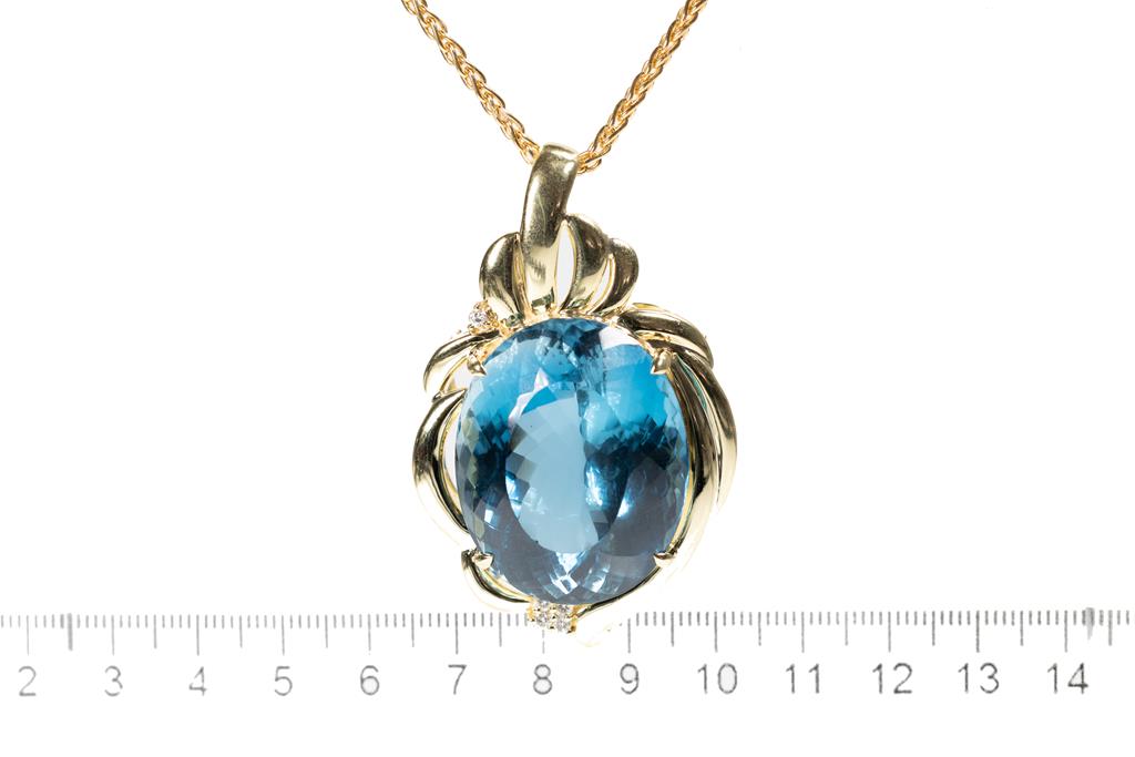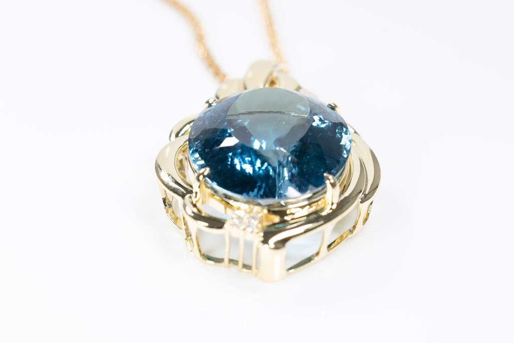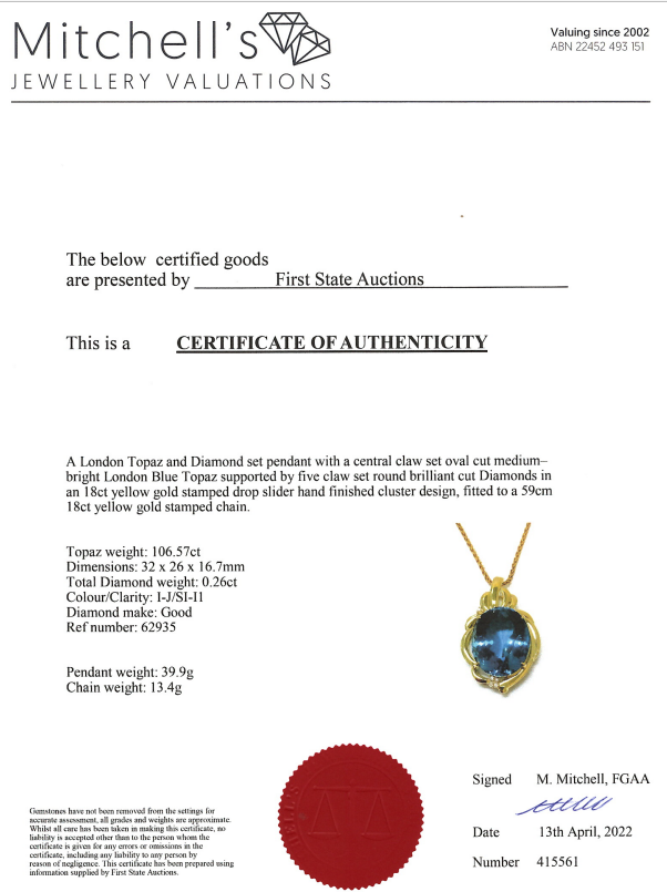 Topaz and Diamond brooch/pendant with an oval shape London Blue Topaz of 106.57ct and round Diamonds totalling 0.26cts. 18ct yellow gold with 59cm 18ct yellow gold chain. Weight: 53.3g. With certificate #415561. (Pre-owned)