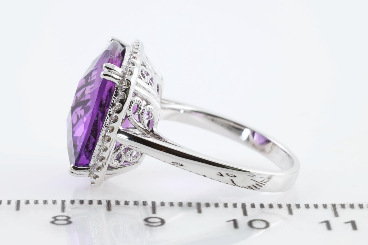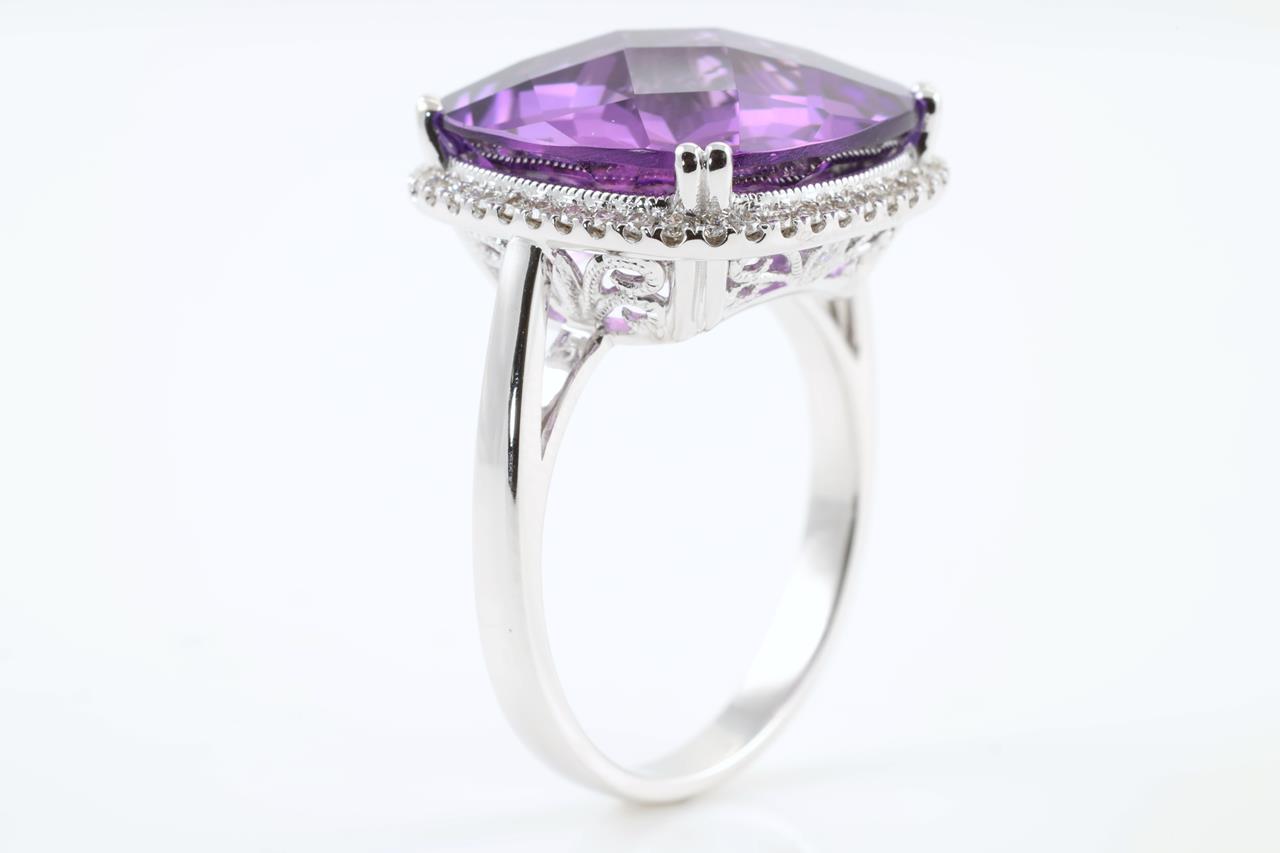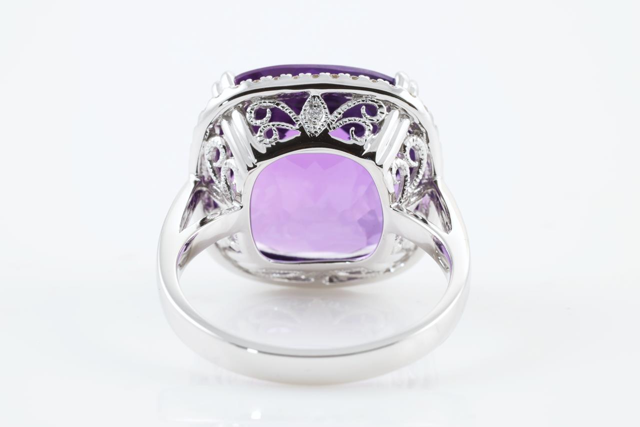 Amethyst and Diamond ring with cushion cut Amethyst of 10.66ct and Diamonds totalling 0.26cts. 14ct White gold. Ring size N1/2. Weight: 6.4g (New)