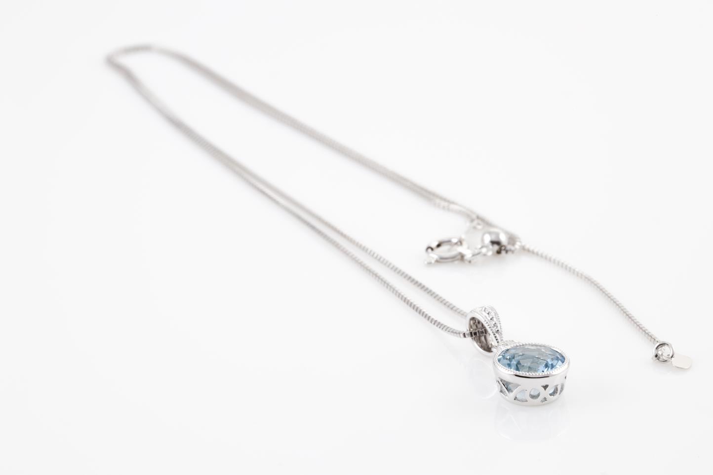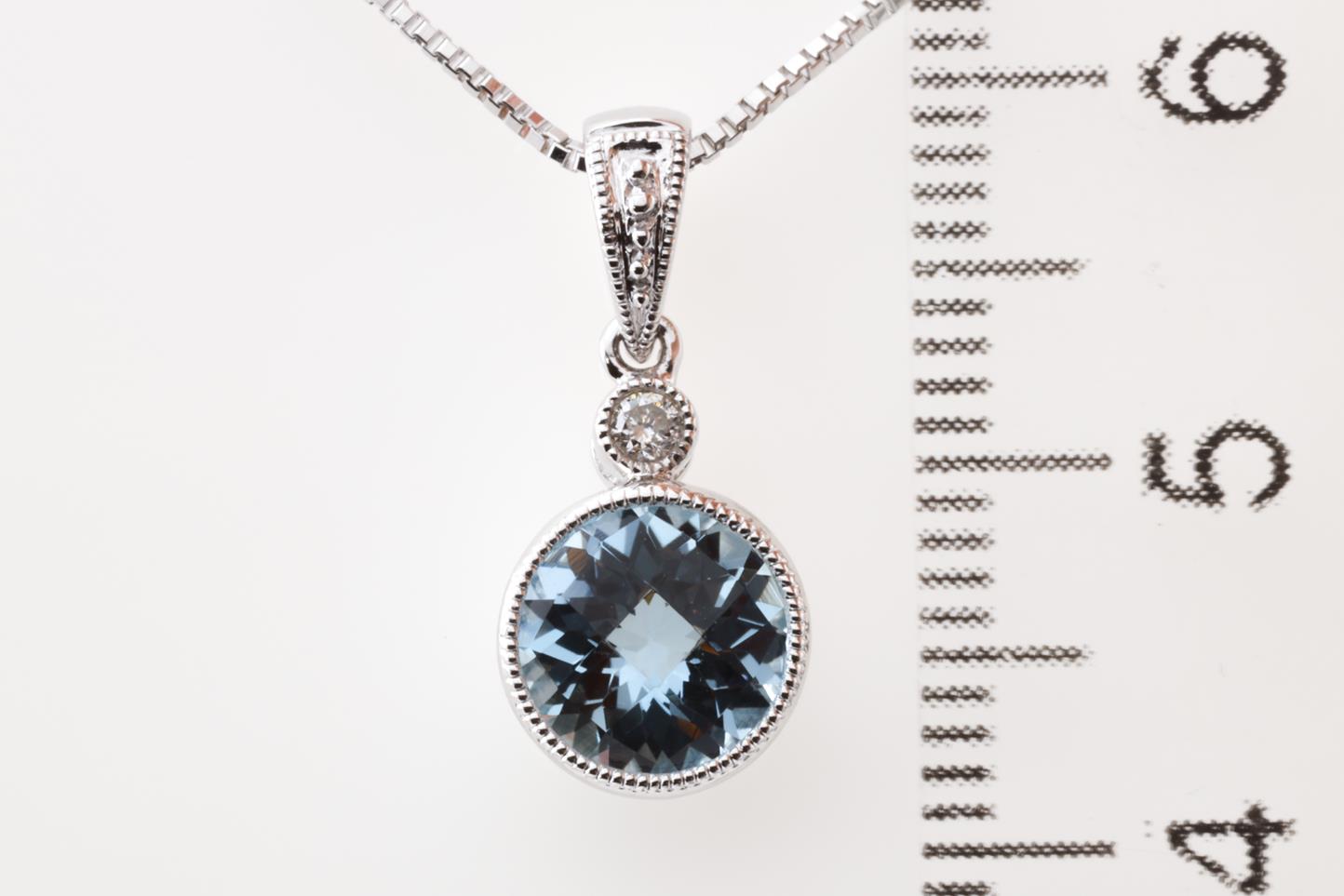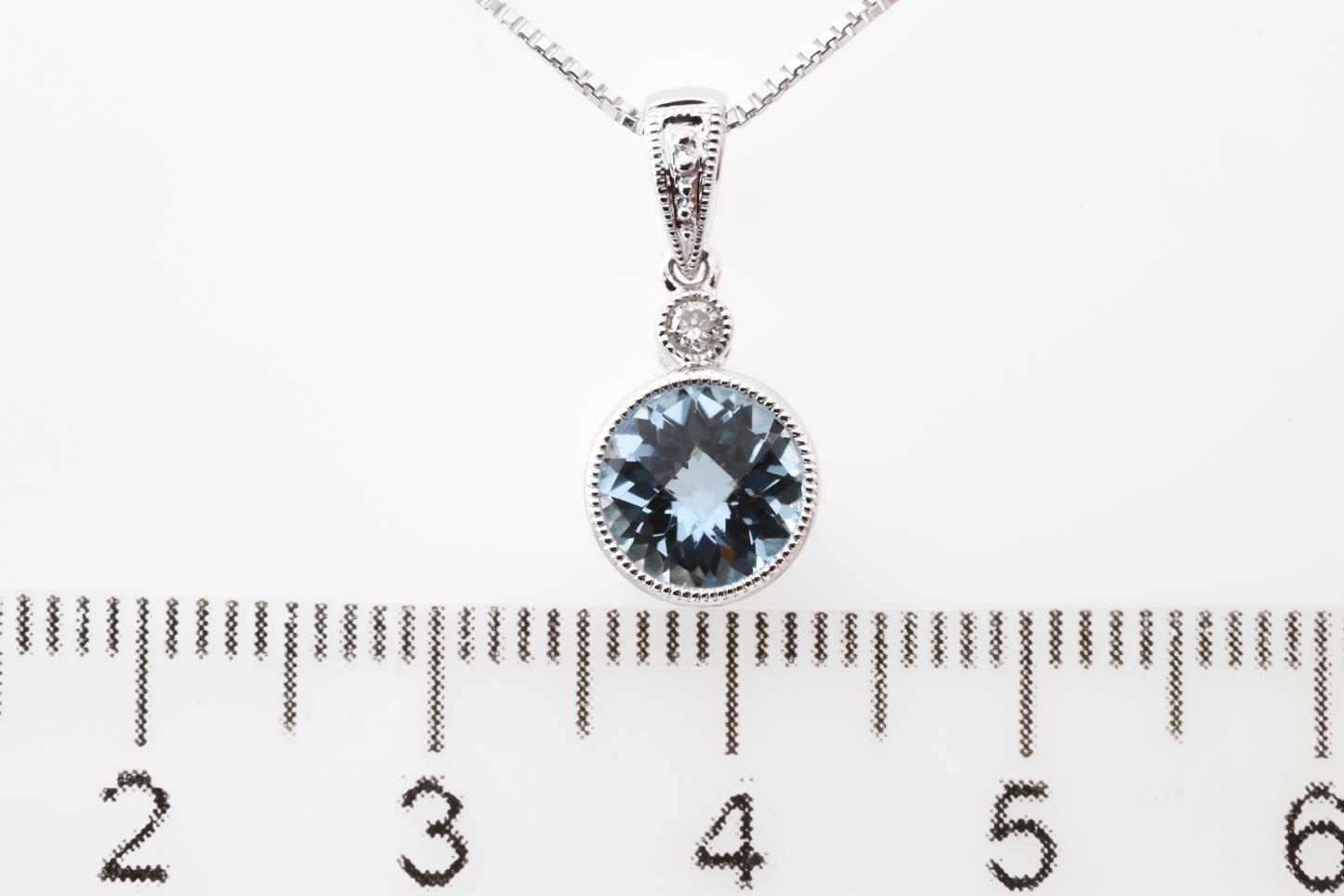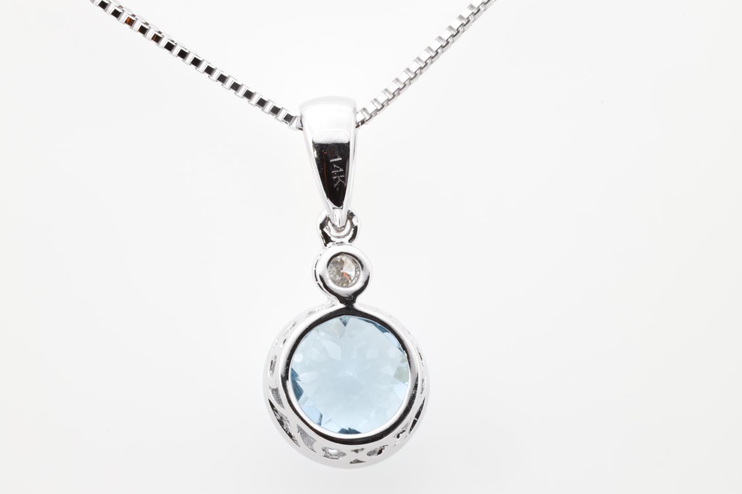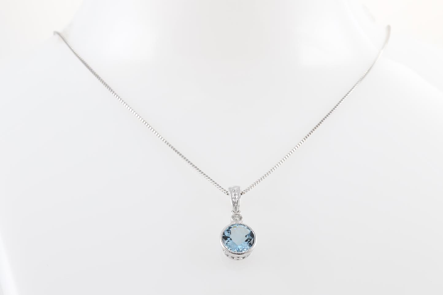 Aquamarine and Diamond pendant with round shape Aquamarine of 1.06ct and Diamonds totalling 0.03cts. 14ct White gold with 18ct gold adjustable 45cm chain. Weight: 2.90g (New)