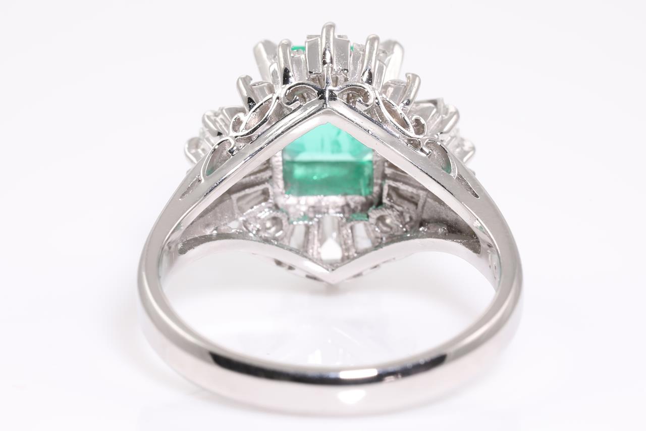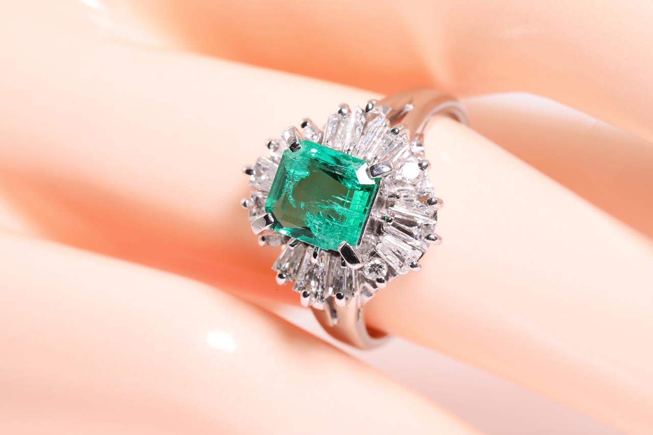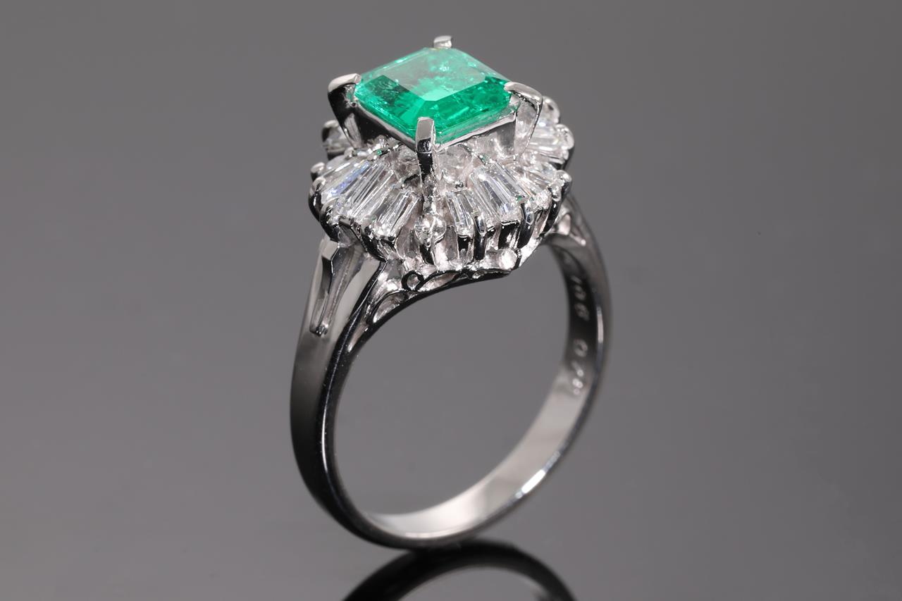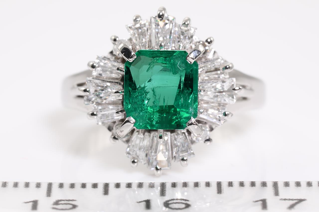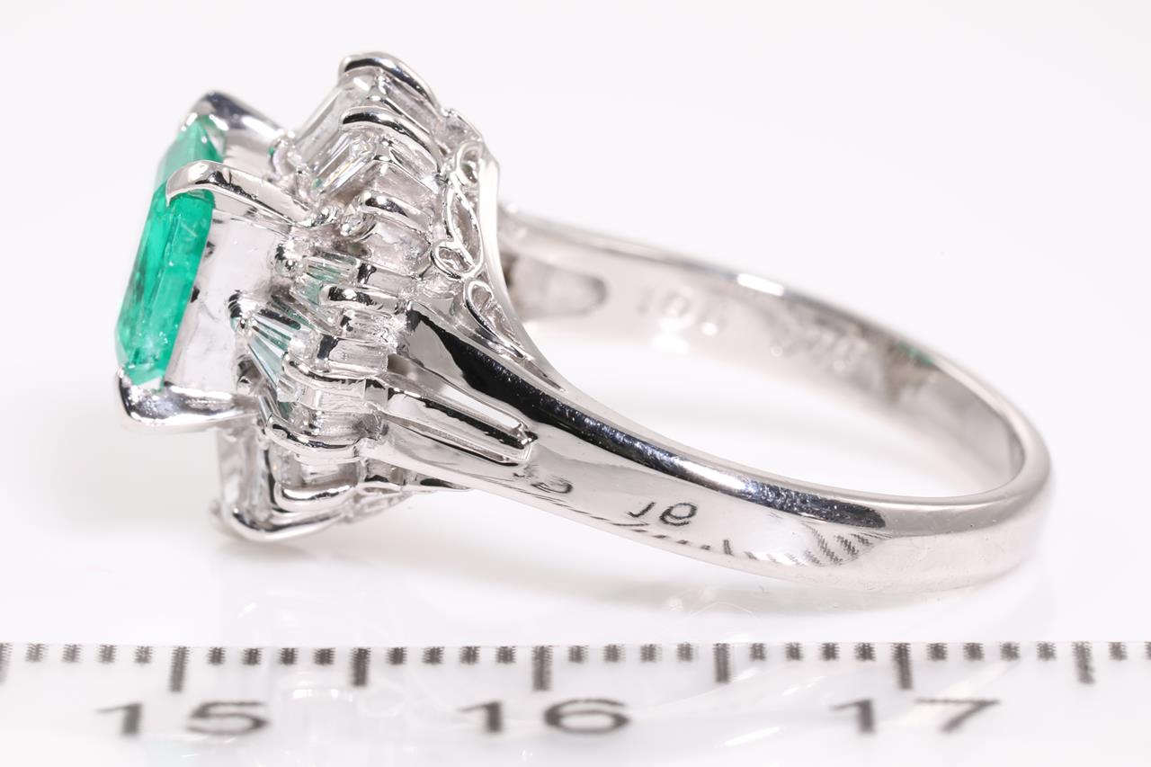 Emerald and Diamond ring with Emerald of 1.06ct (note chip on 1 corner) and Diamonds totalling 0.76cts (Estimated grading: G-H SI). Platinum. Ring size L1/2. Weight: 8.4g (Pre-owed)