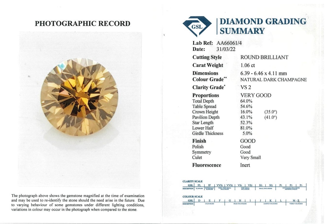 A loose round Diamond of 1.06ct (with GSL Summary Report graded as Natural Dark Champagne VS2 #AA66061/4). (New)