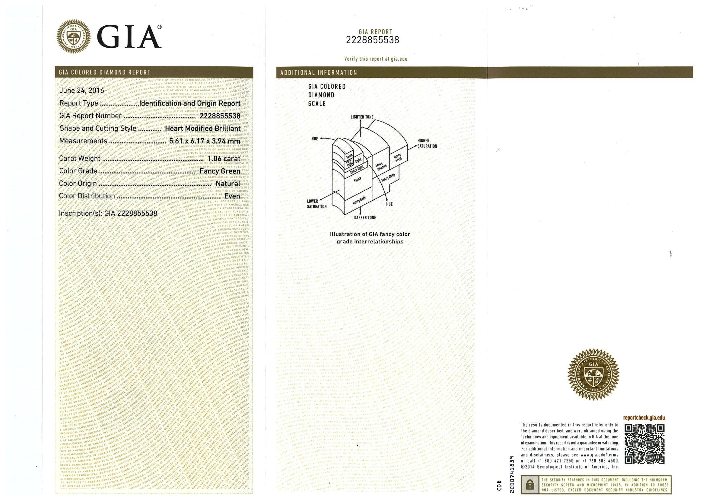 A loose Heart shaped Diamond of 1.06ct (with GIA report graded as Natural Fancy Green Even # 2228855538). (New)