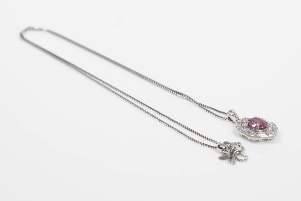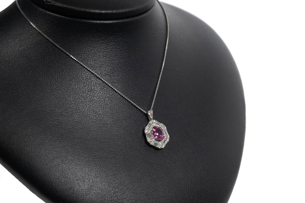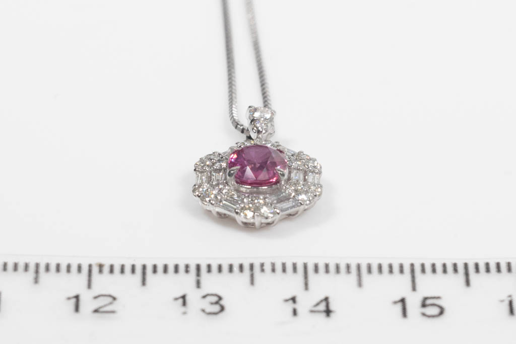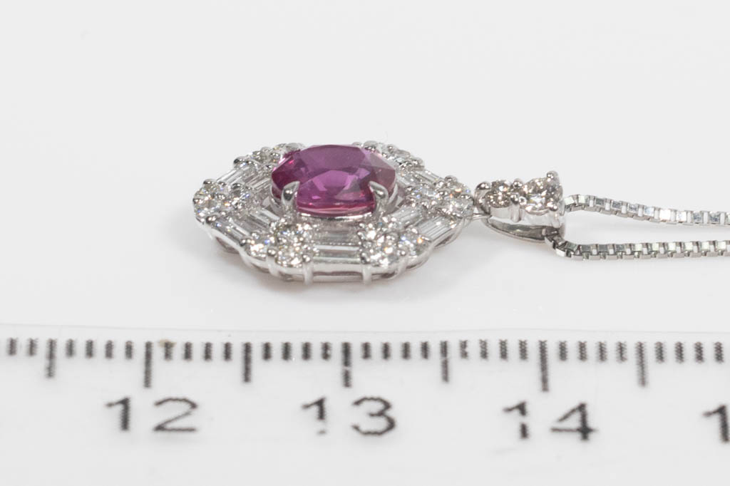 Ruby and Diamond pendant with oval shape Ruby of 1.06ct and round & baguette cut Diamonds totalling 0.65cts (Estimated grading: H-I SI). Platinum with 45cm platinum adjustable chain. Weight: 4.6g. (Pre-owned)
