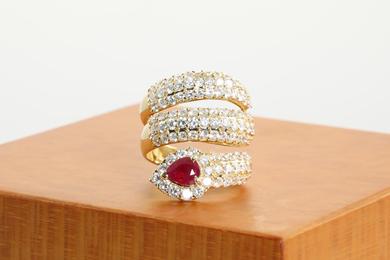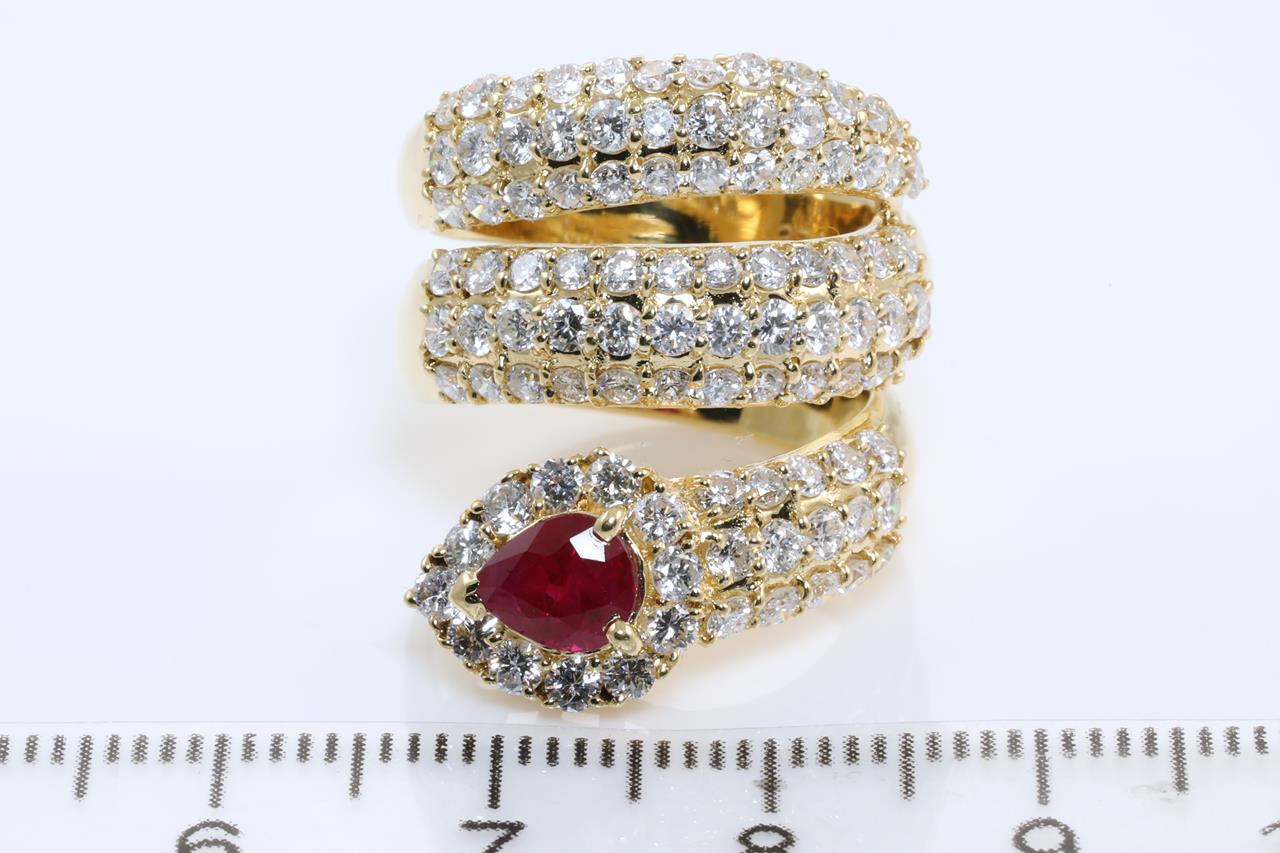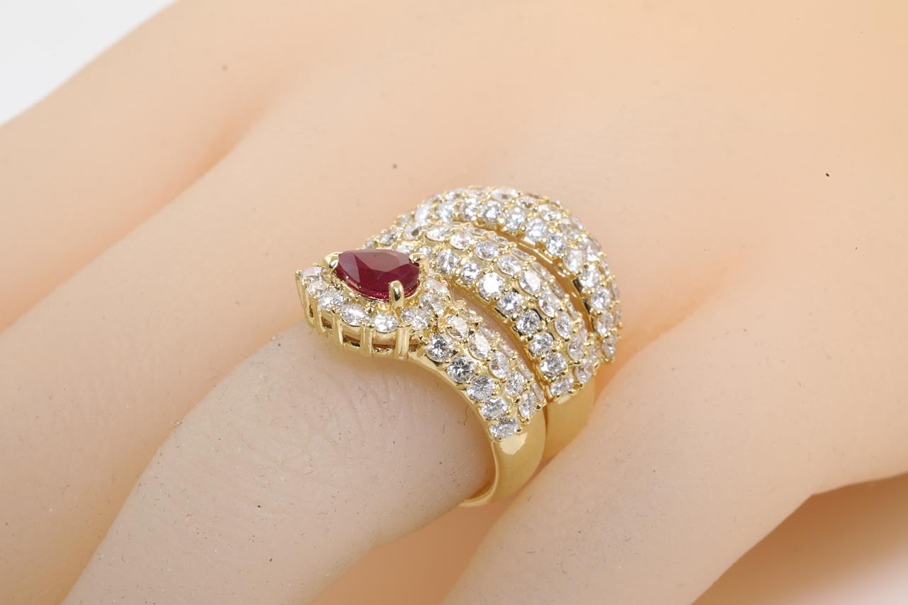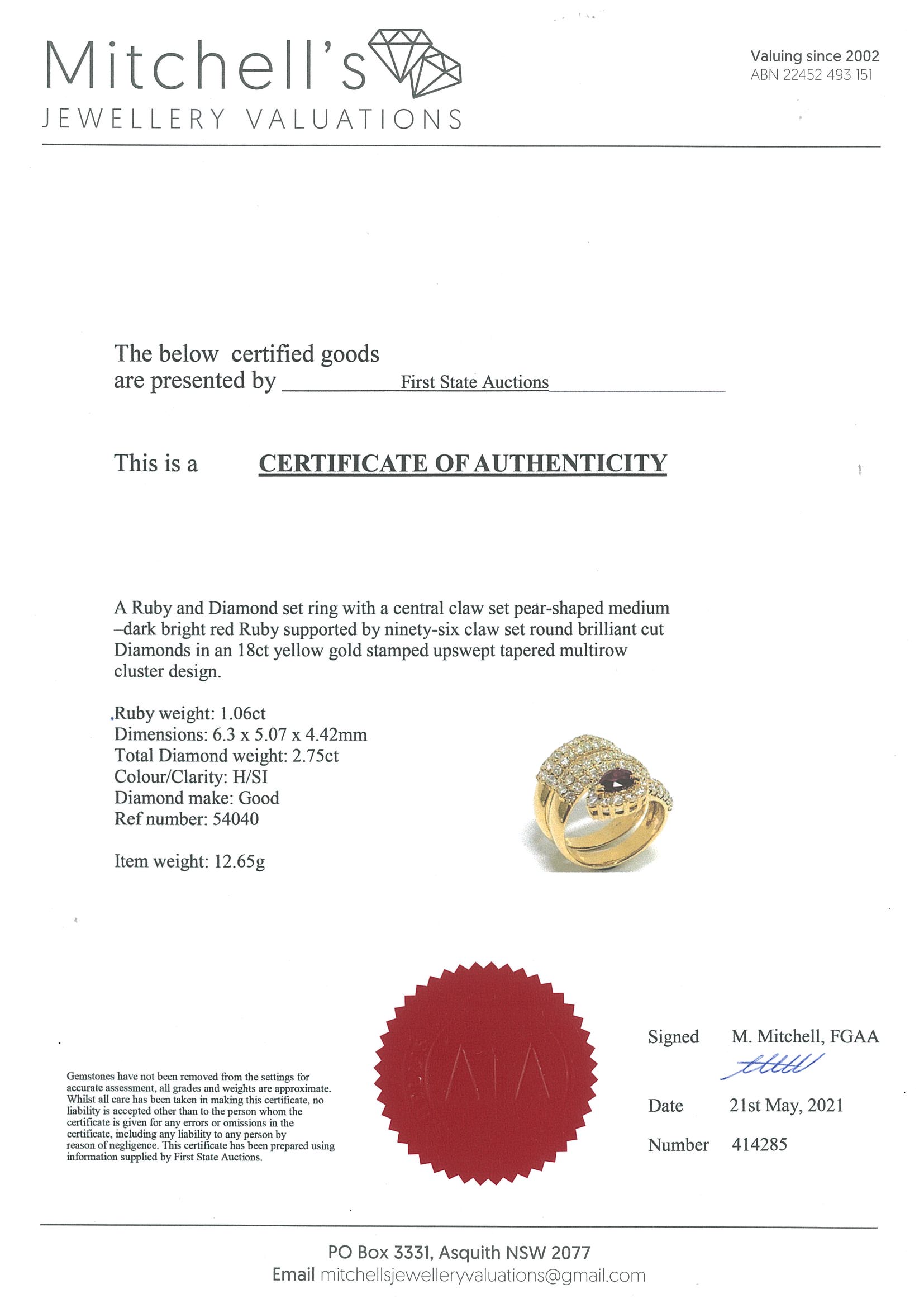 Ruby and Diamond ring with a pear shape Ruby of 1.06ct and Diamonds totalling 2.75cts (Estimated grading: H SI). 18ct yellow gold. Ring size K1/2 - ring resizing is not recommended. Weight: 12.6g. With certificate #414285. (Pre-owned)